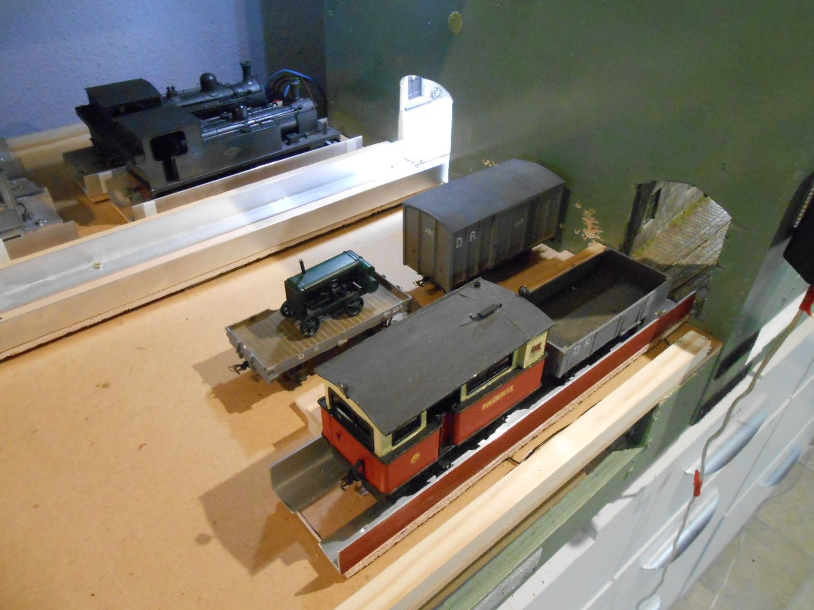 Much time has been spent this week fine tuning the cassettes and fiddle yard table. Above you can see the five trains, spare engine, plus Phoenix and its wagon cassette. I was expecting a bit of work because experience with Fintonagh taught me that if the back to backs are more than 0.2mm out, then derailments are possible on the points and so it proved. Horizontal alignment is achieved by glueing plasticard strip to the vertical wall of each cassette. Mostly this has been 40 thou/one millimetre thickness, but occasionally, only 20 thou has been needed and in one case 60 thou [20+40]. Vertical alignment is really just careful filing of the fixing screws. Occasionally, I found I'd taken too much off and a fresh screw was needed. Also managed to fix one or two screws too far inboard, meaning bogies, axle boxes etc could clout them. Needless to say, this brought out more than a bit of creative bad language, but only myself to blame. Quickly realised that a different cassette was going to be needed - one without any sides to make railing stock easier. Narrow gauge vehicles are hard enough at the best of times, with their wide overhangs, but the cassette sides make putting on anything other than a four wheel vehicle pretty much impossible. My simple solution was to stick 60 x 100 plastic strip to a piece of plywood that has flat aluminium strip glued underneath. White plastic works well with dark wheels too. Though there is plenty of room on the cassette table, have found a piece of plywood pushed under the outer end of the table gives space to put a loco cassette while it is being turned. Doubles up as space for a coffee mug and nicely levels the cassette table too. An important safety item is this small block of wood, just beyond the end of where the main cassette goes - just in case a train should over run. The height is just right for the DG couplings to clear it. A couple of other pictures show how the train cassettes might be shuffled around. Otherwise, so far so good. Now need to work on rehearsing operation on the layout itself, while all the new couplings need to be checked and then chemically blackened.