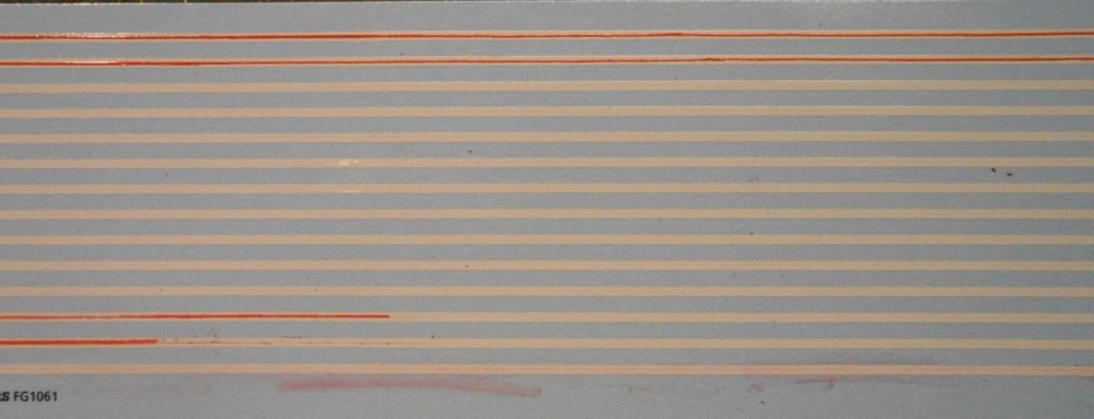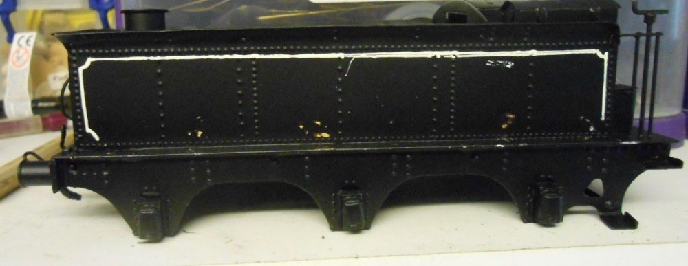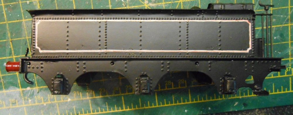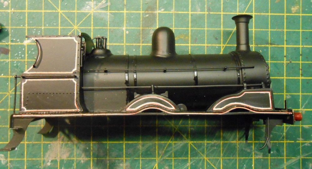 Paintshop I'm starting to think that painting the 101 could take as long as building it. First comes the 'witness coat', in this case red primer, which [mostly] shows where all the holes and excess solder are that you thought you'd cleaned up beforehand. Once these have been filled and scraped/filed/sanded down, on goes another spray of primer, and then, like as not, you find some more and have to go through the process again. It's a real test of patience... When that is done, there is a wait of 24 hours before the top coat can be sprayed on - in this case matt black, then another overnight wait for that to harden too. Having built over 60 locos, all the above is second nature, but not the next bit! All my locos have been in 1950/60s livery in the past - black, with varying degrees of weathering, which can cover a multitude of sins. The 101 is going to be in almost 'as new' condition, which means lining, for which, as far as I can tell, no transfers exist, so from now on it is a very steep learning curve. Thanks first to Eoin, for reminding me of my copy of Ian Rathbone's book on painting and lining. Have used it a lot, but had never read the lining chapters, until now, but they are very helpful, even if the results Mr Rathbone achieves are more than a bit intimidating. Just look at those cover photos - hand lined, with a bow pen and fine brush! So treated myself to a bow pen, bought some new fine marker pens, enamel and acrylic paints to go with my R L Moore lining pen and set about doing a bit of practicing. I also bought some plain white lining from Fox Transfers, to form the basis of the boiler bands. Having earlier sprayed a piece of plasticard black, I tried various ways of lining. Jonathan Beaumont kindly provided me help in the form of photos of one of Fry's locos, however I have to admit I've chickened out of trying to replicate it, because [for now at least], it is well beyond my skills and tools. Check out the boiler bands - white/black/red/black/red/black/white! Ok, so the white lines are outside the boiler band itself, but there is now way I can get a black line thin enough to go in the middle of the red one. So, what I'm attempting is a simplified white line, with a thinner red one down the middle. Hence the white transfers. Using red acrylic, I've managed to draw a red line down the centre, which hopefully will look ok once I've made the lining thinner. The next picture shows my first attempt at doing a white line on the tender. Not good! However, using white acrylic means that it can be tidied up by using a combination of scraping paint away with a cocktail stick and touching up with a fine, 3/0, brush. The corners were brushed in by hand and tidied as before, then once the paint had hardened, I then drew a thin red line down the middle of the white one. The loco body has had the same treatment, but all those curves are proving really challenging. The splashers and valances aren't too bad, because there is beading to follow, for the white line at least, but it is far from perfect. I've stuck with the bow pen, as the Moore one is designed for neat Humbrol. For me, a big issue is that the red is not drying dark enough. The actual colours, according to 'Steaming Through Three Centuries' should be vermillion, bordered with white. However, white looks far too bright against the dark black, so am using ivory instead. Vermillion is bright red, but on top of the ivory has a rather pinkish tone, so am looking to darken it somewhat. I think the real problem is I haven't been able to do the lines at scale width [they are very fine on the prototype], so probably need to invest in a better quality bow pen to achieve that. On the other hand, the lining is as fine, if not a little bit finer, compared to what Richard Chown achieved on Shannon, so at the moment, this is what I'm aiming for. It remains very much 'work in progress' though and until I've got all the lining on, plus numbers etc, I'm not sure whether it will overall look good enough. PS, as I feared, the phots have uploaded is the wrong order, but hopefully you can work out the correct one.
