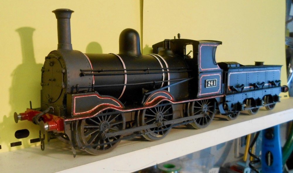 Getting there, at last Much of the last week has been spent on fettling the lining. In the end, I went back to enamels and persevered until I got a suitable 'double cream' thickness, as recommended in Ian Rathbone's book. My cheap [£12] bowpen can do reasonably fine lines with practice, but the key to success is the tidying up technique in the book. Essentially, one waits a couple of hours, then use a fine brush, dipped in thinners to ease away any imperfections in the drawn lines. Tedious, but effective & surprisingly therapeutic once you get into it. The trouble is that, every time you stop for a few minutes, when you look again, you see ever more imperfections. However, the lining is now looking better than it was and is probably at the limit of my current pen. I put in the white line first, then after letting it harden for 24 hours, did the red line inside it. There should be a further red line a millimetre or so inside the first one, but have chickened out of that for now. Corners were done freehand with a fine brush and tidied up as before. Other work has included: Painting the buffer beams red - though I now fear the tender one should be black Adding the vacuum and steam heating hoses [Slaters] Brush painting the smokebox/chimney a very dark grey Tidying up the cab. Things like scraping paint off the copper pipework and brass gauges, then adding the cab roof Fixing the outside brake rodding Fitting the tender springs above the footplate Making & fitting the two number plates Adding balance weights to the wheels lining the boiler bands The last mentioned was a bit of a faff - as first I had to draw a thin red line down the centre of some white lining transfer strips, then [with much cussing and swearing], persuade the strip to go round the boiler & inside all the pipework, splashers etc. There are still a few things to do, not least fix the crew and put some coal in the tender. Made a fall plate this afternoon, which still needs painting & fitting, while the loco number needs to go on the buffer beam. My best guess is that this should be in shaded gold or yellow. Having never thrown away a transfer sheet, you'd think I'd have something suitable. But no. Some Midland Railway coach lettering is about right, but there are only 1s and 3s, which is a bit of a bummer. Given the cost of a lettering sheet will exceed £10, I may well do the letters by hand. So, there we are - getting there, but even as I tick one more thing off the list, I notice something else: like this afternoon that there is no link between the tender brake standard and the operating rods below the footplate. In practice, a short piece of 1mm wire, but it will still need blackening & painting, so there's another half required. Life is complicated, which is why it's fun, as they say. -