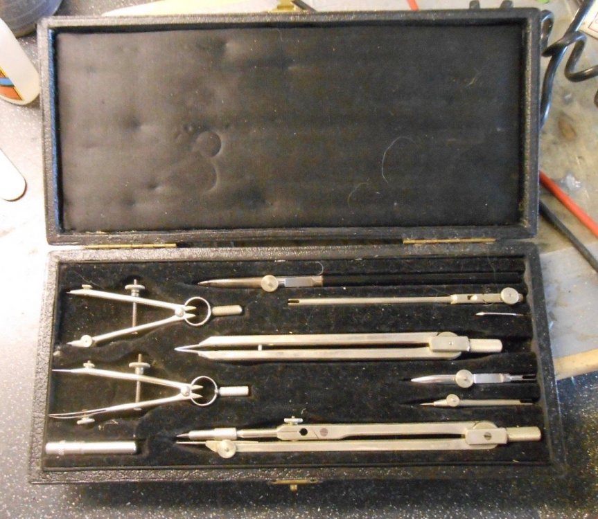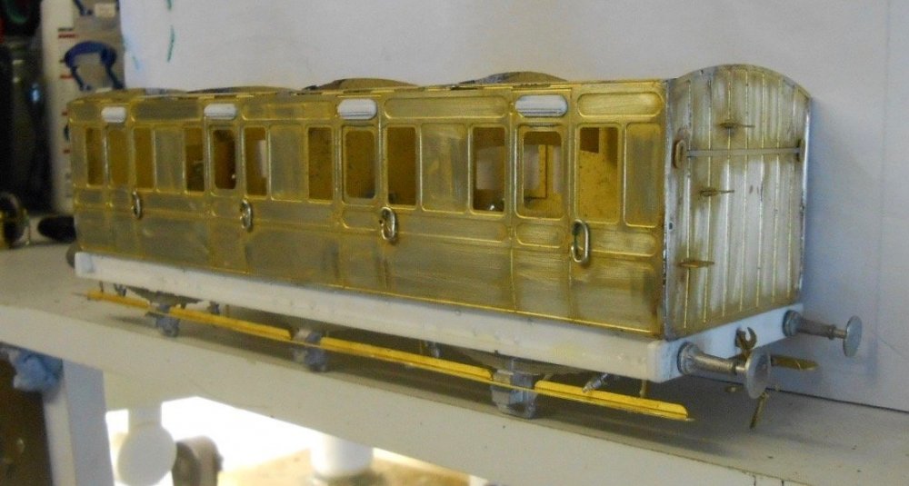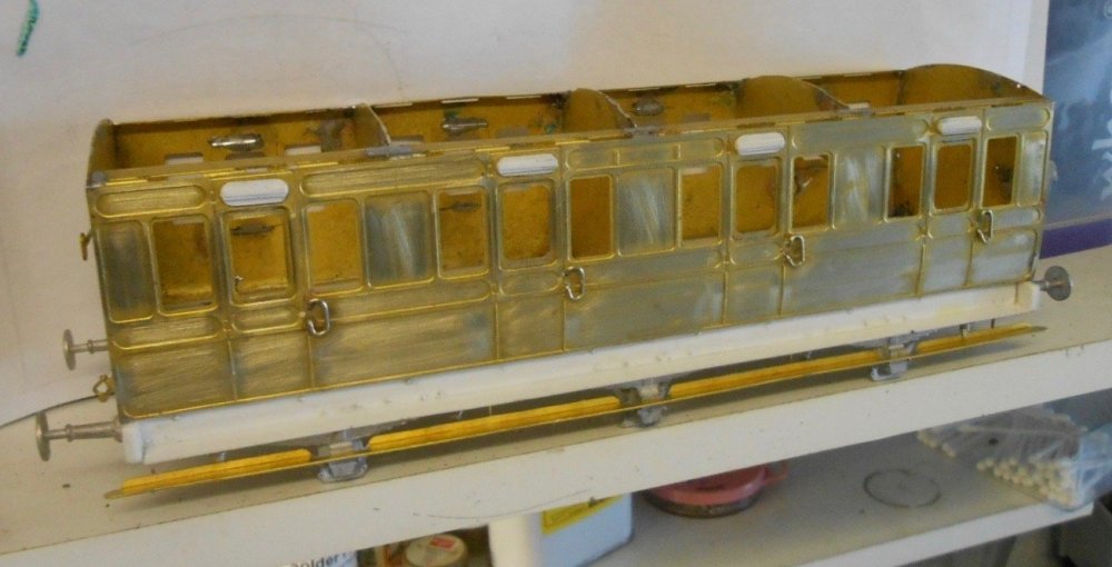 Was sure I'd posted that what Eoin has created is his own version of the R L Moore lining pen, but doesn't seem to be here. A clever idea, nevertheless. First picture is of the drawing set I found on a general stall at a local antiques fair. Don't often attend these, but have been on the look out recently, just in case, as such things are not readily available anymore in these days of computer aided design. The set, in its original box [sadly no maker's name], was on sale for £28, but in best 'Bargain Hunt' tradition [you can see how I spend my lunchtimes], I offered the lady a £20 note, which was accepted. Given my second hand bow pen cost me £12 on its own, this set looks an absolute bargain and the bow pen that is part of it looks better quality too. The other pictures are of an Alphagraphix GSWR six wheeler. It is the 'sleeper' coach, which has a clerestory roof, but I have left this out and am building it as one of the '300' series 4 compartment firsts. I picked up the model partly finished as part of bits left over from the Richard Chown estate. He had made the body shell, but when I opened the box though all the castings were present, the sole bars, buffer beams and Cleminson chassis were missing. However, there were several other bags of bits which should prove useful [castings and etches]. Having built more than a few coaches in my time, making up solerbars, floor etc wasn't a problem, so I ordered a Cleminson unit from Alphagraphix. This is a really clever design that works just as well in standard as broad gauge. There are white metal castings for buffers, springs, etc, but you have to make the ventilators yourself and also the grab handles for the doors. These are an especially fiendish item, each requiring no less than six bends; I also need to buy some more door handles. Otherwise, the model is ready for the paint shops am hoping to find a car spray paint to match the GSWR 'dark lake'. Black and white photos appear to suggest that ends were the same colour as the sides - if not, am hoping JHB can put me right!