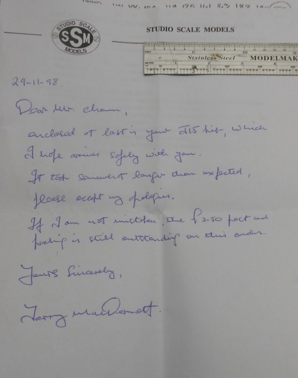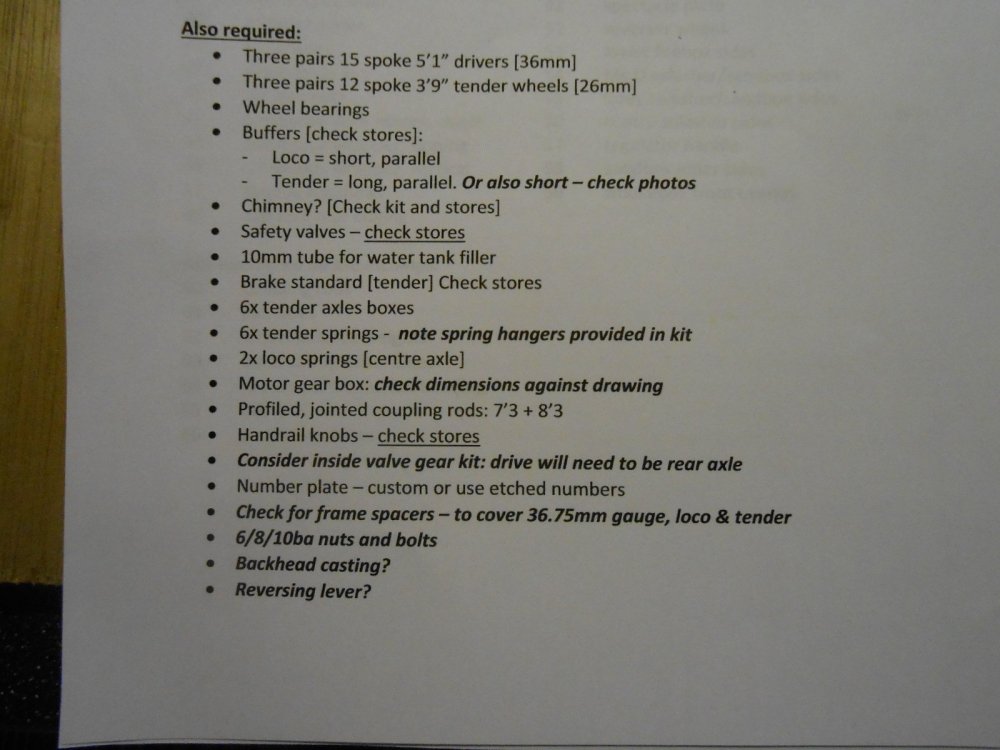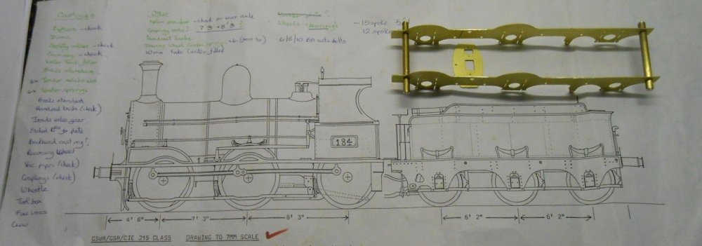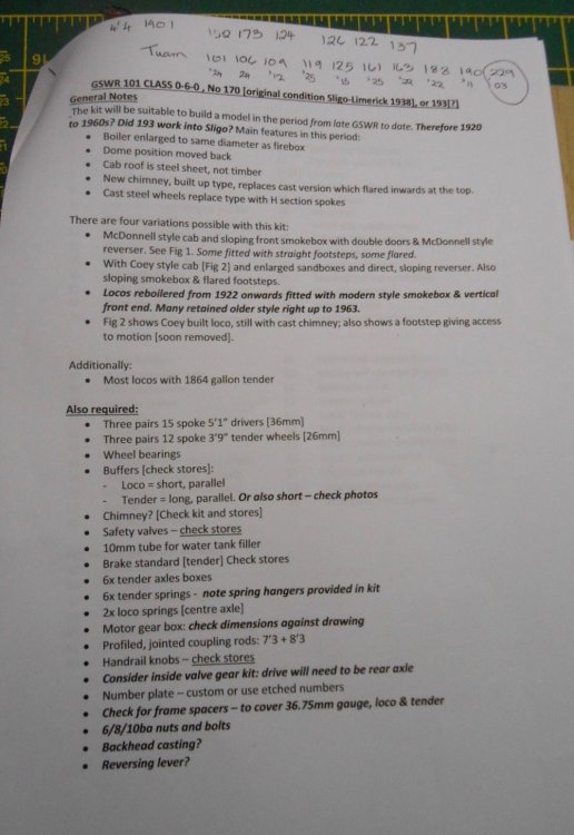 What, another J15? Well, yes - so sorry about that. A bit like buses, none for ages, then several come along at once. I must admit that a 101/J15 was not on my radar, as they never appeared on the SLNCR and my proposed branch to Arigna Town has been, thus far, a joint line with the MGW. However, acquiring Richard's 0-6-0 Shannon set me thinking. Arigna's fiddle yard is full, but what about back dating things, to do two distinct periods? At home, I can run what I like of course, but it is not unusual at shows to see layouts that will change, say, from steam to diesel - either half way through a day, or on separate days for a weekend show. Hence, when the chance came at Telford, back in September, to buy an unmade TDM kit of a 101/J15, it was an opportunity I wasn't going to refuse. The plan is to model trains around the turn of the century. Shannon was built in 1900/01 as is resplendent in WL&WR lined black. The GSWR took over the WLW in 1901, so my 101 will be in lined black livery and with the MGW also working into Sligo, the opportunity for all three companies' locos to appear alongside each other is far from impossible, though how that will eventually come about, you'll have to wait and see! Given that I've had the kit for a couple of months, why wait until now to start it - after all I'm not one to leave such things on the shelf? It all revolves around what was in the box, which included a letter from Terry McDermott [of TDM Models/Studio Scale] apologising to Richard for the delay in supplying the kit. The letter [see below] was dated 29th November 1998, so it seemed appropriate to make a start on the 20th anniversary of it being posted. I presume the kit was photo-etched and therefore is a blown up version of the ones currently being shared elsewhere on the Forum. Good news for me, because I have all that expertise to lean on - including the history of these locos, so many thanks to all concerned. It is interesting to ponder just why Richard never got round to building the kit and why it stayed unopened for 18 years, until his death in July 2016? Was he busy with one of his many other projects? I can't imagine a modeller as resourceful as him would have been put off by the need for extra components, so perhaps we will never know. Anyway, today I have made what is more of a token gesture in starting the kit, by cutting out the frames and using some 4mm brass rod as temporary spacers. Hopefully, after Saturday, I will have most of the key components I need to get started properly. Saturday is the Reading 0 Gauge Trade Show, a splendid gathering of major and minor traders, where I should get what I need. The kit doesn't actually contain any frame spacers. In the 4mm version, brass rod is used. I am planning to make my own from brass sheet and along with various brake rods, this should ensure a rather flimsy pair of frames become properly solid. I haven't decided yet whether to add springing - partly because none of my other locos have it, but also because I'm not yet sure about working inside valve gear. It would be nice [if expensive] to fit it, but I don't know if it can work on a set of sprung centre drivers. Am sure Lawrie Griffin will put me right on Saturday. You can see all the additional stuff I need in one of the photos. The kit is more at the Worsley end of things in that it is only etchings, but at least there is a good set of instructions and a 7mm scale drawing. That said, I have re-typed the instructions [8 pages!] in bullet point form. This can be a useful exercise anyway, as it gives you an insight into any extra required and gives an idea of how the model is intended to be built. Apart from things like chimney, dome, buffers, axle boxes etc, I'm hoping to treat myself to a set of profile milled coupling rods from Premier Components. These are a big improvement on sweating two or more layers of thin brass together, plus they also do a nice line in machined motor gearbox combinations. Just a matter of making sure one will fit! So, there we are. I'll report progress from time to time, so please feel free to comment, especially on anything which is not correct. This won't be one of Eoin's specials, but as long as I can create a good looking model, which reflects the prototype and also runs well, I'll be happy and hopefully if he is looking down on me, Richard will approve too!