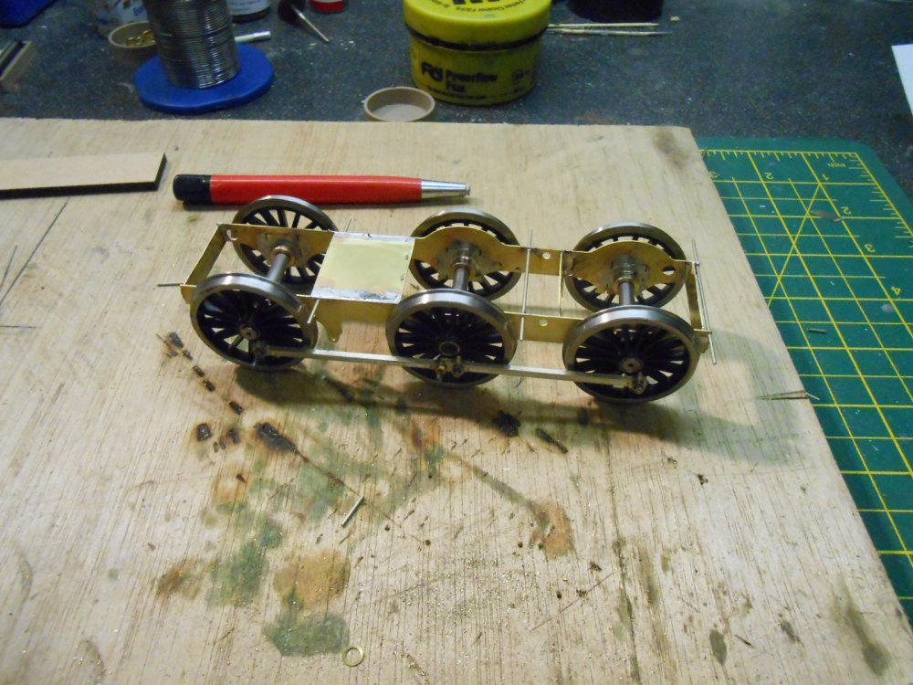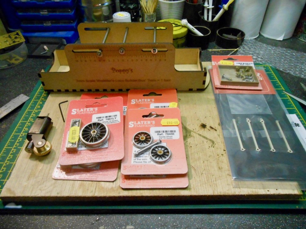 Shopping! So, I got my kit for £40, which is great, but as many of you will know, there is still a lot required to build the model. So, Reading 0 Gauge Trade Show yesterday, an event where it would be possible to spend well into five figures without even trying. A Lee Marsh loco, a rake of coaches, no problem... Well out of my league, but nevertheless, it gets quite expensive. First a visit to Premier Components, for a nice set of profile milled, jointed coupling rods, plus a Mashima motor and 40:1 gearbox. Seventy quid, just like that! A few stalls down and you come to Slaters. A pair of driving wheels is now £22 an axle, so with tender wheels and bearings as well, another £110 gone. Just as well I found a set of Slater's buffers on Roxy's stand, because at £12, they are a good £10 cheaper than the Markits versions. Yes, you read that right... Thankfully a bag of other castings [whitemetal] weren't so bad, but my £40 kit is now running well over £250, but still not bad in this scale. When you think that a Dapol Jinty costs less than £200 and wheels/motor/gears alone could easily make up more than half of that, recent RTR 7mm scale models look a bit of a bargain. You don't get the fun of building them though! Speaking of construction, I also bought a Poppy's Woodtech loco cradle. In laser cut MDF, the kit glues together in 5 minutes and has already proved its worth in holding the frames together while I soldered in home made [29mm] spacers. A photo shows that I already have a rolling chassis, though there is a small problem with the milled rods. In the past, I'm sure the joint was a rivet, but what's been supplied is a steel pin, that is actually too short to solder a washer on. Any thoughts out there? -