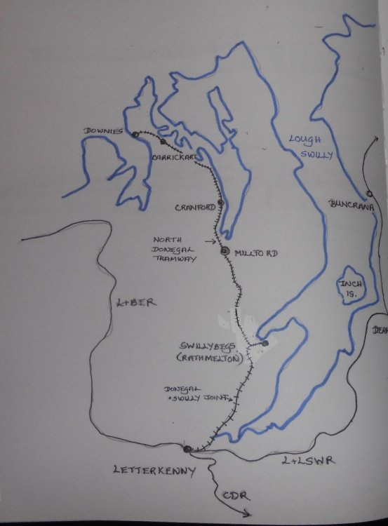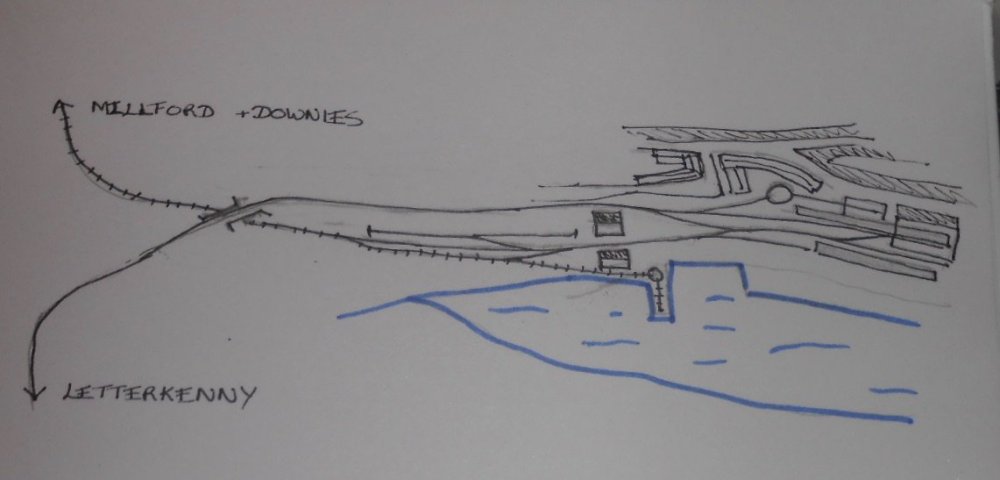Swillybegs out of Fintonagh Guess it is about time I started a new thread for the conversion of Fintonagh to Swillybegs. The work isn’t too drastic [& certainly far less so than Arigna Town to Belmullet], but an explanation as to my rationale may be useful first. The idea is that the Famine wasn’t quite as severe in this part of Ireland, which then didn’t suffer the same population decline as other parts of the country. Hence there was scope for the sort of railway development seen in Brittany, France, where in addition to the main lines and metre gauge systems like the Reseau Breton, various other feeder lines were built, including some roadside tramways. Hence, when the Londonderry & Lough Swilly Railway arrived in Letterkenny in 1883, the County Donegal Railway came soon after [rather than in 1909]. The two companies then joined forces to construct a branch to the port of Swillybegs on the shore of Lough Swilly, somewhere near present day Rathmelton. Meanwhile, an independent roadside tramway, the North Donegal, was building a line from Downies [on the Atlantic coast], via Carrickart and Millport to Swillybegs. Downies was an important herring fishery in the 19th century [true], so there was a decent amount of traffic at first. However, this soon declined in the 20th century, so it is likely that the section beyond Millport gradually fell out of use. Indeed, both railways would have struggled from the 1930s onwards, but my assumption is that The Emergency [aka 2nd World War] kept them going. Redundant locos and stock from the Clogher Valley Railway found work on both lines during the fuel crisis, right up until the early 1950s, when both sections finally closed at the same time as the L&LS railway. The reasons for all this nonsense go back to the last Cultra Exhibition, when I took Fintonagh there and got several new books from the Donegal Society stand. From these, I learned about how Clogher Valley stock went to both the Donegal and the Swilly and with a long held admiration for both railways, the die was cast! However, both lines tended towards quite long trains and big locomotives, which made me think that the only way to do it would be a brand new layout. Equally, the smaller Donegal railcars and latter day trains on the Swilly – which could be as short as a couple of wagons and a bogie brake coach – gave food for thought that maybe Fintonagh could be adapted. Both the Barclay 4-6-0T and Kerr Stuart 4-6-2T would fit on the turntable, while from the CVR, Railcar No1 [Donegal No 10] and Phoenix diesel tractor were easily converted – little more than a repaint. CVR wagons went to both companies, but I still needed to find a role for my two 0-4-2T – hence the additional fiction of the North Donegal Tramway. Still with me? Well done! So what of the layout? The map below shows the geography, while the track plan shows how the two lines meet up at Swillybegs. If you haven’t clocked the name yet, it is of course a play on Killybegs, the actual Donegal terminus. There are no changes to the track plan of Fintonagh. All I’m doing is adapting the front edge of the layout to look like a quayside. The Donegal/Swilly line comes in, at the rear, behind the rebranded warehouse, while the Tramway enters at the front, squeezing between that warehouse and a new ‘flat’, complete with a bridge joining the two, which will also hide the exit to the fiddle yard. The Tramway is deemed to be where the goods yard is, so there is some transfer traffic, which will largely be in the hands of Phoenix. Swilly trains will most likely be short mixed ones, with a coach and a couple of vans, while Donegal ones will be railcars, one with a passenger trailer, the other with a couple of vans. There’s a temptation to enhance the layout wiring to enable two trains on the layout at once, but this will probably make the scene very crowded and also cause sight line problems for operators. So things will probably remain one train at a time, though [as on Fintonagh], a train loco can go to the turntable while Phoenix does the shunting. So, there we are – an introduction to my latest piece of nonsense. Most of the layout stays the same and the backscene is not entirely unlike the Rathmelton townscape anyway. The new and revised stock will partly set the scene, but presenting a convincing quayside will be the main challenge, especially with so little room to work with. The photos below show where I’ve got to and with this new thread to chart progress, more will follow in due course. Anyone invested in Fintonagh can find the whole story in the Layouts thread under Clogher Valley Project, while locos and stock are within David's Workbench in that section.