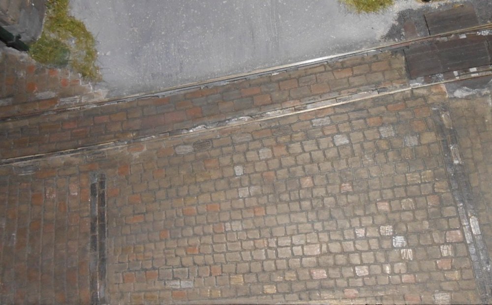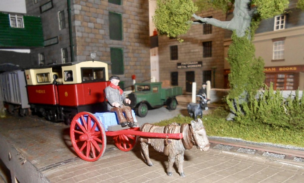 Having cleared the scenics on the front edge of the baseboard, a thin layer of DAS was applied and then once dry, the laborious process of scribing in all the stones began. Decided to use small setts for the road surfaces [including the tramway section leading off scene under the new warehouse bridge. It turned out to be not as tedious as I'd thought: scribing straight lines for one axis and then doing the individual setts by hand, including rounding the edges and ensuring there was a decent amount of mortar space between each one. I was a bit concerned about the painting, because photos often show a wide range of colours and I really didn't fancy having to pick out individual setts with a small brush... Began with a wash of a fairly light stone colour, using acrylics, then, once dry went over this with a wash of dark grey, which toned down the top colour and went nicely into the mortar lines. Then remembered my [many] crayons - pastels, various pencil ones and, in particular, a set of much prized Berol Karismas. These are water colour pencils and can be blended nicely with each other. So, using various shades from yellow to brown, it was a much simpler matter to touch in various setts with these, rather than using a paint brush. Further titivation is needed, but am quite pleased with the effect thus far, as shown below. Only this corner has made significant progress, but have also scribed in the larger stone blocks on the quayside itself, which now await painting. Meanwhile, couldn't resist doing a few trial scenes with the initial corner. I've added a few weeds along the base of the warehouse and posed the lorry and donkey cart for effect too. The main action on this section will be either Phoenix transferring wagons to/from the off scene goods yard and tramway traffic, so there are also a few posed shots of this too.