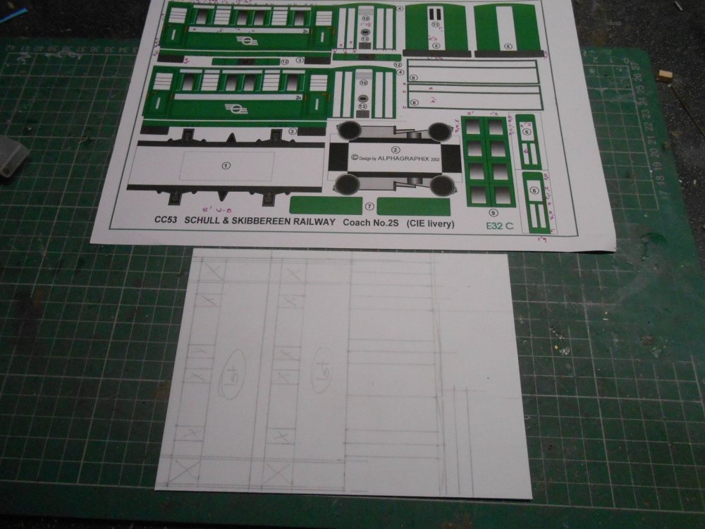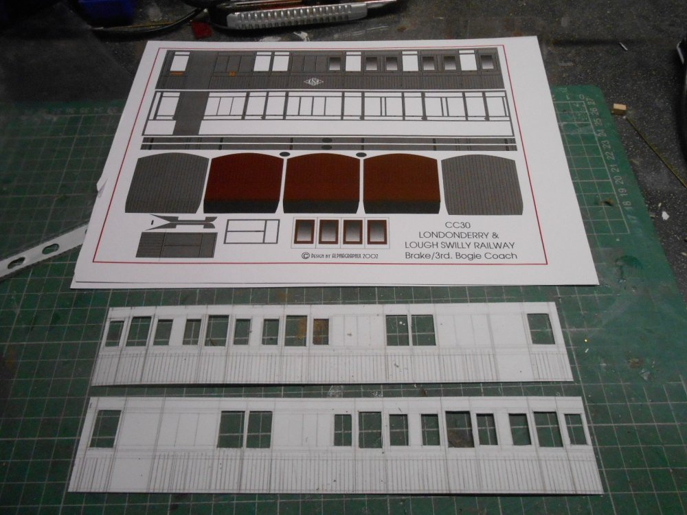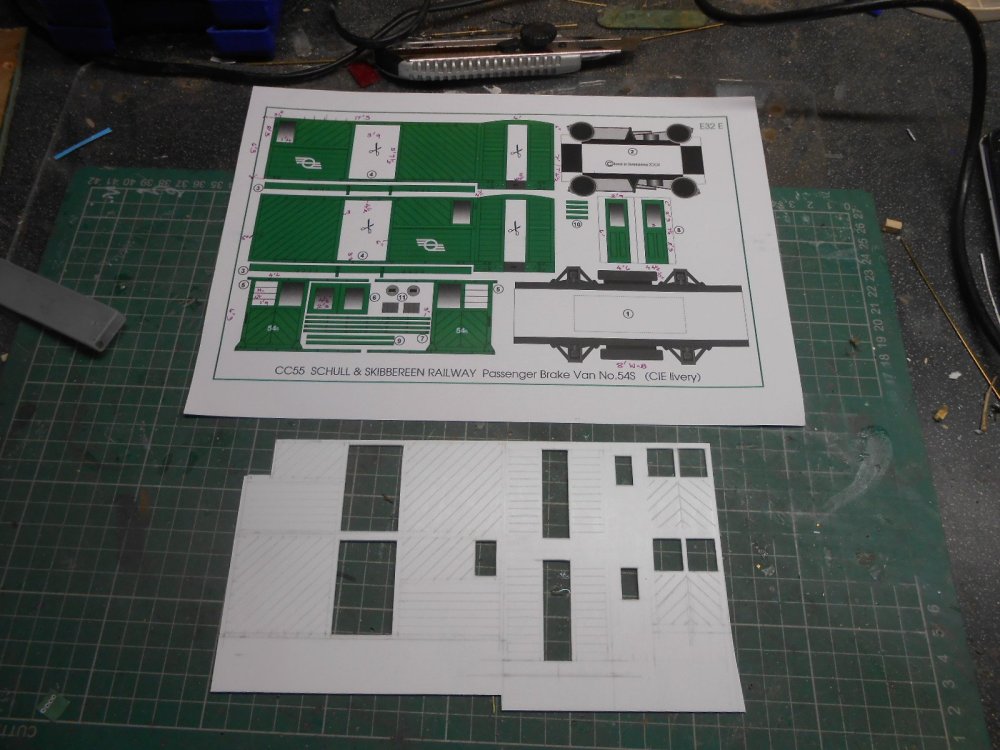 The structural work for the quayside is now largely complete, though much titivation and detailing is still required and orders are going in for some fish boxes [Langley] and some rather nice 3D printed lobster/crab pots I've found on the web. Maybe a couple of figures and some luggage too, while fencing along the back of the tram platform is also needed. The latter has been made from basswood, scored to represent planking, while more basswood strip has been used to make the large posts protecting the quay wall. Am tempted by the Langley fishing boat, though this would need a baseboard extension to sit on and at nearly £150 ain't cheap, so this is in the maybe file at the moment. Over Christmas, had to content myself with drawing out some coaches and a wagon on to plastic sheet. We were away at my mother's and it was suggested that taking the soldering iron, solvents etc might not be a good idea. Can't think why... Anyway, at least now have some basic 'kits' that can be made up when the Muse takes me: two Schull & Skibbereen 4 wheel tram coaches, a Swilly Brake 3rd, also a bogie fish van, plus one of the Donegal red wagons. The latter has already been made up and awaits painting.