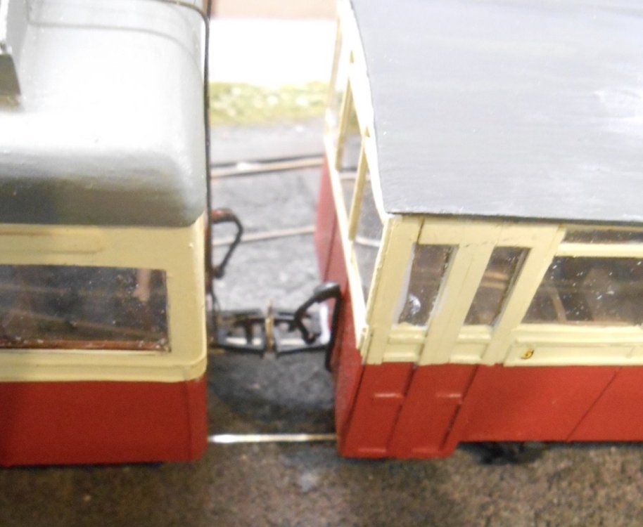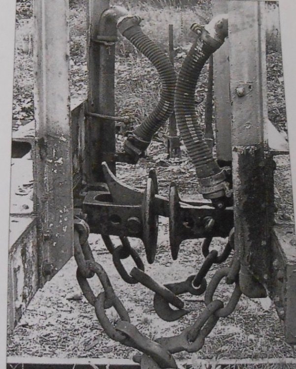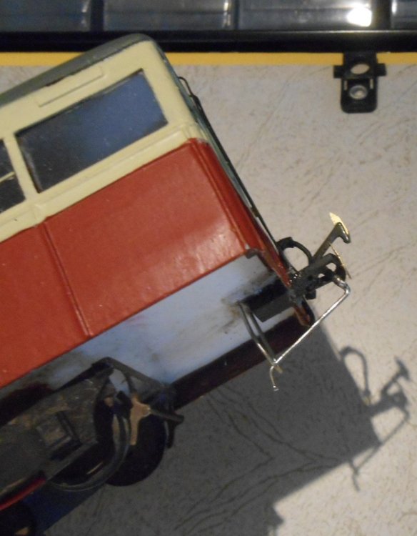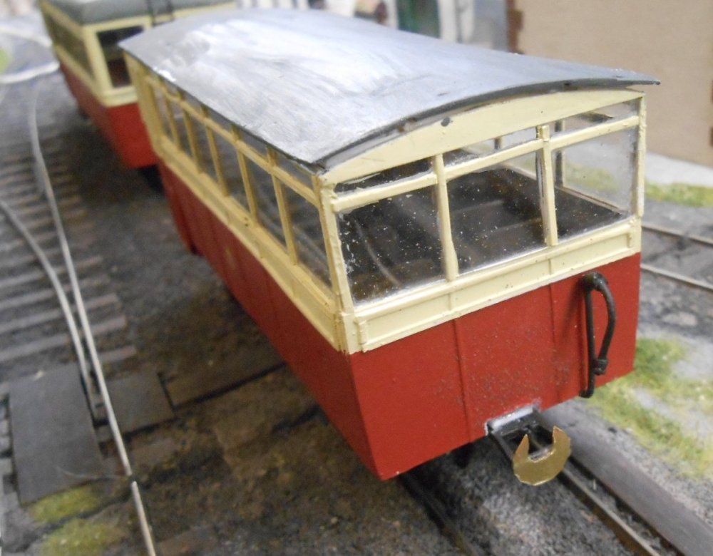 Couplings While it would have been nice to have authentic looking 'Zamzoodle' chopper couplings, for one thing they are quite expensive and for another seem to have been unavailable for quite a while. However, when you look at photos and drawings of choppers,, in essence they are very similar to slimline tension locks, which are readily available and much cheaper. Indeed, with friends at the Chatham Club often converting stock to Kadees, there is a plentiful free supply. The main differences are the shape of the hook and the large buffing plate - in lieu of ordinary buffers. The latter is fairly easy to resolve: a circle or rounded square of brass/plasticard suffices and the size seems to vary. Hooks seem to vary too, but all have a forward/upper extension, presumably to help the crew lift it when uncoupling. This works in my favour, because to make tension locks work with an electromagnet, I am fixing a piece of iron wire [paperclip] to the dropper on the tension lock, which extends back under the wagon. When the magnet is activated, it pulls this wire downwards, lifting the hook & hence uncoupling takes place. However, when the magnet is deactivated, this wire tends to leave the hook in the upper position, but by adding a piece of brass strip to the end of the hook [shaped to look like the prototype], balance is restored and the hook drops down again. The other thing that is needed, is a U shaped piece of wire to go over the iron wire, to keep it parallel to the rails stop it going too far and fouling the track. Nickel silver or brass is best, for obvious reasons. So far, have fitted a hooked tension lock to Railcar No10, with just loops on the trailer. It is intended these two will only work as a pair, so when the railcar is turned, there will always be a hook and loop together. Interestingly, photos often show this on the prototypes. In my case, the use of a turntable for locos and a turntable fiddle yard rather complicates matters, but have worked out that by using an 'exchange' wagon, with hooks at both ends, it is possible to remarshall a mixed or goods train without two hooks getting in each others' way. Early days, with some refining still required [mostly around the shape of the hook], but the railcar-trailer works fine, so hopefully no reason for the other stock to work as well.