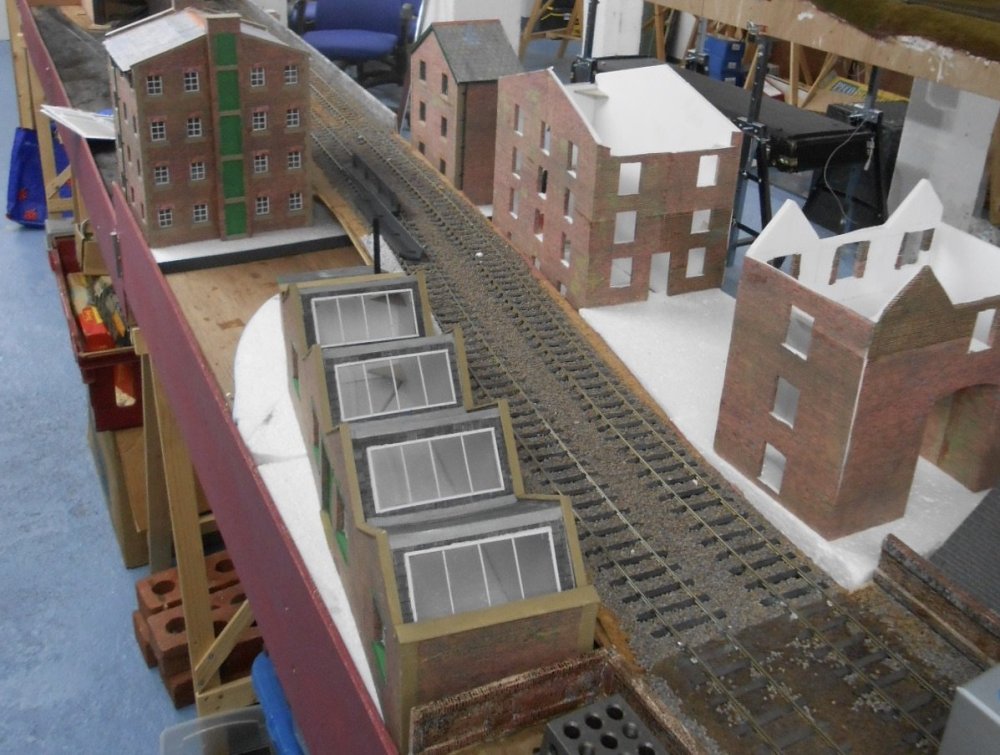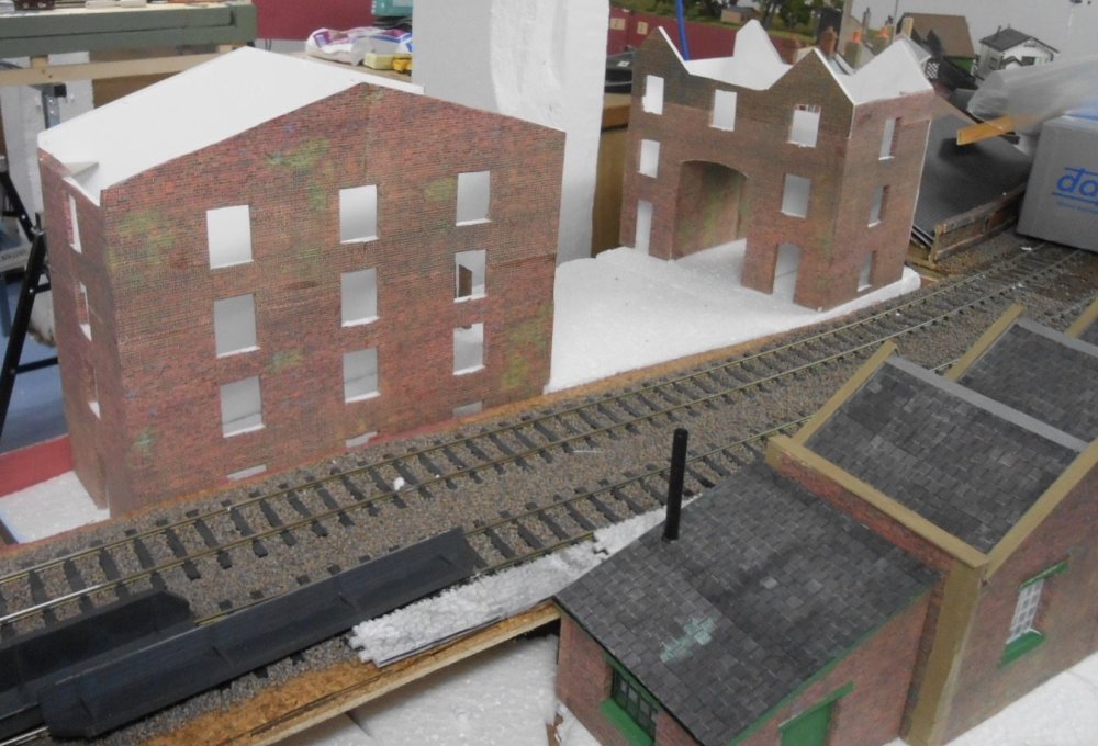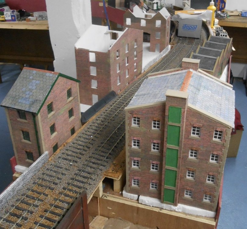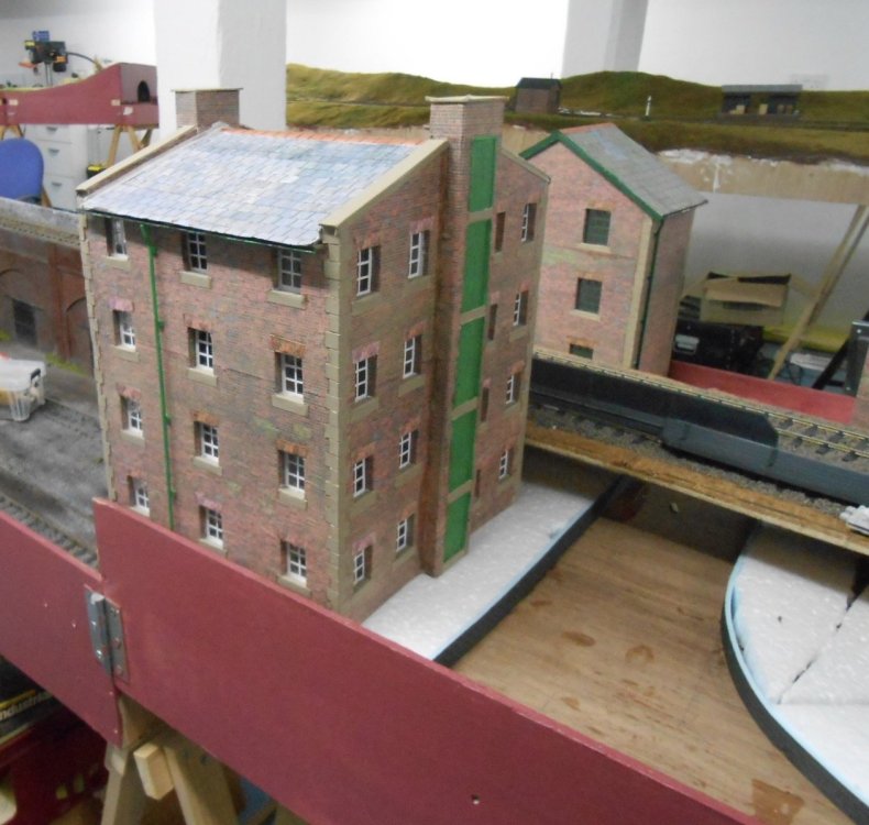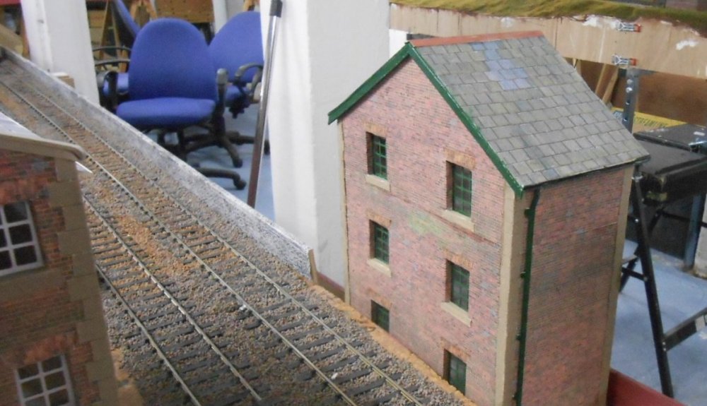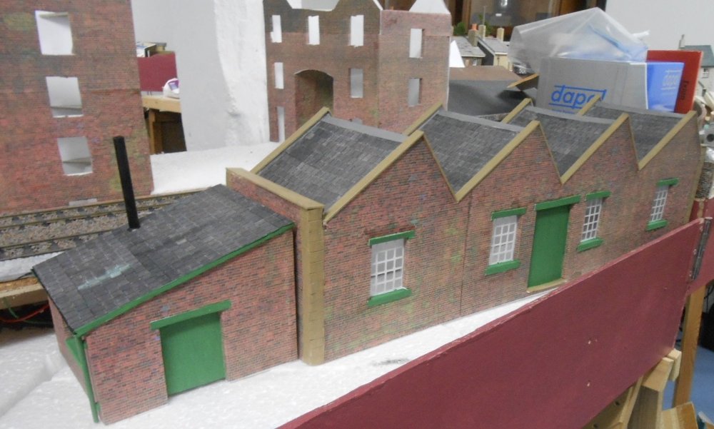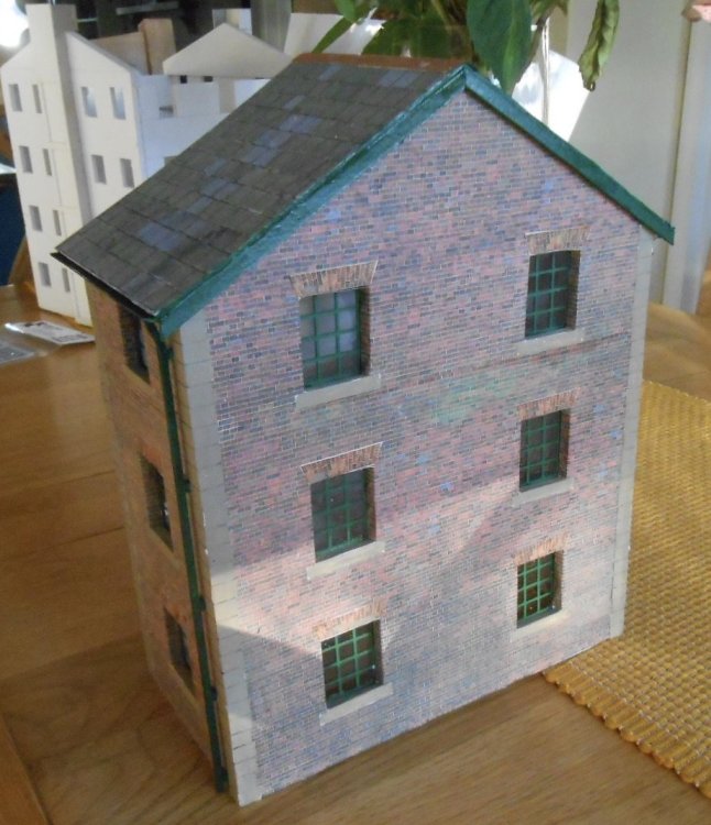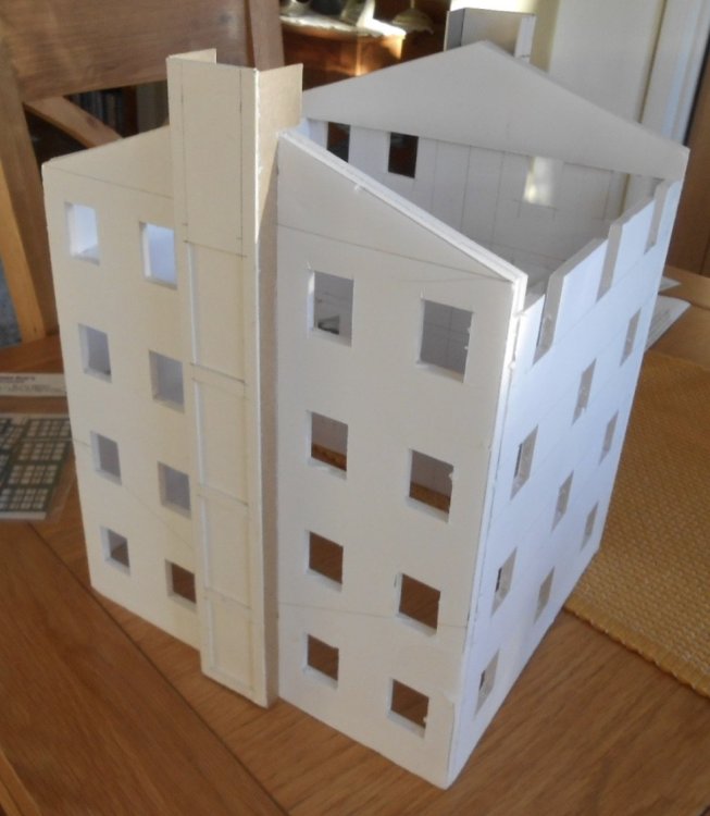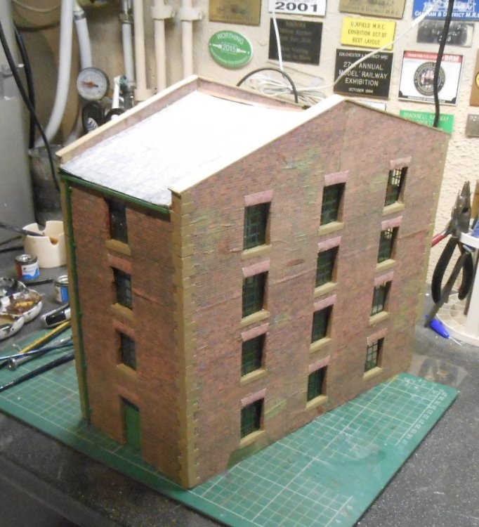 As a sojourn from recent activities, the workbench has become cluttered with large buildings for the Chatham Club layout. Called 'North Circular', it depicts a North London avoiding line, following the approximate route of the road of the same name. A double track, 0 Gauge oval, there are no points [apart from the storage sidings], but a lot of scenic features, designed to act as a backdrop to passing trains around its 10m x 4m footprint. The layout is due to appear at next year's Chatham Show in July, so I've taken it upon myself to create a section with a selection of warehouses and factories, plus a small canal basin. Inspiration comes from the Metcalfe card kitts, loosely scaled up to 7mm. The whole layout is very much built 'to a standard', making use of brick and tile paper, plus commercial window frames. I use 5mm foam board for the basic structure, varying the height of each storey from 8 to 10 feet. The overall shape of sides and ends are drawn and cut out out, then the pieces temporarily joined with masking tape, to check how each one fits on the layout. Once satisfied with this, the pieces come apart for window and door openings to be cut, followed by reassembly using triangles of thick card to brace the internal corners. Brick paper [downloaded from the web and printed at home] is then stuck to the foam board with pva. I cover over the window openings and then cut in afterwards, folding the paper inside. Things like brick lintels and stone window ledges, along with large corner stones help relieve the otherwise plainness of the model. Window frames are die cut ones from 'Purple Bob'. At around 50p each, they are less than a third the price of York Modelmaking ones and come pre-coloured too. The roof is made from mounting board, covered with slate paper [same as the bricks]. Gutters and soffit boards are a single piece of 2mm plastic sheet with one edge rounded off with a file, while drainpipes are 2.5mm square section plastic rod. Below is a larger warehouse, awaiting brick paper, windows and so on. Must admit, I haven't spent hours and hours on these models, but as said earlier, they are built to the same standards we've used on the rest of the layout, so hopefully everything should blend in well together. Also shows, to new/inexperienced members that with a little effort, it is easy to produce you own models. Cheaper too. Am tempted to suggest we add a third conductor rail, as it ought to be possible to use it to enable my broad gauge stock to stretch it legs. One day maybe!
