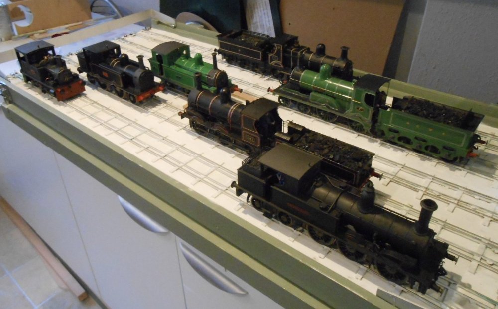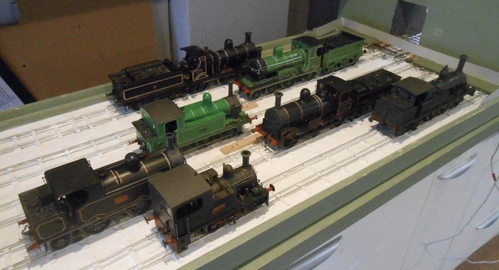 The last two buildings for the Club layout are now largely done, so will post some pictures later of them all in situ. Looking at my stock prior to Tolworth, have decided to pass on the Ixion Hudswell Clarke. Although a very nice model, needs eventually trumped wants because I already have seven locos for my 1900s period and only five tracks in the fiddle yard! For the uninitiated, shown below are WL&W 0-6-0 Shannon, MGW 4-4-0 Wolf Dog and E class 0-6-0T, GS&W 2-4-2T and 101 0-6-0, plus a Hunslet 0-4-2T and Sligo Small Tank. However, the ultimate deal breaker was the main gear on the middle axle, as [being nylon] I am far from confident that I could remove it without damage. Also realised that I do already have a little contractor's loco sitting on the shelf. My very first 0 gauge loco, it was made from an MTK kit [I think] about 30 years ago and has [sadly] mainly been used to practice painting and lining since then. One day, I must build a new chassis for it and give it a good makeover too.