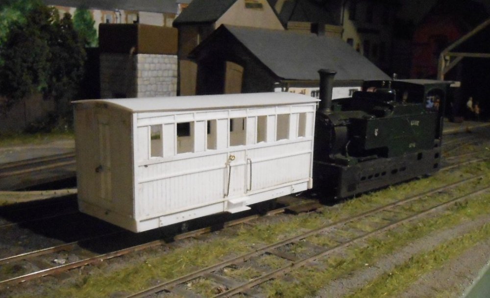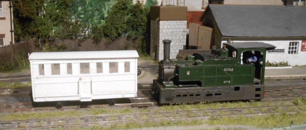 Schull and Skibberish... A while ago, I sent off for one of the Alphagraphix card kit bargains - namely a complete Schull and Skibbereen train. Loco and three coaches for just four quid. I kid you not, a whole train, in 7mm scale at that. Ok, so it is just four sheets of printed A4 card, but as a starting point, these kits have much to commend them. Why Schull and Skibbereen you ask? Well, having sold my two Clogher Valley bogie coaches, it occurred to me that I could create a S&S train to go with my CVR 0-4-2Ts, as part of my Donegal/Swilly re-imagining for Finotnagh. Recently came up with a new name for it too - Swilybegs. Killybegs is of course one of the Donegal branches, so a version on Lough Swilly has, for me, a nice ring to it. As for a Schull tram, as mentioned a while ago, a further, independent, branch north from the shores of Lough Swilly to Milford, Carraigart and Downies could make sense - especially if we assume the Potato Famine was not as severe and likewise the subsequent depopulation. Works for me, anyway. For a change, decided to have a go at one of the coaches this week. Just plastic sheet and strip for the body, sitting on a Parkside 4mm wagon chassis. As a relief from chasing prototype fidelity, it can be quite enjoyable to do a bit of free lancing. One reason is that you can use formerly unwanted items like door handles from the scrap box. Another is not worrying too much over perfect dimensions. The photos show the first coach with a CVR loco in what could well be the tramway platform on a revamped Fintonagh/Swillybegs.