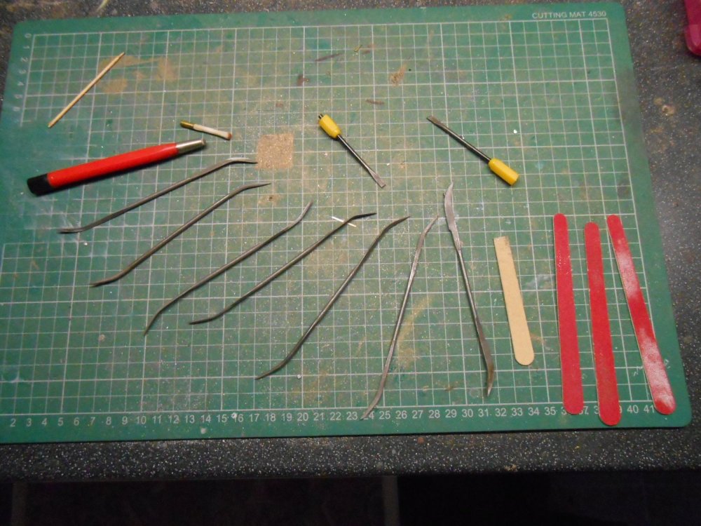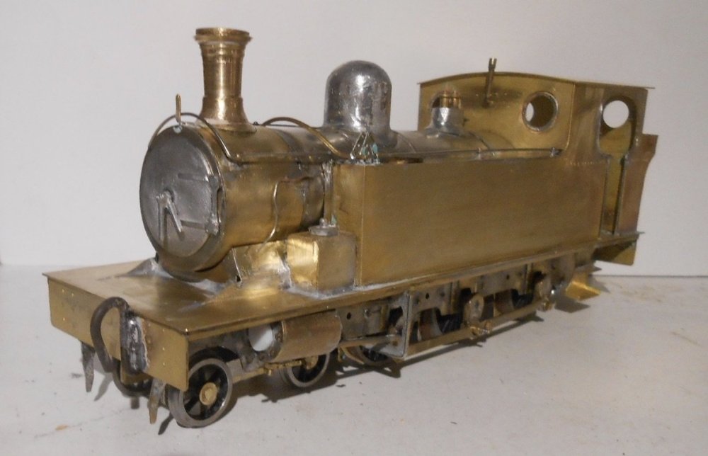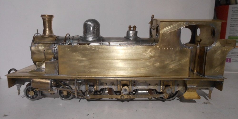 Have been adding various bits and pieces this week - a case of studying as many photos as you can, because a lot of stuff doesn't make it into a line drawing, let alone a Worsley etch! In no particular order I have: tidied up the smokebox saddle, filling in gaps with thin brass sheet and solder added the four cab handrails, cursing myself for cutting off the thin strip of brass in the space. Had I just cut it in the centre, it would have been perfect for a simple fold back around the top of each handrail instead fiddling around with tiny bits of brass strip handrails along the tank tops fitted bunker extension pieces: on three of the class, it was the usual coal rails, but No4 had them plated over, so this is what I've done added vacuum pipes, from the spares box tank filler caps, made by adding a thin oval of nickel silver to a thick oval of brass smokebox lamp iron, simply made from a piece of bent brass strip cab beading, from phosphor bronze strip cab spectacle plates - thankfully in the etches, because they would be a swine to make otherwise a white metal brake cylinder, from the spares box various pipe runs along the boiler from cab to smokebox various operating rods, mostly I'm guessing for the sanding gear The cab interior still needs to be done, but have put in an order to Laurie Griffin Miniatures for a suitable set of castings, plus a sset of loco jacks for the footplate and something to represent the curious spherical valve [taps? sticking out of the front of the sand boxes. I'm also pondering on couplings, having come across the Zamzoodles, which are working chopper couplings and would really look the part. However, the curse of the turntable makes them problematic for shunting mixed and goods trains because, like Dinghams and others having two hooks together is not recommended, so I may yet be sticking with Kaydees. So, while waiting for my orders to arrive, have started on the Great Clean Up, prior to the first 'witness coat' of primer & then however many further sessions of filing, scraping and sanding in order to get a decent paint finish. The various implements of torture are shown below: The set of 'whiffers' [variously shaped needle files] are always useful, as is the dreaded glass fibre brush meaning I can look forward to the usual nasty little splinters in my fingers for the next few days. As already mentioned, the loco is going to be No4 and a correct set of Barclay builders plates have been ordered from the Light Railway Stores for well under a tenner [including postage], which is great value. I'd been looking forward to creating that rather splendid Swilly [very] dark green, but Patterson's book says the Barclays were black with yellow lining for No4, though if anyone knows different, please let me know. The remaining pictures show the loco ready for that first witness coat, so it will soon be goodbye to all that shiny brass and nickel silver.