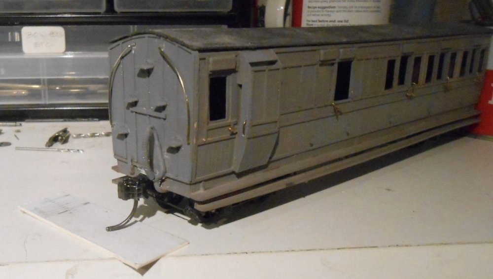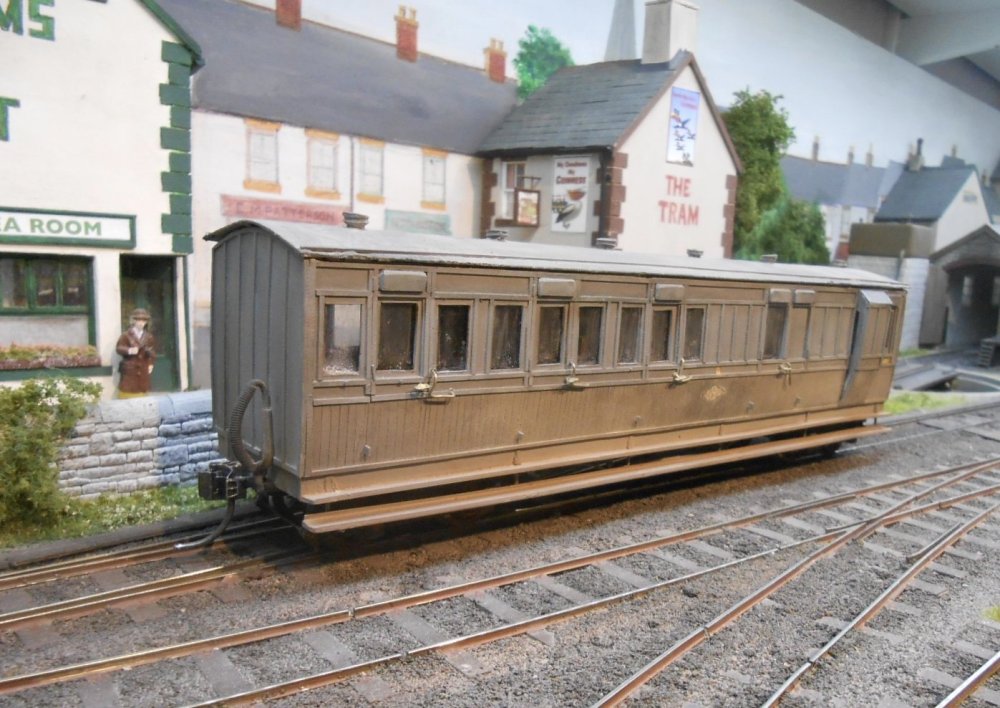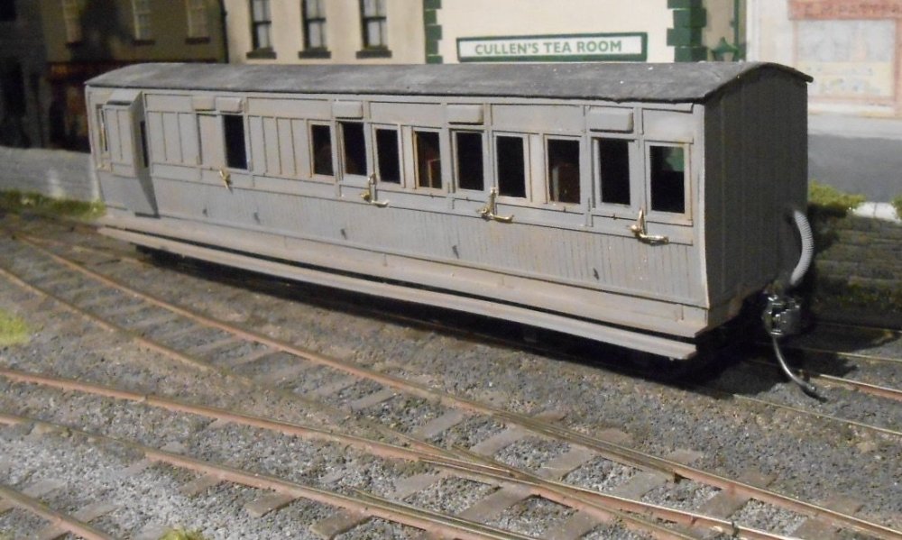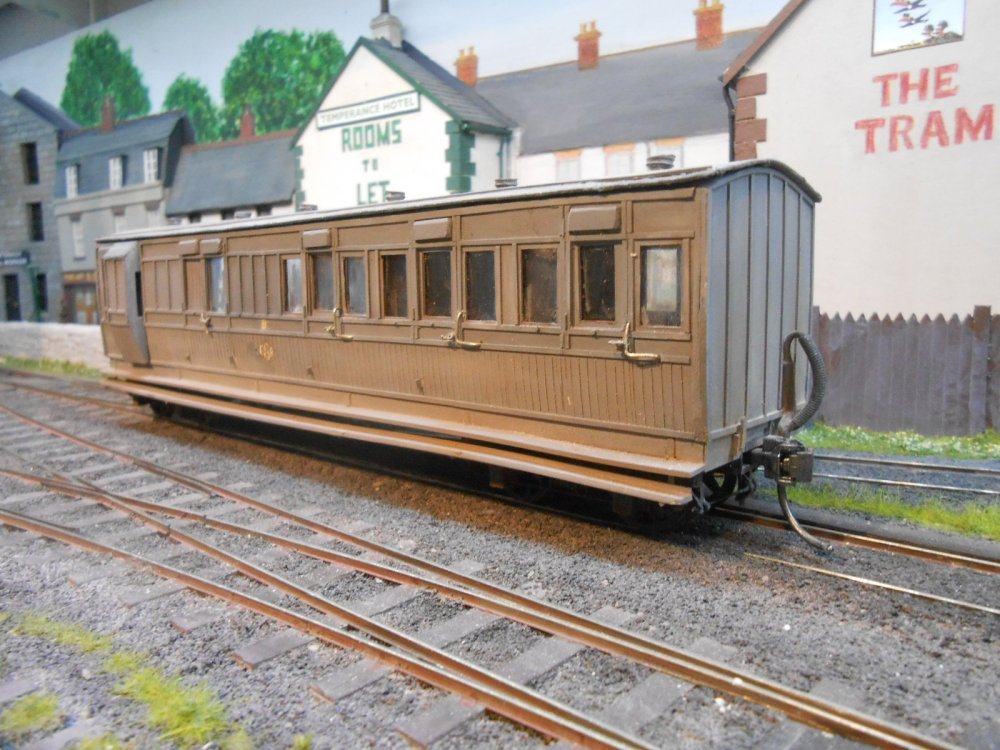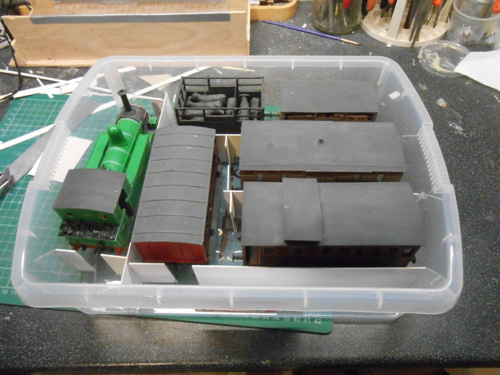 The Swilly coach is now pretty much finished. Final jobs included fitting roofs to the duckets, glazing, plus lettering, numbering and a bit more weathering. At least the Swilly didn't go much on complex liveries for its coaching stock - the diamond logo [hand drawn with various fine marker pens], plus 'guard' at the van end and a number [both transfers] and that's it. I also made some covers for where the lamp tops went after electric lighting was installed. Hopefully it looks suitably care worn. Eventually, it will form the mixed train with a couple of wagons and the Barclay 4-6-0T With another show coming up for NP Quay, decided I ought to improve my stock storage, so invested in some new plastic ones from The Range. Not sure about the Barbie Pink lids, but they mean my stock now stands on its wheels and I can [hopefully] protect the AJ coupling hooks better. I can also fit a complete train in each box, which makes for easier setting up and packing away. The three deeper cardboard boxes contain the station building, the crane and some spare stock if/when required.