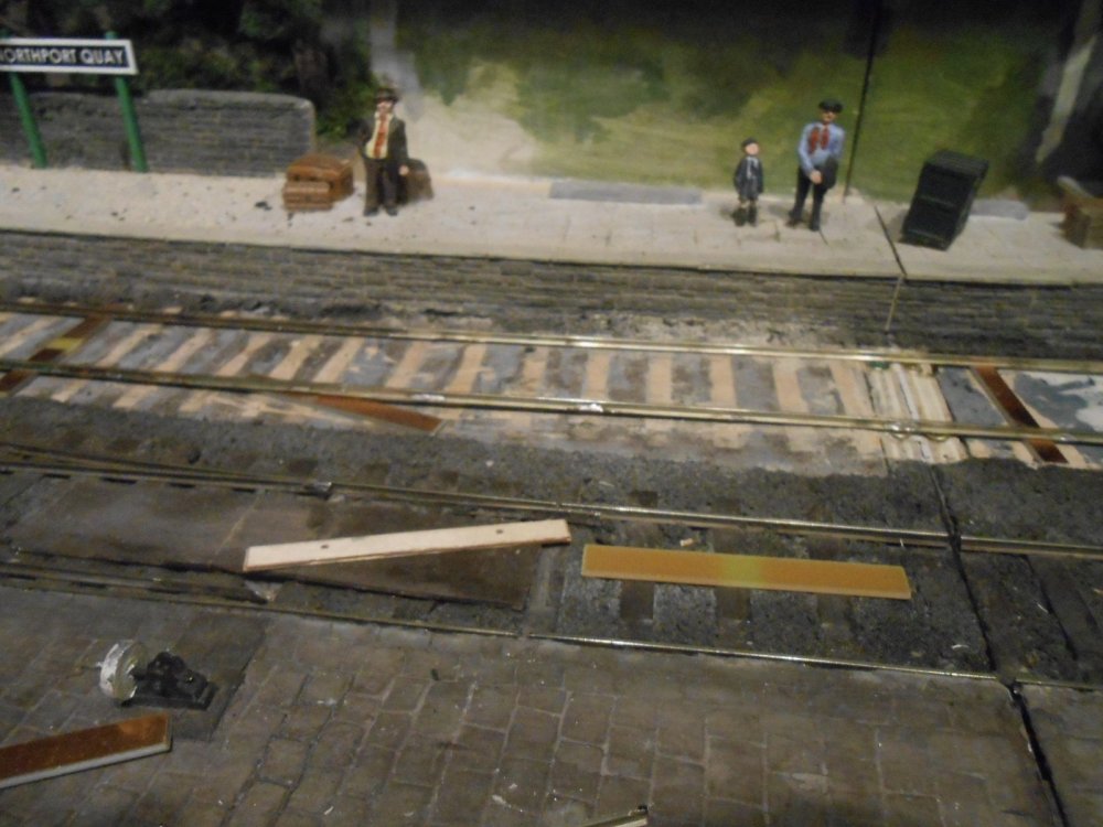 The Portsmouth Show proved to have a lot of very high quality layouts. Indeed, I would not have been disappointed to get 'worst layout', were such an award given! Lots of interested and knowledgeable folk came to look and talk, so it was in many ways a nice day. However, NPQ is still not all it should be, not least because the 'ridge' in the main baseboard joint reappeared and was severe enough to derail Shannon in either direction. Wolf Dog and the 101 were decidedly unhappy, but managed to get through with care. Part of the problem almost certainly came from the the varied heat and humidity of the weekend. The layout spent the night in my car & then Saturday morning was really wet, though luckily there was a brief window which let me get the boards into the hall unscathed. Normally, school sports halls are ideal, with high ceilings and flat floors, but as the venue warmed up, the humidity started to play havoc, so much so that in the middle of the day, the fiddle yard stiffened up considerably. Thankfully, things eased later, but it only goes to show the things that can affect exhibitors. Back home and with time to think on the two hour drive home yesterday evening, did a thorough check on my overall set up which revealed several issues I hadn't been aware of: One of my trestles is actually half an inch higher than the other [!] The beam extensions sag at the far end, by another half inch [!!] Therefore one end of the layout is a full inch lower than the other, which equals a minimum gradient of 1 in 90... Clearly, this doesn't help, but that ridge at the baseboard joint has meant I've had to strip out about half a metre of track and start relaying it. Again. Discovered that the fixing screws which the rails are soldered to at the join were sitting too high, but also the baseboard surface on the left hand board seems to have lifted slightly. Laying some new rail across the joint, shows there is minimal clearance between the bottom of the rail and the baseboard surface, so am going to have to find a way of sorting that out. At the moment, it may be I'll have to solder the rail to a few countersunk screws and the use thin card to represent the sleepers on a short stretch. I'll also be seeing if a bit of extra bracing is needed underneath the board. All in all, a bit of a bummer, but at least I don't have another show until July at the moment.