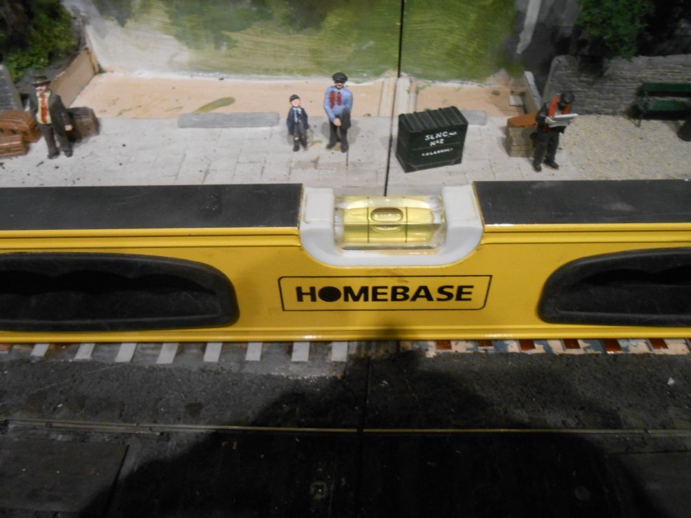 Investigations this morning revealed the cause of the ridge in the track. Turns out to be a case of not enough screws/glue/both to fix the baseboard to top the frame and the former had risen about 2mm in the centre. More than enough to derail a 7mm scale engine... A couple of screws was all that was needed to push the baseboard top down on to the frame beneath. This has enabled some of the copper clad sleepers to be replaced, but as can be seen from the photo above, clearance gets tighter near the baseboard join on the left hand side. The righthand side seems ok. So, I put in several small screws and then soldered the rails to these, before using sleepers made from thin card to fill in the gaps. As can be seen above, the track is now ready for ballasting, so am hoping it will be a case of third time lucky - though if I'd done a proper job in the first place, luck would not have anything to do with it. I've since sprayed primer over the new track, to prevent water getting into the surface [and card sleepers] when I do the ballasting. The final picture shows that everything is pretty much nice and level, while the longer spirit level also reassures me that there is no rocking over the baseboard joint. A bit of levelling up was also needed on the loop track, but nothing so drastic and hopefully I'll be able to run trains again soon.