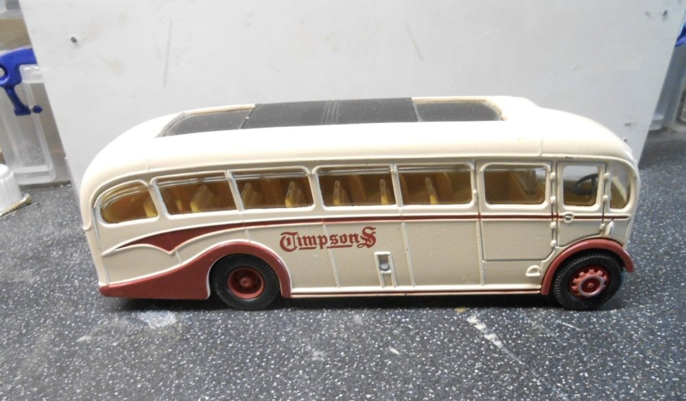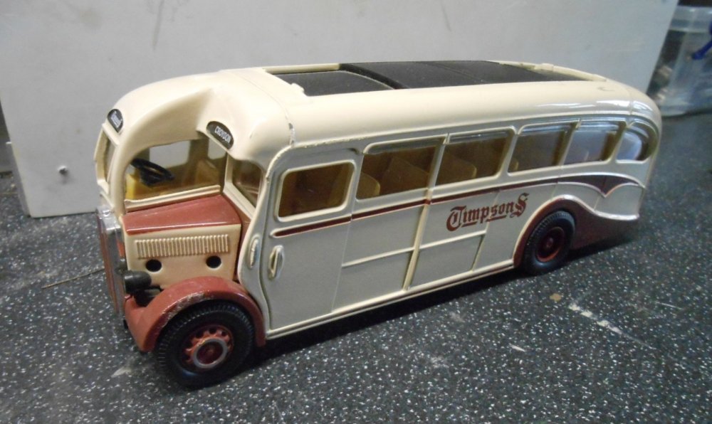 Came across this Corgi Classic model in a local collectibles shop recently & being priced at just ten quid, I couldn't resist! Underneath, it says it is an AEC Regal and though it is probably 1:48 [or even !:50], am thinking it might be appropriate for my Swilly/Donegal makeover of Fintonagh. Steve Flanders Irish Railway Pictorial of the Swilly notes that AECs were among a 'motley collection of buses' run by the company in the '30s & '40s, so am hoping I can make this model presentable. Swilly buses all seem to have had roof racks/boxes fitted, so a bit of filling may be needed on the Corgi model, which has a sliding 'sunshine' roof. New numberplates & destination blinds will be needed, while I find it is always nice to angle the front wheels slightly and file flats on the bottom of the tyres so the model sits better. However, what about livery and lettering? Are there any suitable Swilly decals available? Something that might require more work is that Swilly buses seem to have their passenger doors behind the rear axle, while the Corgi model has its at the front. Any thoughts and ideas welcome, please!