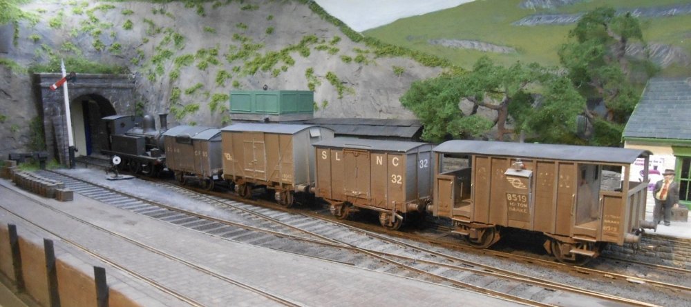 I'm really pleased I took the opportunity to do a dress rehearsal with NPQ last Sunday. Every time you take a layout to a show, you learn something new about it [mostly through something going wrong], so am very much hoping the experience will improve things for its proper debut at Uckfield. Much of this week has been spent fettling various bits and pieces, including a nasty kink in one rail in the runnel and making sure the track is smooth across the joints from the fiddle yard to the layout. Some more weight at the front of the Deutz means that can now earn its living again too. Another issue which came up was that we could run the whole sequence of seven trains in not much more than 20 minutes - mainly because only two were doing any shunting, with the rest just 'out and back'. Solving this caused much stirring of the grey matter, but eventually worked out that I could swap a wagon from the mixed train into the right hand siding, as per a similar move using the J26 and its short goods. It turned out to be a bit more complicated than that though because to make this happen several wagons needed to have AJ couplings added, while the same thing was also needed for two trains on the 1900s period. While doing this, I decided that several wagons needed swapping around as their chassis were less than perfect and really could do with some compensation units added. However, for now, there is enough spare stock without resorting to major surgery, though I must admit it will be nice to get back to some proper modelling once Uckfield is out the way - my broad gage stock hadn't turned a while for over two years, so a lot of servicing has been needed, plus the fitting [and testing] of all those couplings! Some cosmetic work is still required too... Anyway, here are a few pictures of the J26 and its revised train. Quite an eclectic mix too, with a 'modern' H van, followed by an ancient Sligo 'semi', an equally antediluvian GNRI box van, to say nothing of the ex GSWR brake bringing up the rear. After running round, the loco removes the brake and GN van, moving these to the headshunt. The loco can then pick up the van in the right hand siding [in this case a Sligo box van] and attach this to the brake. The GNR van can then be pushed into the siding, after which the Sligo van and brake go to the headshunt, under the crane. Finally, after running round and coupling up the four wagons, the train is ready to depart, as the signal shows! This third shunting move helps balance the overall sequence with three out of seven trains doing more than just run round. Remembering to shuttle the crane up and down should mean the sequence now last about 30-40 minutes. There is quite a scoop for this year's Uckfield show, with no less than five of Iain Rice's layouts appearing. NPQ will try and match that on the Sunday, with no less than five SLNCR 0-6-4Ts on show: thanks to Galteemore coming to help. Ok, the layout is only one engine in steam, but the photo opportunities should be good!