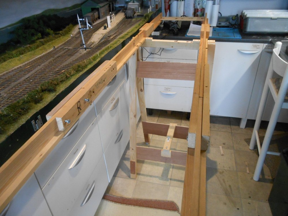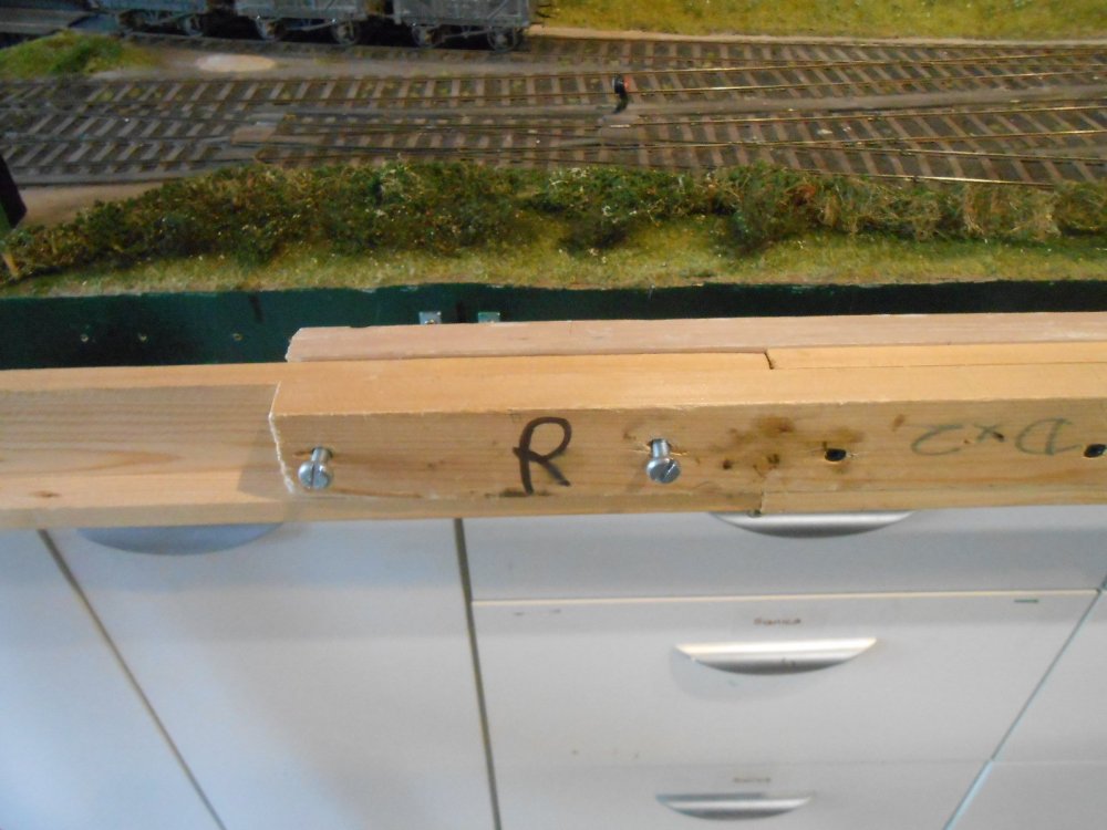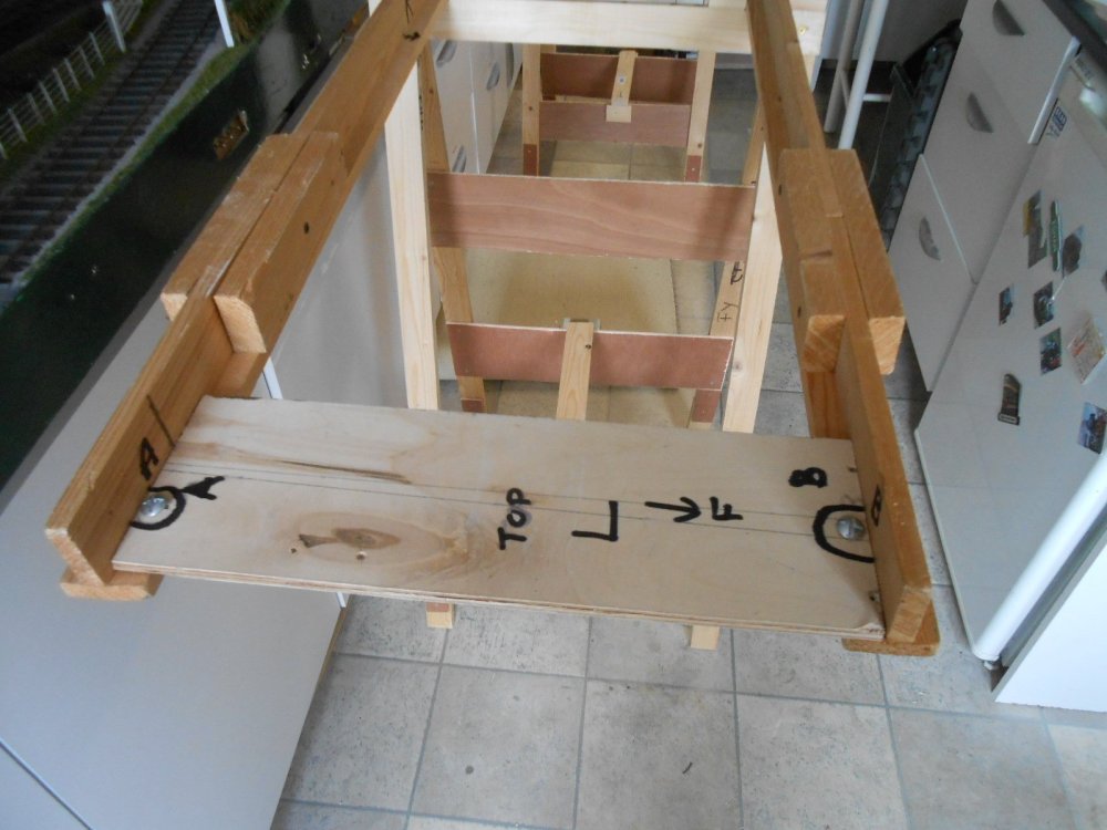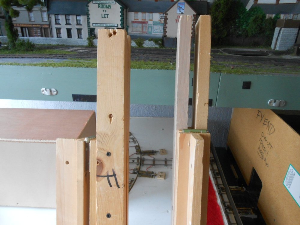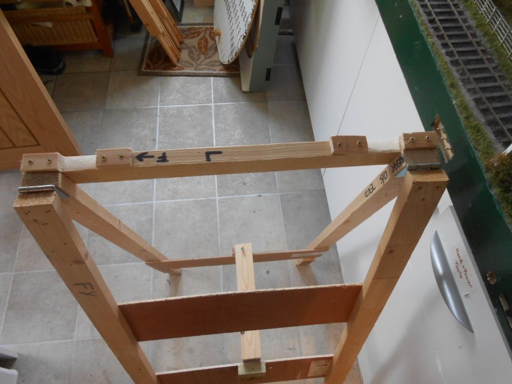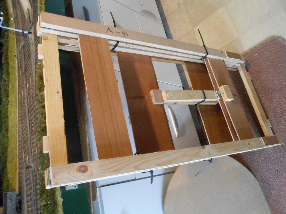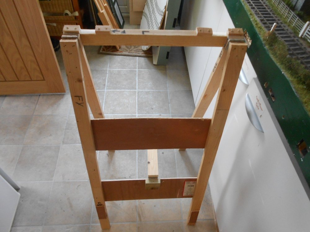 A bit of woodwork Not my forte by any means, but needs must as the adjustable metal trestles I've been using with Fintonagh will not fit in my car alongside Northport Quay when it goes out to shows. One option would have been to add folding legs to each of NPQ's baseboards, but they are heavy enough already - as is the sliding/rotating fiddle yard from Arigna Town, which is also being used. So, a bit of head scratching and scribbling came up with a pair of wooden trestles which will fold flat and enable me to use the folding beams from Fintonagh with them. These beams also give me a 60cm/2ft space to put a small fiddle yard at the other end to represent the pier siding. Nothing special about the trestles - I reused some 2x1 from an earlier project, along with some steel hinges and 5mm ply that was also spare, so they haven't cost me anything [this time]. What I have done is added some small spacers to the top of each trestle to keep the beams apart. The beams are also hinged in the centre [necessary as they are 9'6 long overall] and locked by two 6mm bolts. They are additionally kept apart at each end by two plywood plates, which also serve to stop them moving longitudinally. Lugging various layouts to over 100 shows over the years gradually teaches you the importance of being able to secure things for transport, while also minimising the number of trips to and from the car. Re-usable cable ties hold the two trestles together and [fingers crossed] they only take up half the space of the Screwfix metal ones. Fintonagh has an outing to a show at Welwyn Garden City as the end of April, so will be able to test the new trestles with that. With a bit of luck, they will save me another few minutes setting up and knocking down time too.