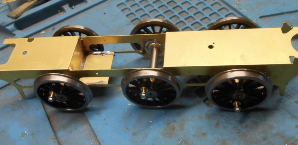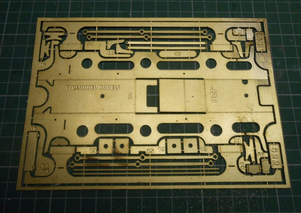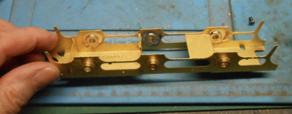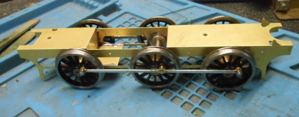 Alphagraphix/Tyrconnel E Class Made a start yesterday on my new loco kit, following the arrival of a set of Slater's wheels. This etched brass kit is good value at £120, although being 7mm scale you quickly find that wheels/motor/gears doubles that. For those of you unfamiliar with these things, you get several sheets of etched parts, along with various castings for chimney, dome, buffers and the like. I always start with the chassis, on the basis that once this is rolling nicely, then the rest of the kit is merely cosmetic. Here the AlphaG kits really come into their own, as the chassis is a one piece etch, which simply needs folding to shape, though before doing this, the axle holes need opening out to take the wheel bearings. I use a tapered reamer for this. Then you just fold the frames up and then bend the spacers into place. Half etched lines mean everything lines up neatly, so that in half an hour or so, you have a chassis! OK, it now needs everything soldering in place, but that is easy, because the pieces are already partly joined anyway being a single etch. After that, you solder in the six wheel bearings. The kit is designed for both 32mm [0 gauge] and 36.75mm broad gauge. As I model the latter, this means soldering the bearings inside out, which gives the right spacing to go with the extended 34mm axles. Slater's wheels require a bit of work to set up. A wheel nut [tightened by an Allen key] fixes the wheel to the axle, but before then, you have to screw in a 12BA bolt as part of the crankpin assembly. Easily done as a hole is pre-moulded into the wheel boss. A top hat bearing goes over each bolt on to which the coupling rods are slid & the latter are then held in place with a nut and washer. I usually find that the axles can be a slightly tight fit in the main bearings, but a bit of gentle work with a round file quickly sorts this out. So, in just over an hour, we have a nice, rolling chassis. Coupling rods come next & these are invariably etched in two or more layers that need soldering together. A couple of panel pins in a piece of plywood holds things in place while you do this. Fitting the coupling rods is always fiddly, as the top hat bearings, nuts and washers are tiny and easily lost. You also have to make sure the driving wheels are fitted correctly, with the usual convention being that those on the left hand side are 90 degrees forward of those on the right. Inevitably the crankpin holes in the coupling rods need opening out a little, so a bit of trial and error follows, but the AlphaG artwork is so good that this is rarely much trouble. What is a bit of a faff with pretty much any etched kit is that you now find the wheels and rods are repeatedly on & off while you clean up the chassis, fit things like guard irons, brake gear & of course the pick ups and motor gearbox. However, knowing the chassis rolls nicely definitely eases the pain, because there are few things worse than a model loco that doesn't run properly. Time spent so far about three hours.