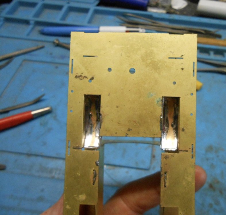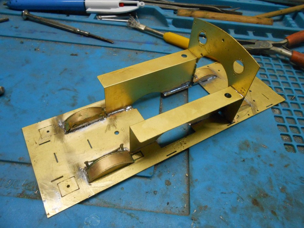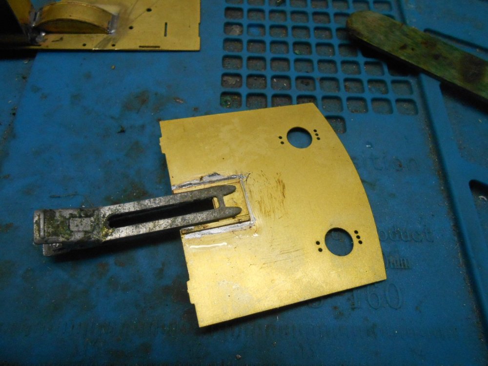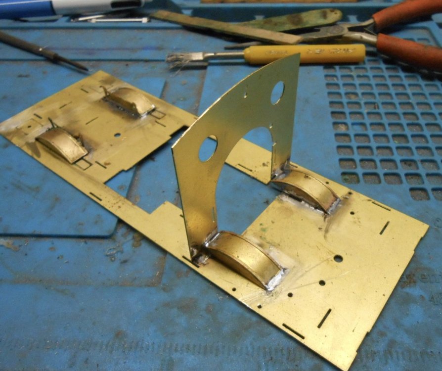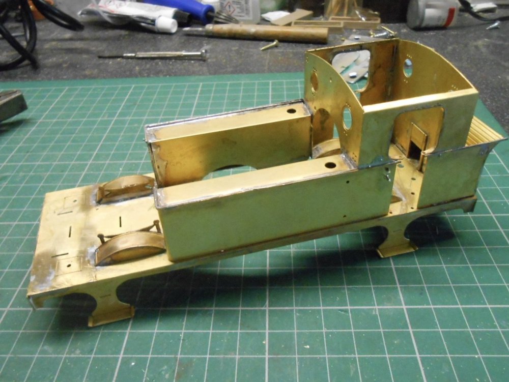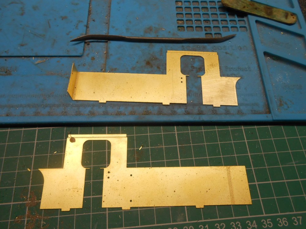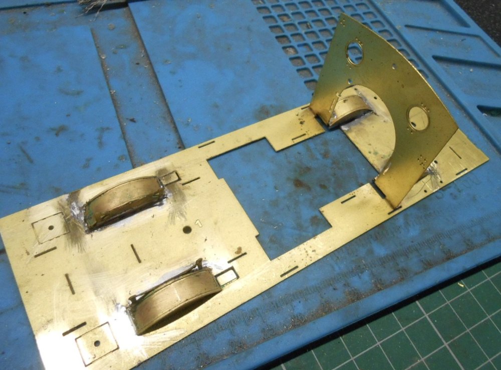 I'm sure all kit and scratch builders have aspects of the process they love to hate. Anything fiddly for one - especially if it requires more hands than you were born with - and various times during construction when you find something doesn't sit right, no matter how careful you've been. Add in my latent ability to fit anything 'handed' back to front and rude words are inevitable... The footplate starts off simply enough - a nice flat etch, with just the outer sides of the four splashers to bend up. The inner sides have to be cut from the fret next, but tabs and slots help you solder them without too many problems. However, the splasher tops are the first items where you need more hands. If I was making several engines with 4'6 drivers, then it might have been worth cutting some sort of inner shape from wood, to rest the tops on, but I just tend to plough on, getting singed fingers and broadening my vocabulary. At least bending the brass to shape is easy. Tip: always use a smaller diameter rod than the curve you are creating. Turned out I could have saved myself a lot of trouble by leaving the tops until after I'd fitted the inner tank sides. These give you something else to rest the part against & having originally fixed them about half a millimetre out, I had to take them off anyway. However, before that comes the cab front, then the inner sides of the tanks. Next is the cab rear, which needs the coal plate adding & best then not to solder it back to front as I managed! Notice the simple tools which can help no end - lolly sticks or bits of thin ply to stop fingers getting singed and the all important sprung hair grips to hold things while you are soldering. Being aluminium, these are ideal as this metal is pretty much impossible to solder. I've never been very neat or tidy with soldering and use far too much of the stuff, but it helps a lot if you can do most of the main seams from the inside. Likewise only spot solder long seams to begin with, as joints are much easier to redo if [when in my case] you get it wrong to begin with. The cab sides, bunker and tanks are large etches, needing just a single fold for the tank fronts. The latter are radiused, but a series of half etch lines on the inside make this nice and easy. The rear bunker piece is done the same way. Just as well, because the next steps are to fit all the beading and the piece that goes round the cab opening is a right swine to fit. Trial and error, singed fingers and more rude words again! So, there we are. About five hours for these bits, taking us up to eight in total, with at least an hour less if I'd got things right first time...