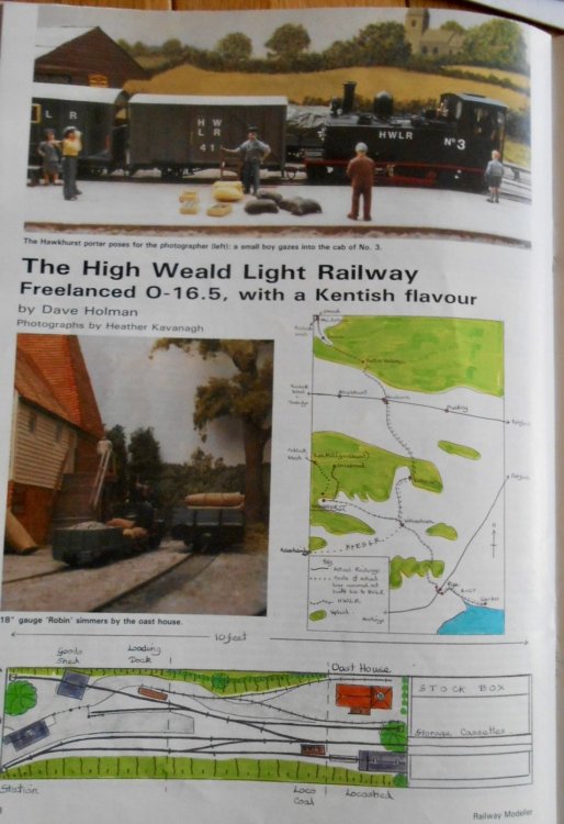 Already on my third or fourth version and not convinced I've got the design right yet! Drawing it out full size on lining paper should help, so I can pose stock and add some basic cardboard mockups of buildings too. However, before any more on the new project, thought I'd finish off my early 7mm scale stuff by going right back to the beginning and 0n16.5. This was in the late 1980s, so not only are the pictures photos of photos, some are actually in black and white. The layout was called Hawkhurst, High Weald and it appeared in the Railway Modeeller in 1991 and Narrow Lines [7mmNG Society Magazine] in 1994. The pictures below show the track plan and map of the concept. The latter very much a Colonel Stephens theme, being a narrow gauge line running across the Weald of Kent from Rye to Maidstone, replacing the Kent & East Sussex; with a branch to Hawkhurst for good measure. Construction was very 'old school', with chipboard on 3" x 1" softwood frames, though the fiddle yard used a newish idea of cassettes. Trackwork was hand made, using Code 100 fb rail on copper clad sleepers, the first time I had attempted this & not that successful if I'm honest, though the points gradually got fettled into something workable. There was also a small amount of 9mm gauge track, as I had bought the 0n9 kit of one of the Horwich Works 15" gauge shunters. Stock was very freelance, mainly scratch built plastic bodies on 00 chassis. Plastic water pipe worked for loco boilers, while chimneys were often 00 ones cut in half and then made longer with some brass tube. All very home spun, but being freelance I didn't need to worry too much about accuracy. The Lima 08 shunter was useful, with its outside cranks, while a GWR 2-6-2T was made into an 0-6-2T, with the front pony going to the 08 to make a 2-6-0T. Another loco disguised its old Hornby 0-6-0 chassis by having full side skirts. It is seen with a couple of transporter wagons [my first standard gauge models], as per the Leek & Manifold. Pride of the line was a Vulcan kit of the Hunslet ex Sierra Leone 2-6-2T. My first 'proper' 7mm scale engine, it was quite a leap of faith with its RG4 motor and outside valve gear - the latter seriously scary stuff, being held together with 14ba nuts and bolts. Probably beginners luck, it actually ran really well. Wagons and coaches were mainly built on 4mm Ratio under frames with plasticard bodies. The buildings were all based on typical Kentish types, including a Wealden Hall House and the classic oast. Really went to town on these, using the same methods I later used on Loose End. The station building was based on an Arthur Paine design like the one at Hemyock. After debuting at the Chatham Show, the layout did several other ones, including Expo Narrow Gauge, possibly the last one held in Greenwich Library, before the show moved to Swanley. However I found that the chipboard started to sag, thanks to inadequate bracing, so after a couple of years, I carefully removed the buildings and the rest [including the track], went to the council recycling centre. I then turned my attention to standard gauge, with Loose End, though narrow gauge later featured in similar layout called Cranbrook Town, of which more next time. Hawkhurst taught me a lot, particular in terms of basic scratch building. I enjoyed freelancing too - trying to be faithful to general railway practice, without needing to worry too much about overall accuracy, while working in 7mm scale [albeit in narrow gauge] showed me certainly got me hooked on larger models.