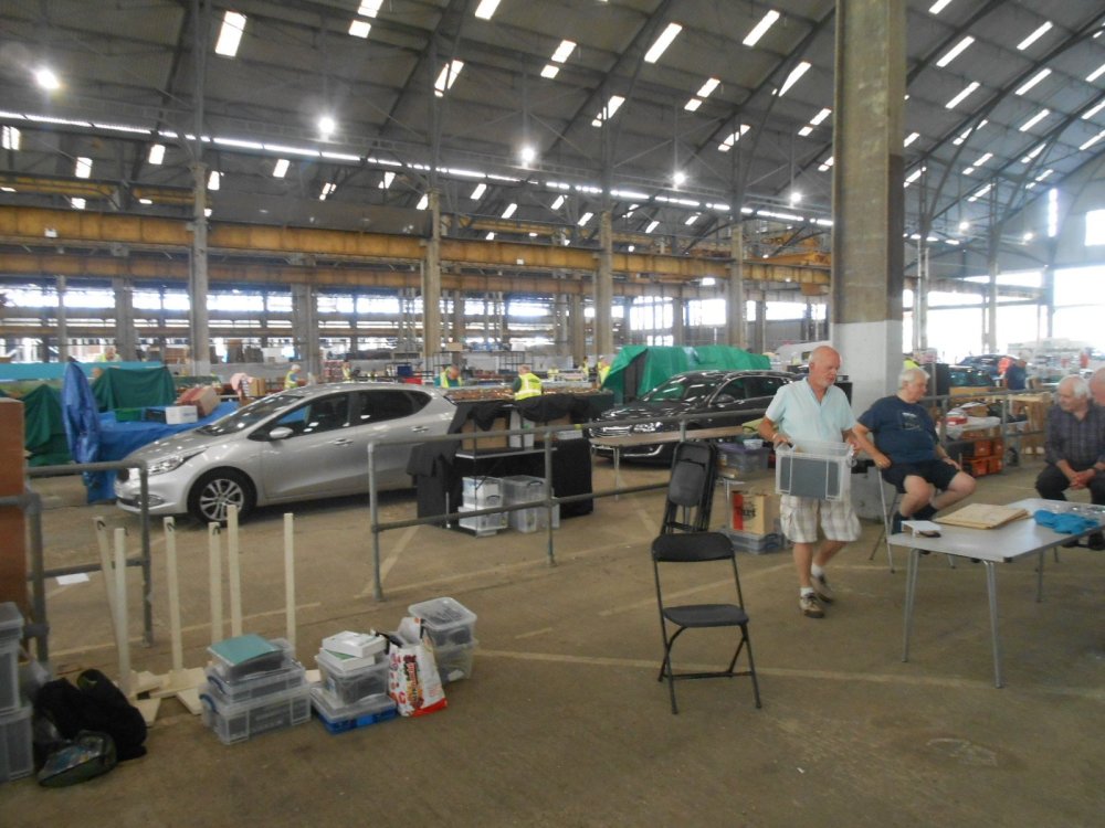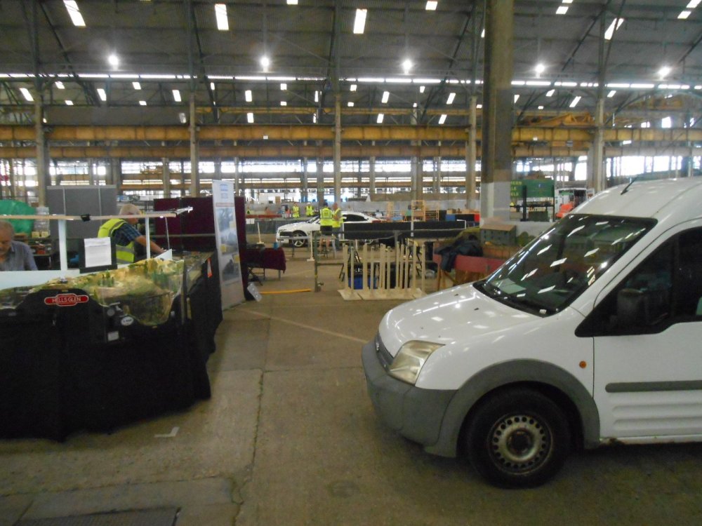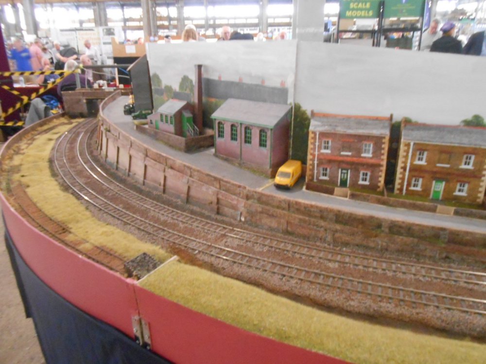 Well, the worst of the amber warning for thunderstorms passed us by, though it was a pretty dark and soggy morning nonetheless. However, in some ways better than bright and sunny, because if the weather is poor at this time of year, you are more likely to seek out an indoor venue than go to the seaside... Considering I supplied around 80% of all the stock on the layout, most of it ran well, though it took most of the morning to work out what trains went best with each loco. In the end, despite hoping to run 7-8 coach passenger trains and 20 wagon goods, we had to settle for half that, mainly because the uneven floor in our area resulted in a significant gradient around part of the circuit. Once that was organised we had four trains in each direction doing 2-4 circuits. Doesn't sound much, but at around 100metres that is about half a day's work on a short terminus-fiddle yard layout. The photos below are just of North Circular, because I was on duty most of the day. As I'm one of the judges for the 'best layout' awards, this should be a good opportunity for pics of the rest of the show tomorrow. Apologies for the shortage of trains - the light was so poor, I was down to a shutter speed of 1/8 of a second!