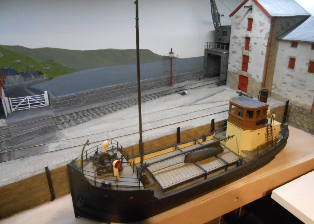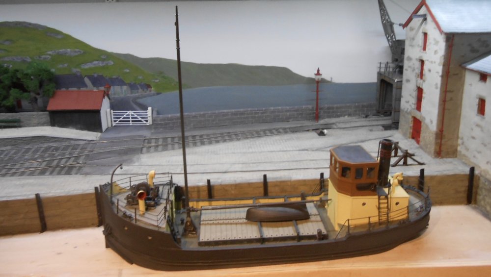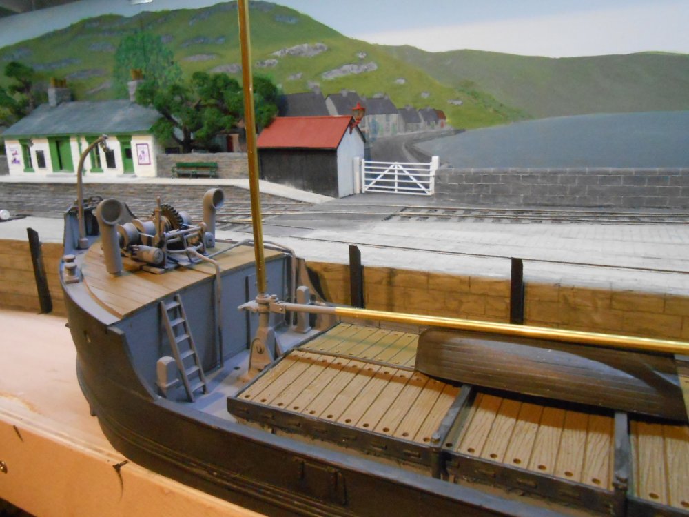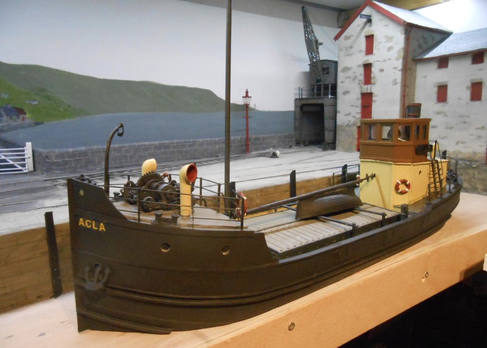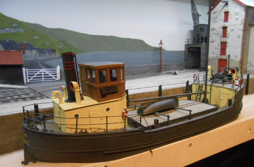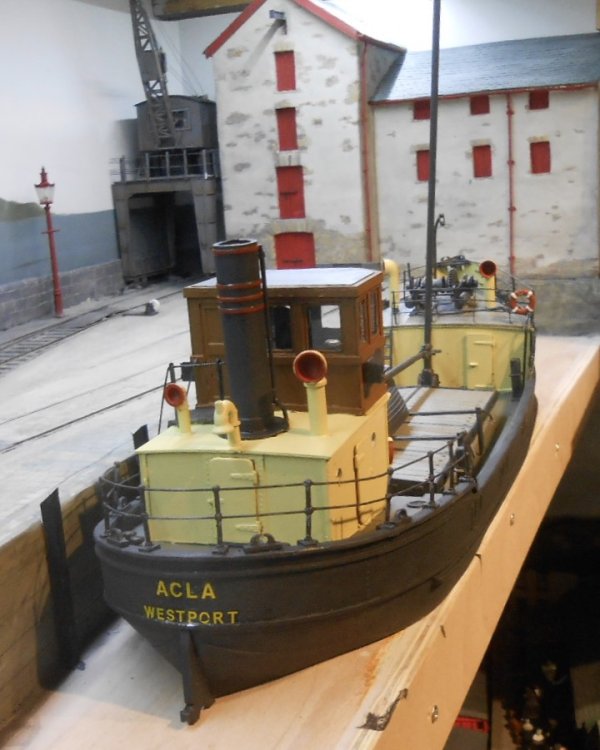 The last few bits and pieces for a few days, as I need to transfer my attentions to getting Fintonagh ready for Cultra. Always best to go through preparations and servicing a few days early - just in case! Anyway, as I'm sure most of you know, it is the little things that seem to take longest, especially when they need painting as well. So, did the four lifebelts and got them fixed this afternoon. Also shortened the mast by 3cm, as it was higher than the backscene, while the derrick's boom now has a bracket on the main superstructure to rest on. Spent the most time on a bit of lettering - though not sure if the yellow text [all I had] is correct, or indeed if Westport is an appropriate place for Acla to be registered, so it may be temporary... As already mentioned, the name is Gaelic for Achill, which seems appropriate as this is a key part of the little coaster's territory. Oh yes, there are photos of the other side too.