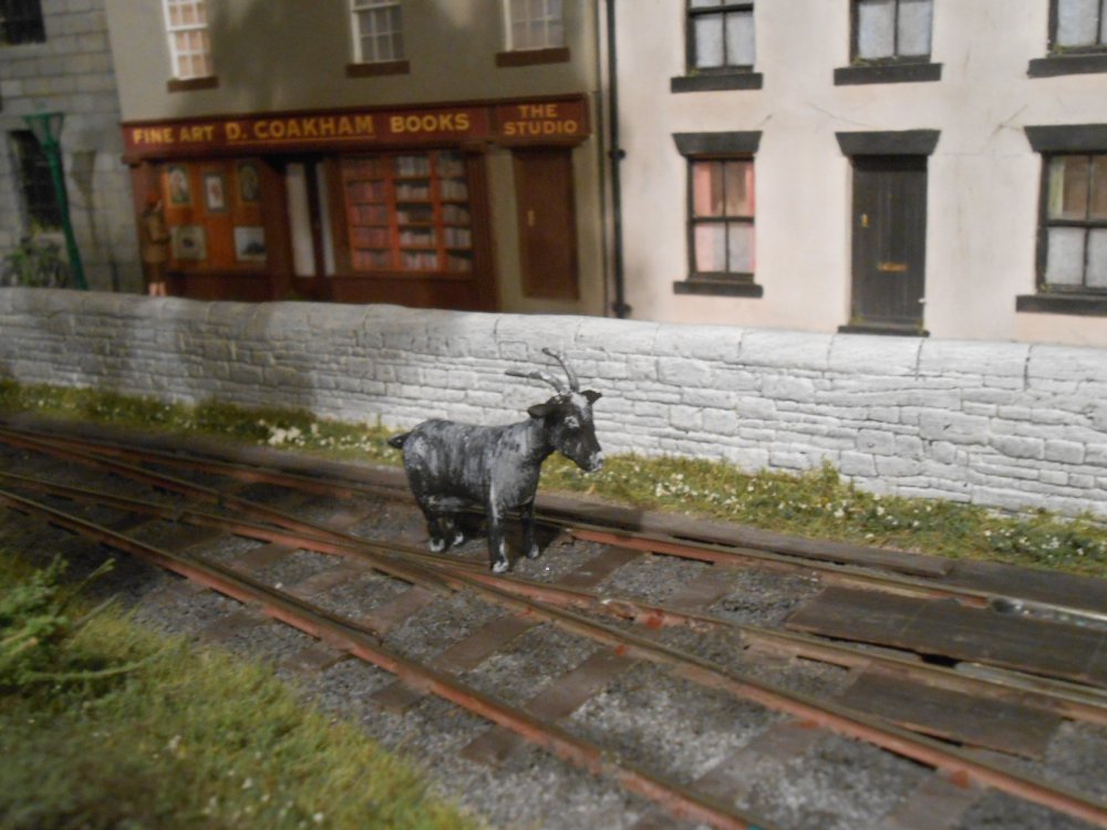 Plenty of gentle filing today has resulted in Maggie looking a lot more goat like. I also added some small blobs of PVA to thicken the hooves and build up the area around the eyes. Horns came next - small lengths of 1.5mm brass wire, filed to a point, bent to shape, then fitted to holes drilled in the top of the head. Decided not to worry about making the figure hairy. In fact, by using fairly thick acrylic paint and a short, hogs hair brush, managed to create a bit of texture. Started with matt black, then dry brushed white and grey on top to highlight the coat, eyes and hooves. Couldn't resist posing Maggie looking threatening, in front of a departing train, though she will actually live under the big tree. Making this little model has been a fun distraction from other tasks. Overall, it has probably taken me about 6-8 hours over 3-4 days. Had their been a suitable figure to buy, then I would have definitely gone along that route. However, making one myself certainly means I now appreciate how much effort goes into making the masters for figures like this.