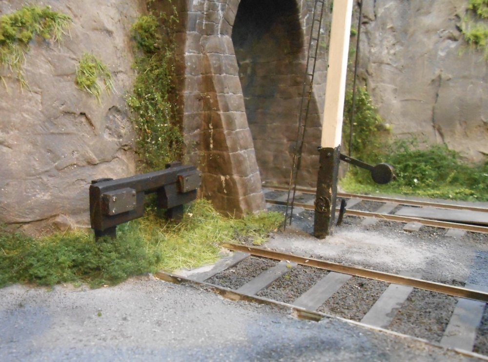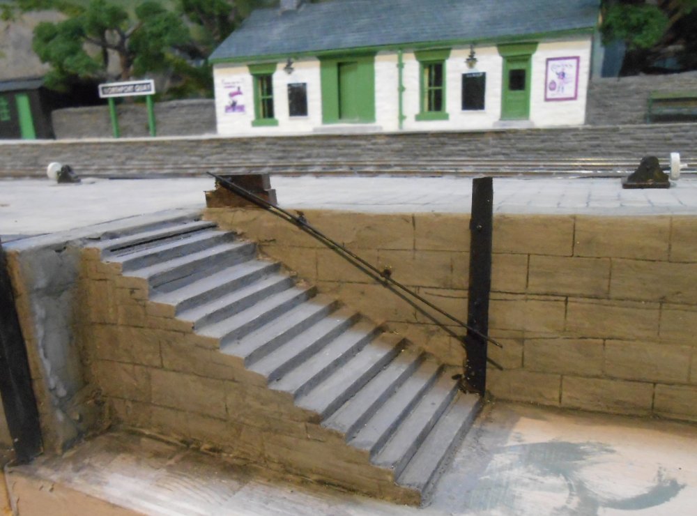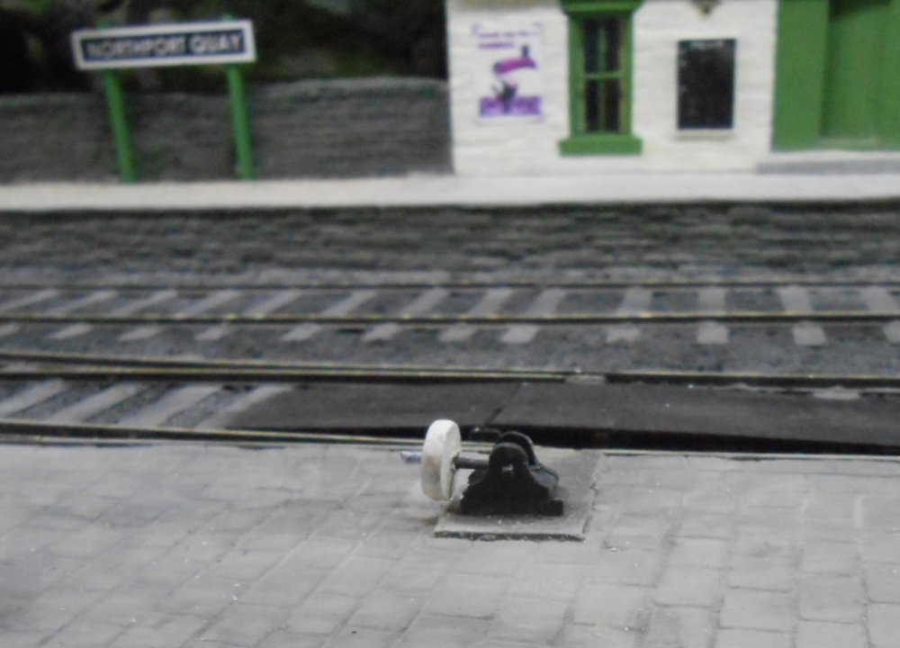 Finally getting back to doing things on the new layout, spurred on a little that it is the Uckfield Show next weekend and it is booked to appear there next year... It's been little bits and pieces mostly - trying to complete key bits of the scenery, prior to building the coaster. So, we have the [non-working] weighted point levers, handrails to the steps going down the quayside and a new set of buffer stops by the tunnel mouth. All very much hand made.. The weights on the point levers are a couple of washers soldered together, while the pivot is a short piece of brass wire and the side frames are plastic sheet, filed to shape. The step hand rails use locomotive handrail knobs and brass wire. Where the handrail rises above the quayside, I've contrived a couple of large wooden block to put the top knob in, because it is right on the baseboard joint. This will hopefully be less likely to be knocked off than a wire post - or indeed to puncture the hand of anyone assembling the layout! The buffer stop meanwhile is recycled from Arigna Town & is very much a locally made affair, as were so many around Ireland. I've also painted out a section of hillside with sky, as it was rater dominating the backscene.