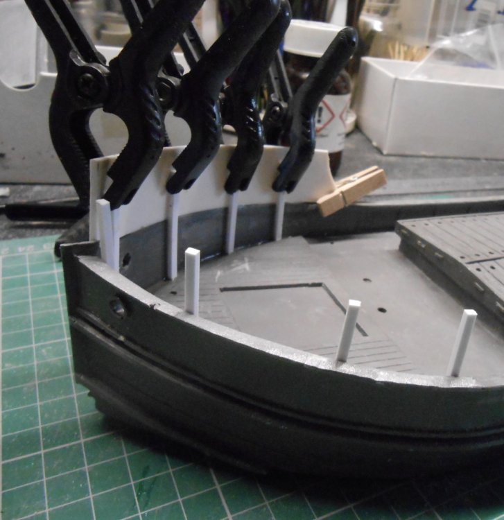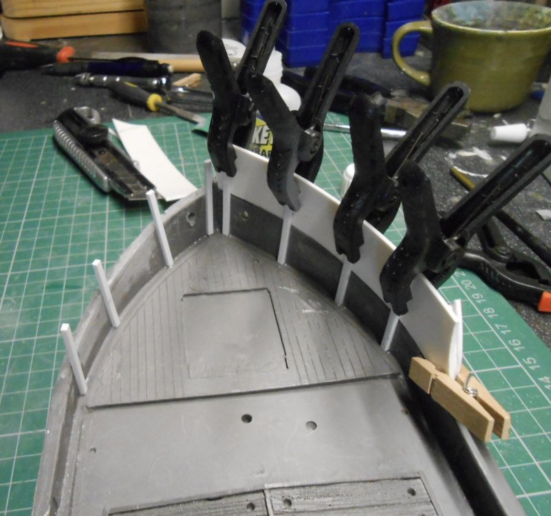 Puffer/Coaster Am almost ashamed to admit that I bought this Langley kit of a Clyde Puffer the best part of ten months ago. Others will keep kits for years, but I much prefer to get on with what I have, so it is unusual for me to have an unmade kit this long. However, the time is now right to get it built - so here goes. I doubt that many, if any, Clyde Puffers ever made it to the west coast of Ireland, while I'm afraid I've never found the design particularly attractive. However, in Chatham Dockyard we have VIC96, a post war naval tender very much based on the Puffers and to my eyes, far more attractive, so this is going to form the basis for my model. There is a picture of the VIC in my Northport Quay thread. It is not going to be a slavish copy & this also adds to its allure, because what I'm trying to create is a small coaster, able to ply its trade between Broadhaven, Westport and Galway. The numerous offshore islands give a degree of protection from Atlantic storms, while there are enough small communities that would no doubt have benefitted from a weekly visit from a little ship. So what's to be done? The only model ships I've ever built were Airfix kits in my youth, but am hoping the skills I've built up since then are transferable! The main tasks are to build up a much more substantial forecastle, plus altering the stern area so that the wheelhouse sits in front of the funnel. The Langley kit is based around a large, heavy, resin casting for the hull, so the first job has been to carefully saw off the small extensions on the bow and then build up the new shape with plastic sheet. The photos below show how far I've got today. The main problem is that there are very few straight lines on the kit, so new pieces need to be carefully filed to fit. Note however, that this is just a subframe [60thou sheet]. An outer layer of 20thou will go on top to represent the hull plates, rivets and so on. Have used cyano to attach the plastic to the resin hull, plus additional ribs made from 80x100 strip to reinforce things.