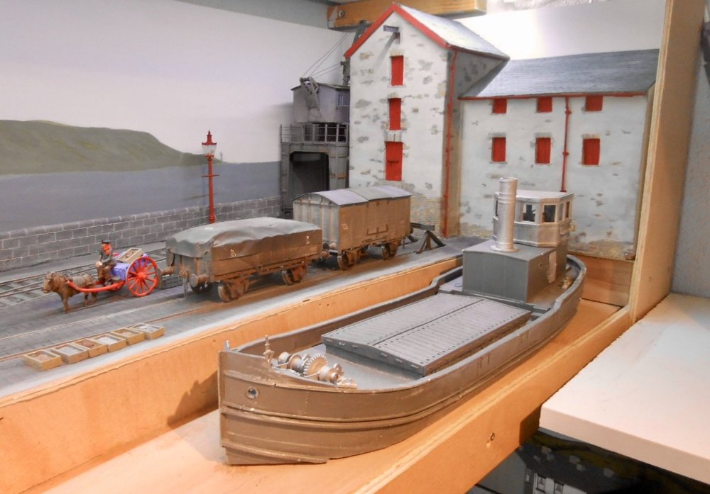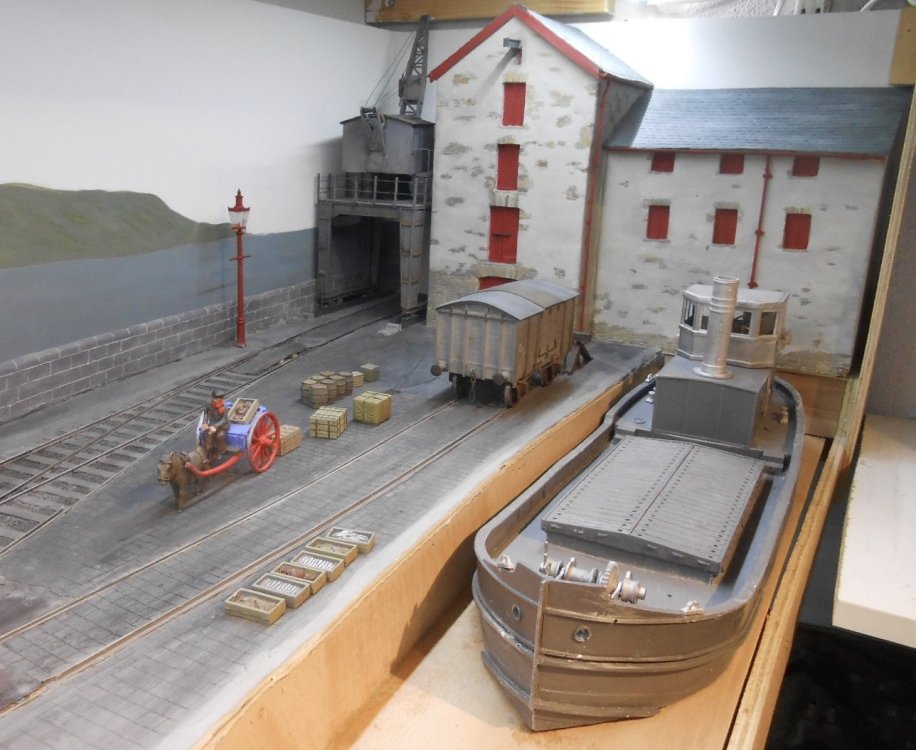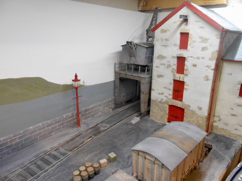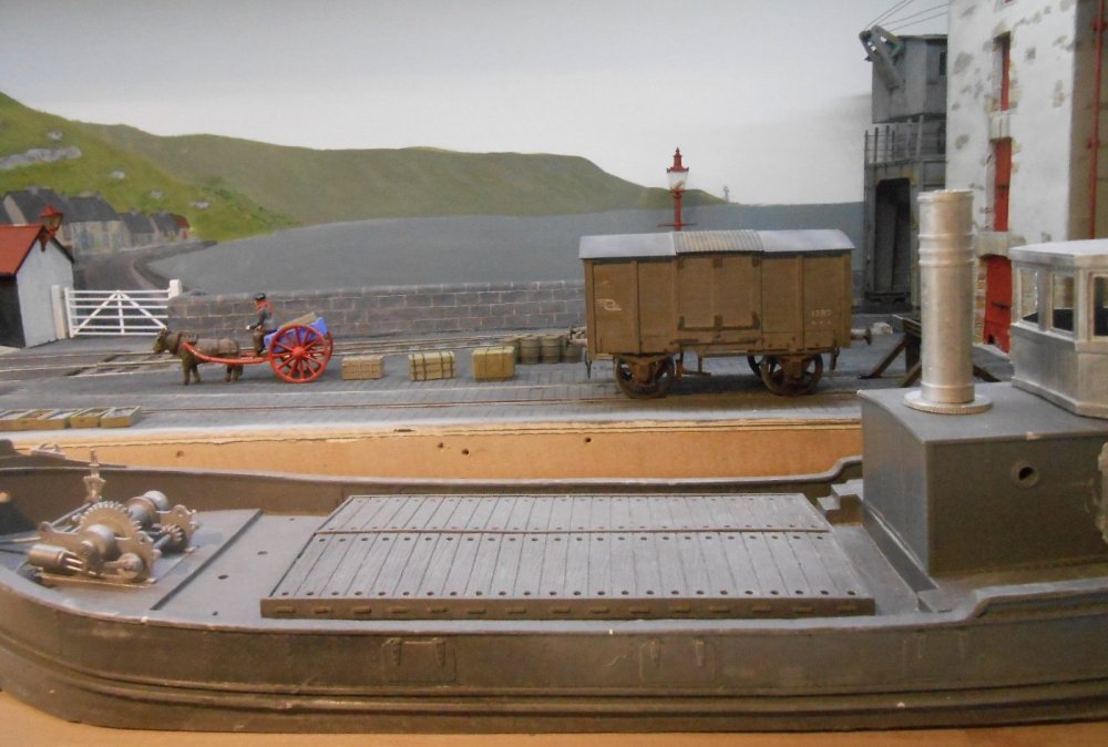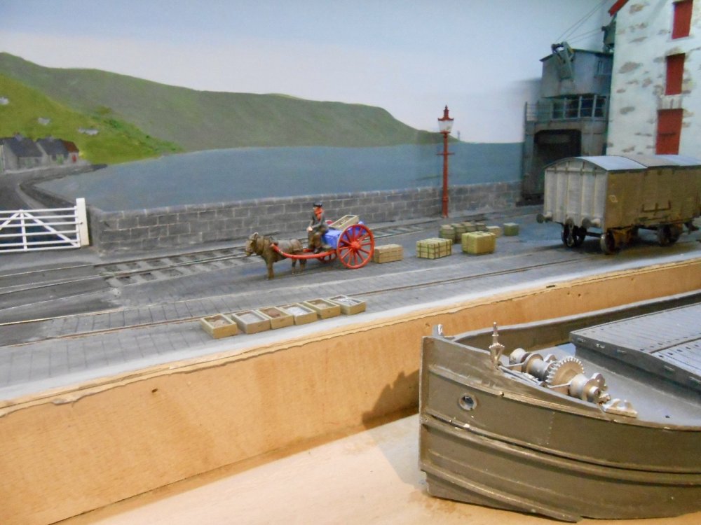 Slow progress, but the right hand board is starting to come together. Mostly, it has been a case of more of the same: gloss paint and chinchilla dust for the road surface and the 'cess' alongside the track, plus lots of DAS [and even more scribing] for the quayside. However, the warehouse is pretty much finished and has certainly been fixed down. There has been a small addition too in the form of a 'lucam' - the hoist at the top, which enables goods to be moved up to/down from each floor. Another small adaptation has been to the mobile crane. After brooding over how the real thing might have been powered, have come up with the idea that, like the Giant's Causeway tramway, it is deemed to be electric. Somewhere out of sight is a hydro electric generator, which feeds power to the rails that the crane runs on. Workmen get a measure of protection from the wooden boards that shield these, plus of course, power is only on when the crane is working. Not entirely sure how plausible this is, but the crane is essentially just a different type of view blocker, hiding the exit along the pier, so hopefully this will do. Speaking of view blockers, a piece of plywood has been added to the front of the far right side, which, when a top pelmet is eventually added, will frame the overall scene. As for the train, it is the 1950s this time and my J19 has appeared with the fish train, the latter an eclectic mix of pre-grouping stock, including one of the MGWR four wheel hearse vans, which were later used for parcels and fish. Like the loco, it is an Alphagraphix kit, while the wagons are scratch built.