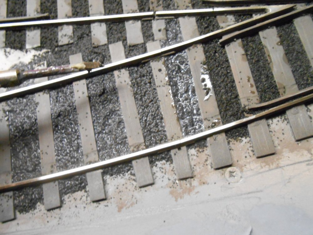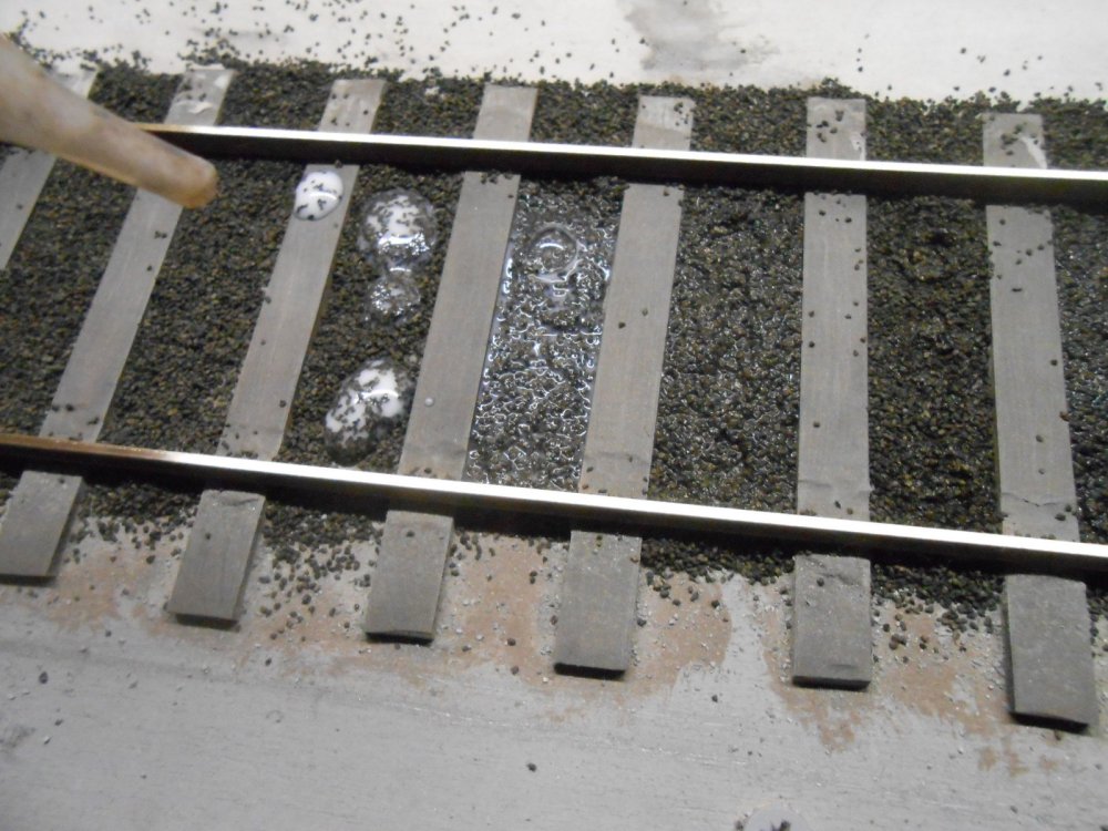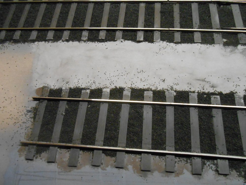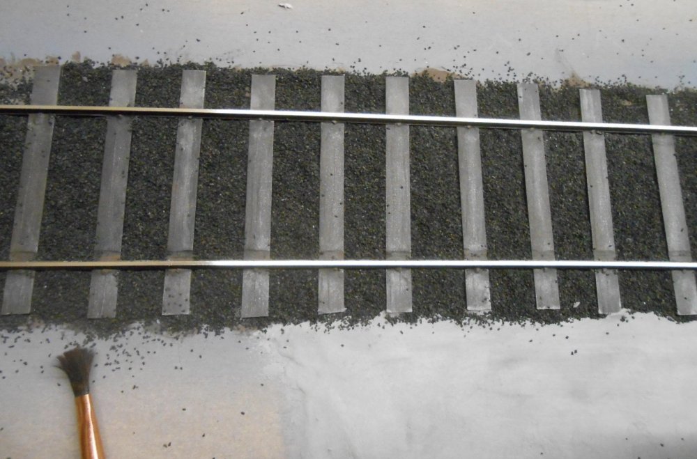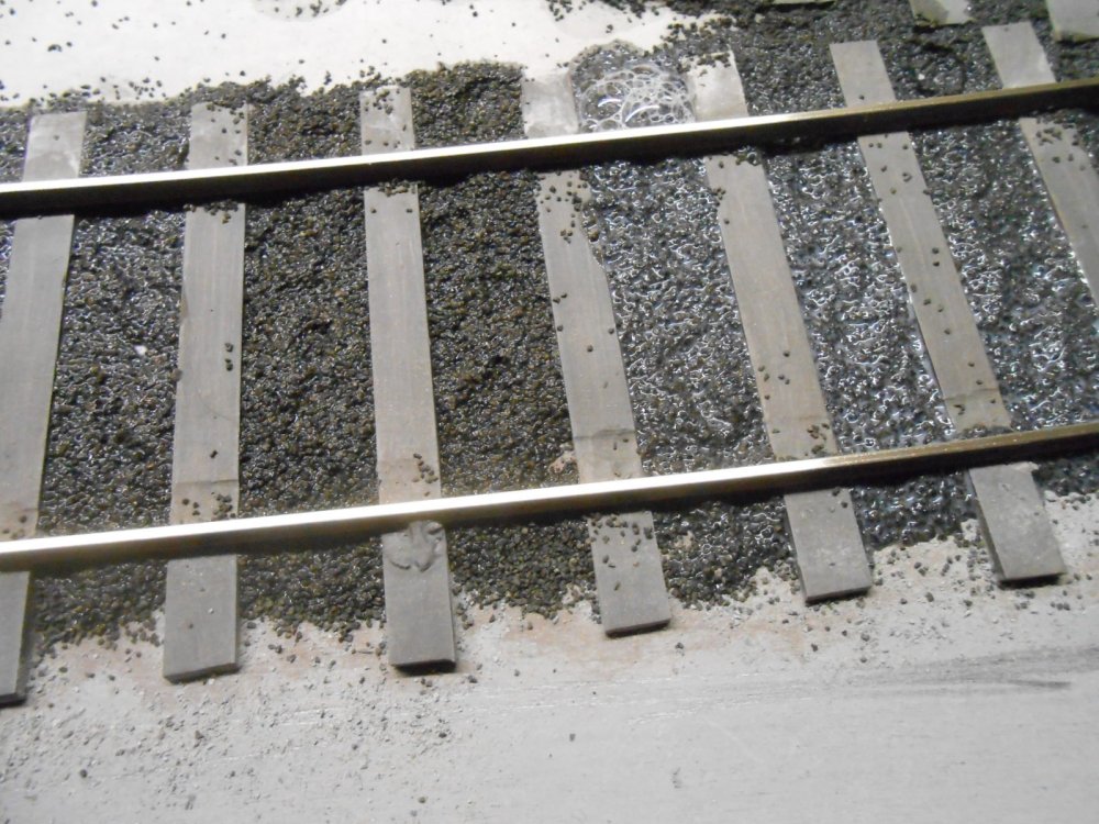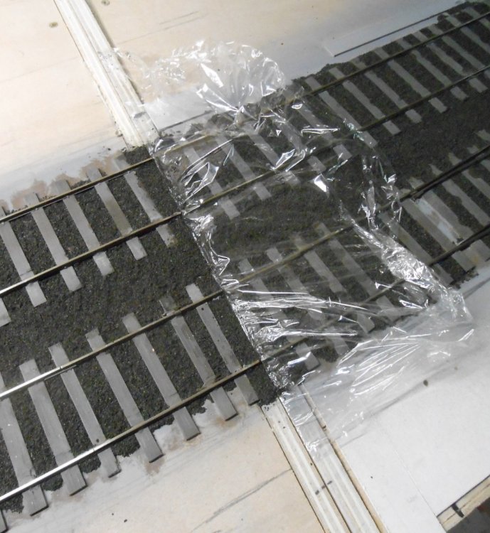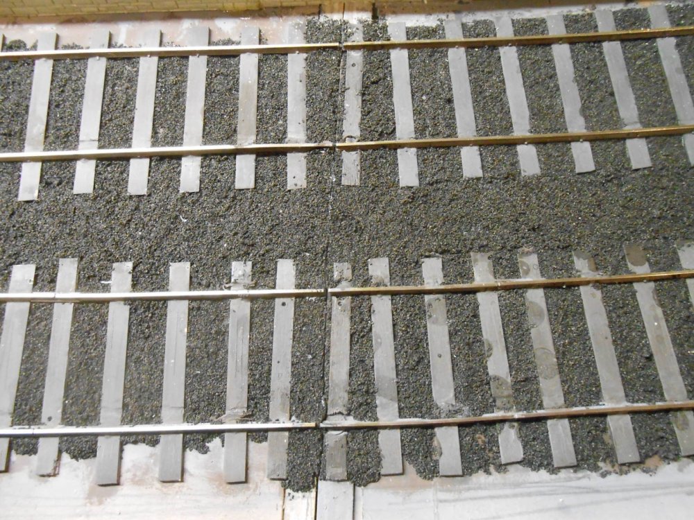 So, now into the multiple phases of detailing the track work. Never entirely sure which bits go first, so as usual, will probably end up doing some parts more than once... This time, decided to paint the track first & began with an overall coat of Precision 'track dirt', which is a sort of a, well, dirty brown colour. Followed this by painting the rails & from here on, my much thumbed copy of 'The Art of Weathering' comes off the shelf. Hard to believe it was written by Martyn Welch nearly 30 years ago, but with its mix of exceptional observation and experimentation, together with which Humbrol paints to use, makes life [fairly] easy. The rails were therefore treated to his 'sidings' mix, which is bauxite [133], gunmetal [53] and matt black, using a fine pointed brush and not worrying overly about fully blending the colours. Hence you get a bit of variation. I then painted the sleepers with a mix of chestnut brown [186] and matt black, plus some gunmetal again, which helps to give the faint silvery sheen you see on well weathered, creosoted, sleepers. Once dry, this was dusted with grey weathering powder, though some areas will be dry brushed with gun metal later too. Martyn also suggests using a very fine brush to add small dots to suggest knots. At this point, used some stone coloured DAS clay to create an impression of the yard surface immediately beyond the ballast, while a thicker layer of this is going to be used to form the stone blocks of the inset track later. And so to the ballasting. Every time I build a new layout, am reminded just how tedious this process is to get right, especially as I generally use Woodlands Scenics 'fine ash', which is probably a bit lightweight, but nevertheless, for me, matches the size of ash ballast in 7mm scale. The first step is to carefully spread it between the sleepers. It gets everywhere of course, so a combination of fingers and fine paint brush get it off the tops of the sleepers. A mixture of PVA, 50/50 with water and the usual drop of washing up liquid is then dripped on to the ballast with an eye dropper. It still tends to form small balls, but these soon dissipate, after which you got round again and drip more on. Finally, I use a small screw driver to poke and flatten the ballast around the sleepers, dipping it in water from time to time, which seems to help. There are probably easier ways, but it is what I do and once the whole lot is dry, further treatment will be needed with weathering powders and so on. Told you it was tedious!