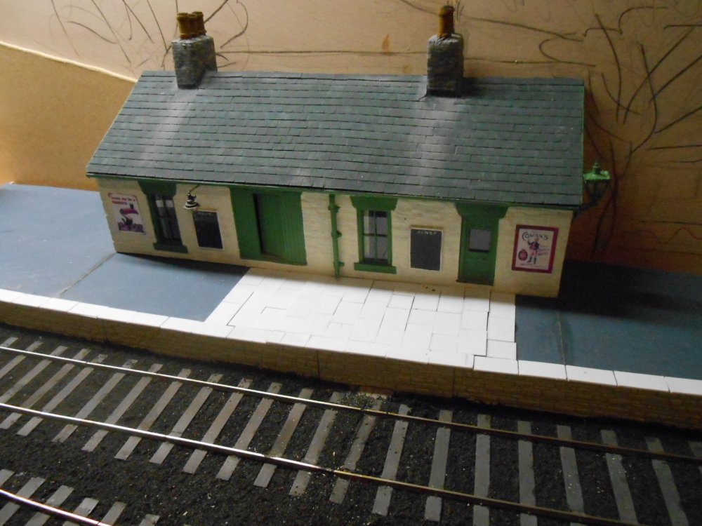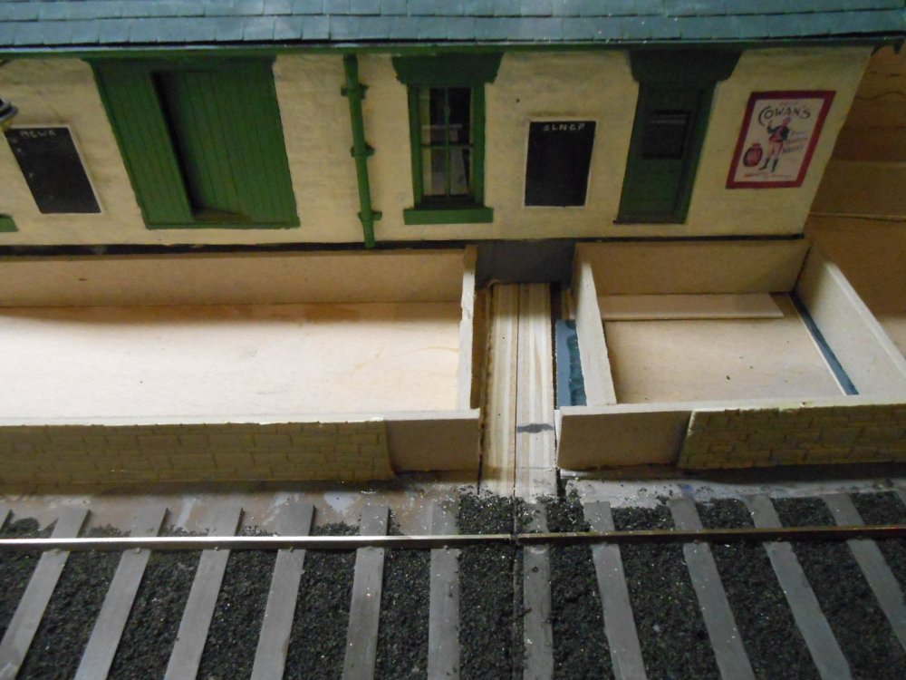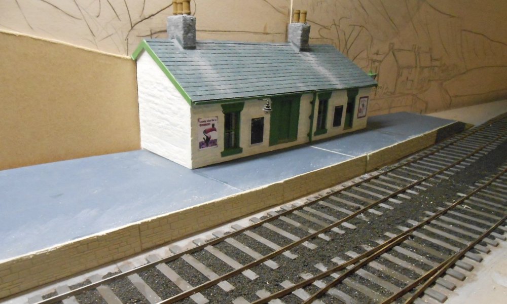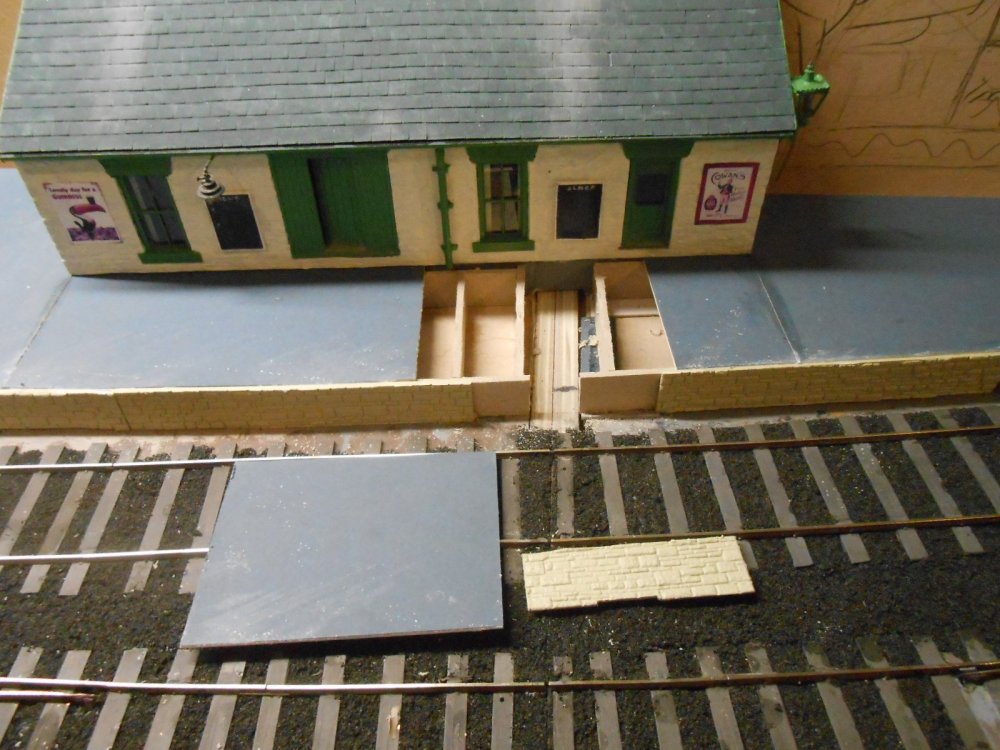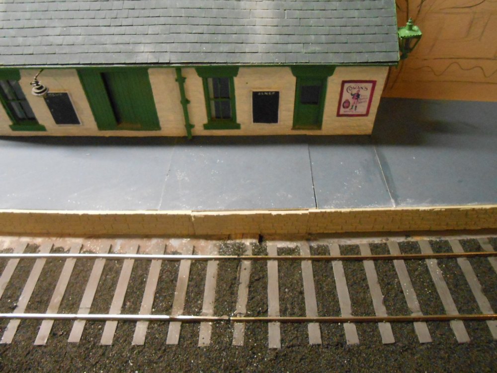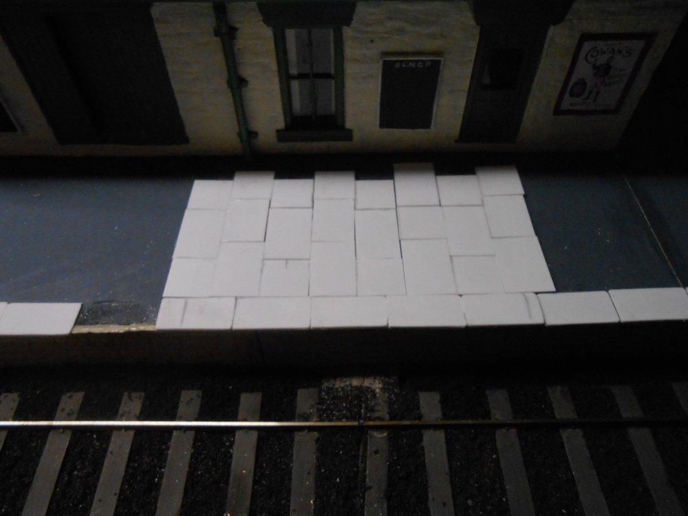 Attempting a bit of subterfuge Attention has turned to the baseboard join area. Only the one, so it makes sense to try and hide as much of it as possible. Step one is the ballasted track, where I've used a trick taught me by Gordon Gravett. As with the baseboard surface itself, a sheet of clingfilm is sandwiched between the boards, which are then done up as tight as possible. A couple of teaspoons of ballast are then mixed with undiluted PVA and spooned over the join, then pressed into place, either side of the clingfilm. Allow to set overnight & then separate the boards and remove the clingfilm. Step two involves the platform. For this, I've created a removable section. The platform wall has been made of a subframe of 'greyboard', which is twice as thick as mounting board. I've also used strips of greyboard as the foundation of the platform itself. The platform wall is covered with a layer of Wills stone sheet. Intended for 4mm scale, I find it looks ok in 7mm. My supplies are running low, but managed to find enough pieces to cover the wall - albeit in a range of finishes! The removable section is about 7cm long and I then glued a slightly longer length of mounting board to this, which forms part of the platform surface. Coping stones have been made from 20thou plastic sheet, with a piece of 20x30 thou micro strip glued to one edge to make it look thicker. More 20thou was cut to represent paving slabs, then likewise glued to the mounting board and like the coping stones, arranged to overlap either side. This then forms a single removable piece which [hopefully] will disguise the baseboard join, by breaking up it up across the whole width. It may be necessary to add a couple of heavy white metal figures on each side to hold it down, but fingers crossed, that shouldn't be a problem.