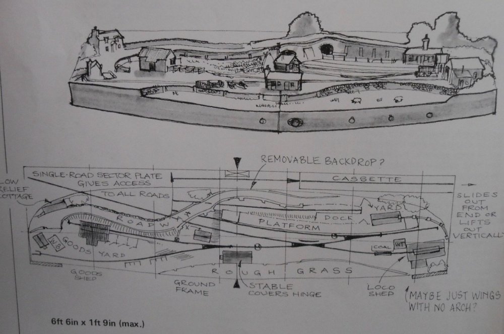 Ok, here are a few ideas. First up, Cyril Freezer's 'Small Layouts'. A bit dated now, but worth a look, because there may be something you could adapt. My favourite layout designer has always been Iain Rice. Always appealing and practical, but also so clever. The one below is what I based my Northport Quay project on This next one is based on Llanaster, one of the first exhibition layout to do away with the entry points to the loop - using a sector plate instead. This next one I have always thought particularly clever, arranging three small layouts one above the other on wall brackets. Trains progress from one scene to the next via a cassette. This one [above] was actually designed for 7mm scale, but should reduce to your parameters in 4mm. Idea to avoid are things like the two below from Barry Norman. Usually love his ideas, but when you look at these, you'll see that your locomotive will spend most of its time hidden off scene! This one I DO like though. It is a fairly accurate rendition of Wantage Town, minus the tram shed. However, even with the latter the whole scene needs just 7'2 in length in 7mm scale! Been there, done it & it works really well. Finally, a new book I picked up at Railex, by James Hilton & published by Wild Swan. It takes a fresh look at micro layouts, some of which are very simple indeed, but explores the concepts scenics and operation with each plan. Hope this helps!