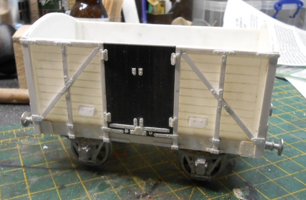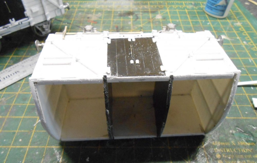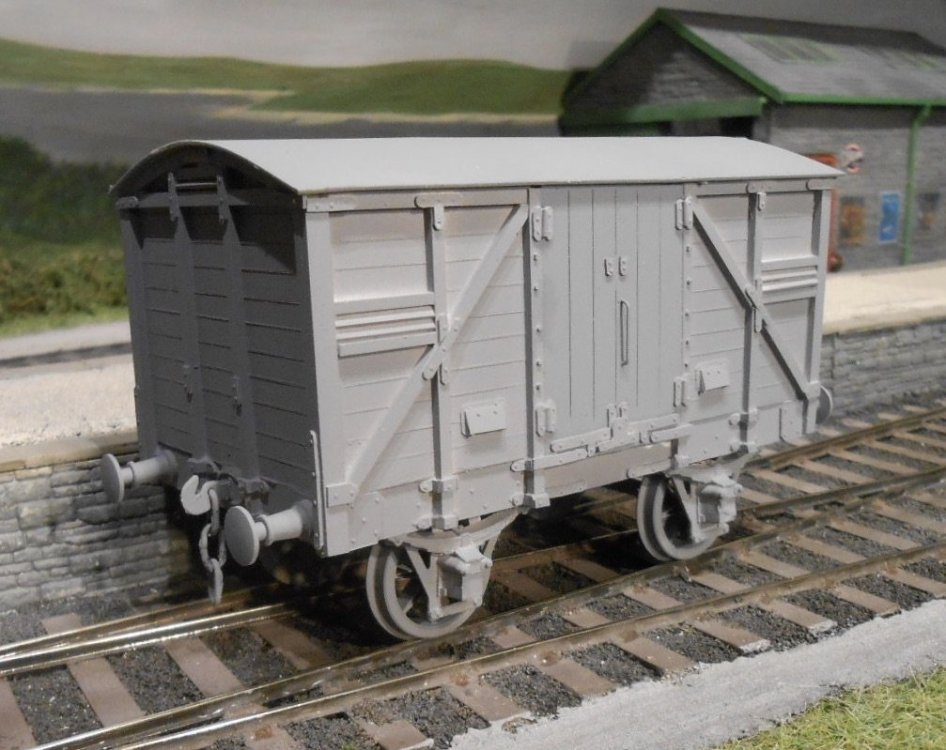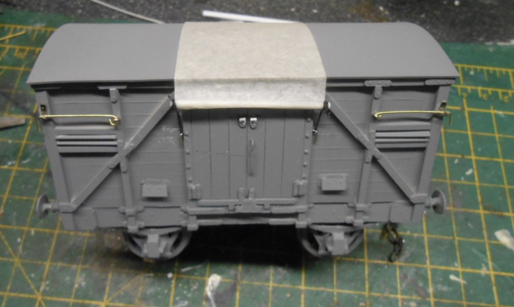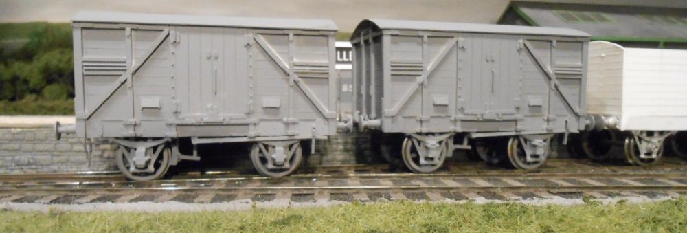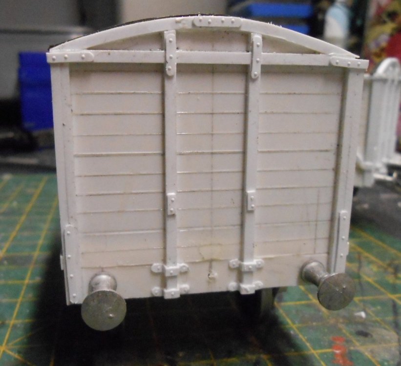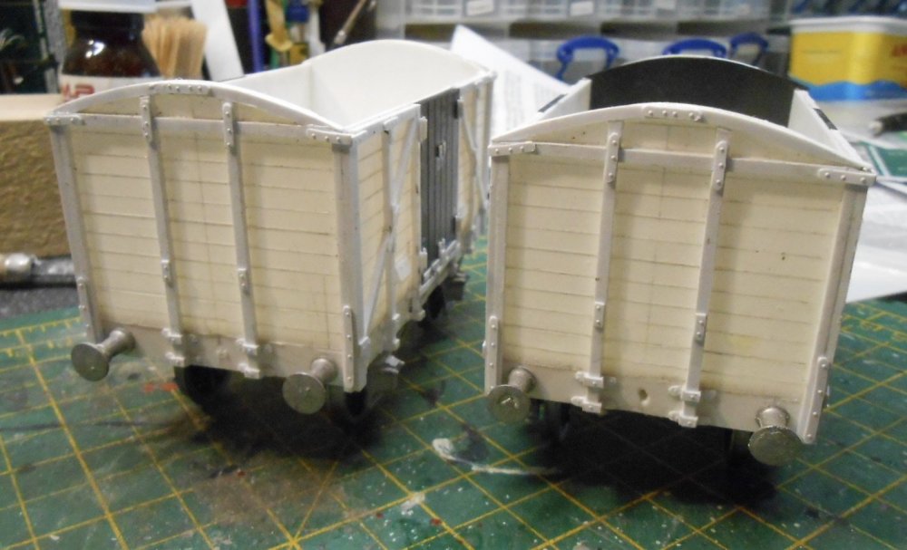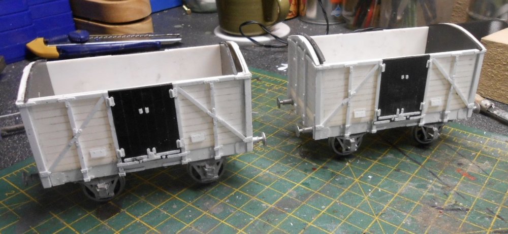 Finally managed to finish the two wagons. Has taken around 24 hours modelling time for the pair, so not too bad I guess, given the number of pieces and amount of work. Most of the final stuff was making the louvres and then it was a case of fitting the roof. A small moment of inspiration here came from a photo of a converted turf coach, where internal boarding resulted in thicker than usual sides. Seemed to me this idea would be useful to help fix the roof better, so added 100 x 40 thou strip all round, then filed this to the profile of the roof. Hence got a good area for the D-Lemonine to do its welding. This solvent really has been useful. It may take longer than MEK or similar solvents, but the evaporation is much slower, allowing plenty of time to position the roof, whereas MEK evaporates like mad, so much so that if you left the lid off the bottle I suspect most of it would be gone in an hour. Anyway, an all round scrub with the glass fibre pencil, then a wash in warm water & they were ready for priming. Actual painting and lettering must wait until I've done the two GSWR vans first though.