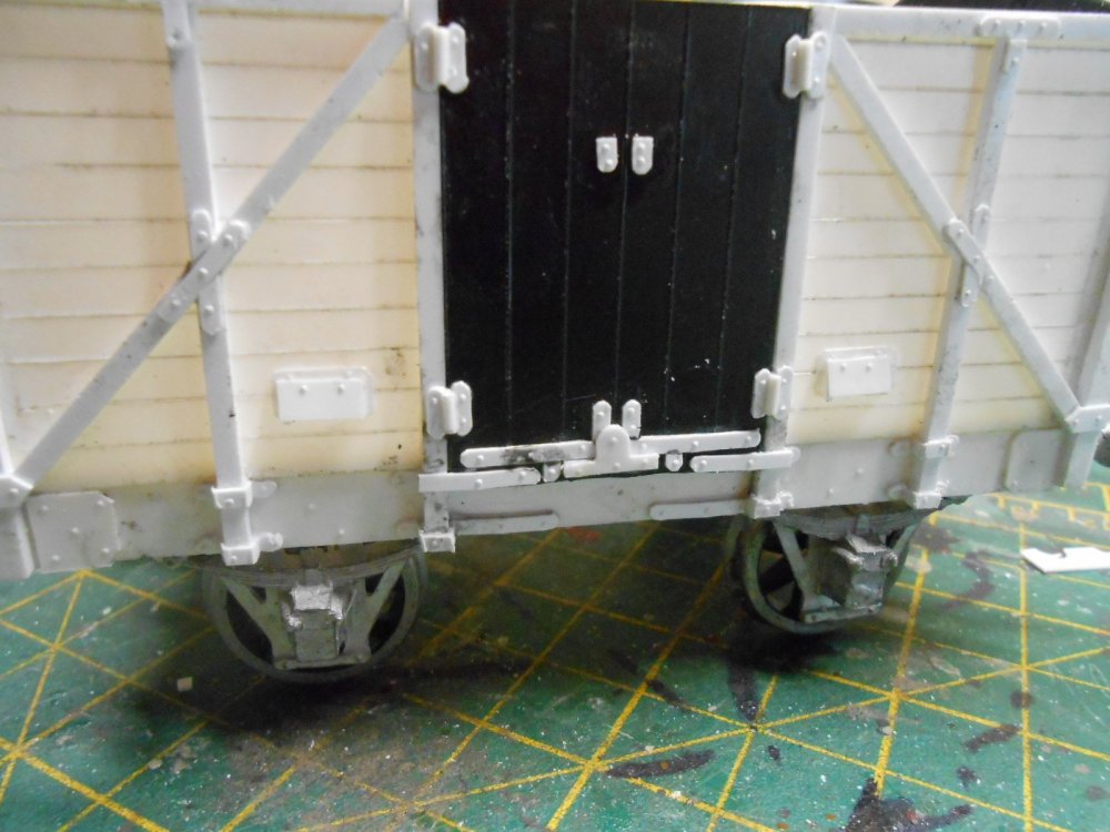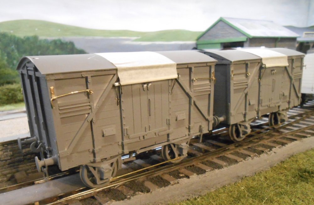 Just when I thought I'd finished building the MGW vans, was looking through Ernie Shepherd's bible on the railway and discovered the lovely photo which Roger had clearly used as part of his planning for the Alphagraphix card kit. Up till now, I'd been using the latter, along with a rather grainy photo of the prototype, which I now know is a copy of a print of a copy etc, etc. As the cropped details show below, there was not only the bracing between the axles to add, but the canvas roof [and associated fixings], along with some hooks and brackets to hold the doors open. Hence spent a couple of hours this afternoon, faffing around with all manner of things from plastic strip brass wire, tiny eye rings [from the Dingham couplings etch], masking tape and thin cotton to create all of the above. Hopefully you can work out what went where from the photos.