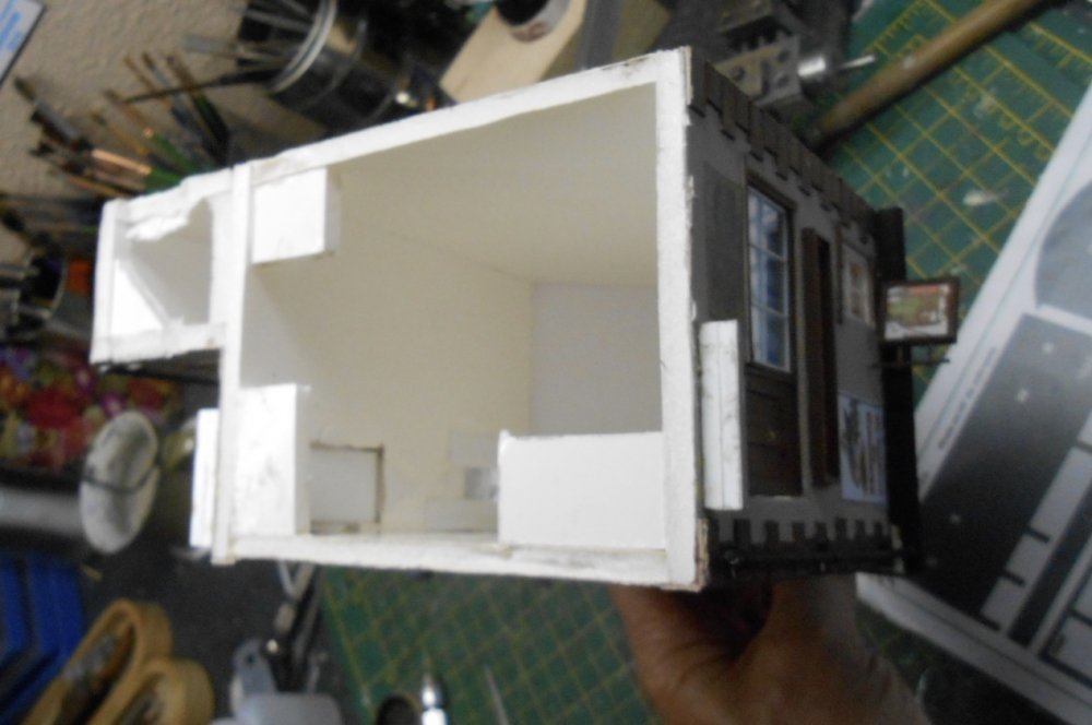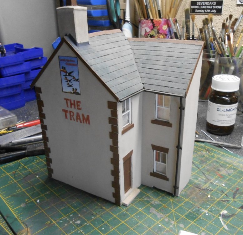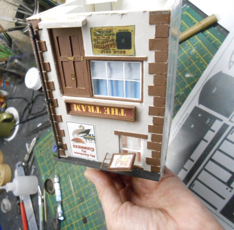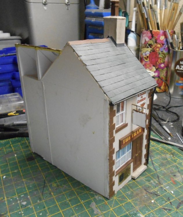 Thanks John and indeed everyone for the kind and positive remarks. Retired these days and Covid 19 certainly enables plenty of spare time. However, even when working [I was a primary headteacher and then schools advisor], doing 80-100 hour weeks in term time, found that a bit of modelling time was very important for my well being in what was an often stressful job. Much of this type of modelling is essentially fairly simple and repetitive & like most apparently complex things, breaking them down into easy stages is half the battle. I guess that is where experience counts, though believe me, I regularly still get things wrong. The Tram Inn, see pics below, is indeed fairly small - mainly because it is only half relief and designed to blend into the painted back scene. As you can see, it is made from 5mm foam board, covered in watercolour paper and then painted to look like render. Have turned it upside down, partly to show the construction, but also to show one of my favourite dodges for making guttering, where I just use 80thou plasticard, rounding one edge to look like half round. From a normal viewing angle, it can't be seen & is very quick and easy to do. Buildings are a good way into making something from scratch, because they don't move, so you can concentrate on making them look nice. Would say making wagons is probably a good first step with rolling stock, but coaches and locomotives do require a fair bit of skill, however there are some nice kits out there to get you started, while there are some excellent threads on this site with folk adapting ready to run models to Irish prototypes too.