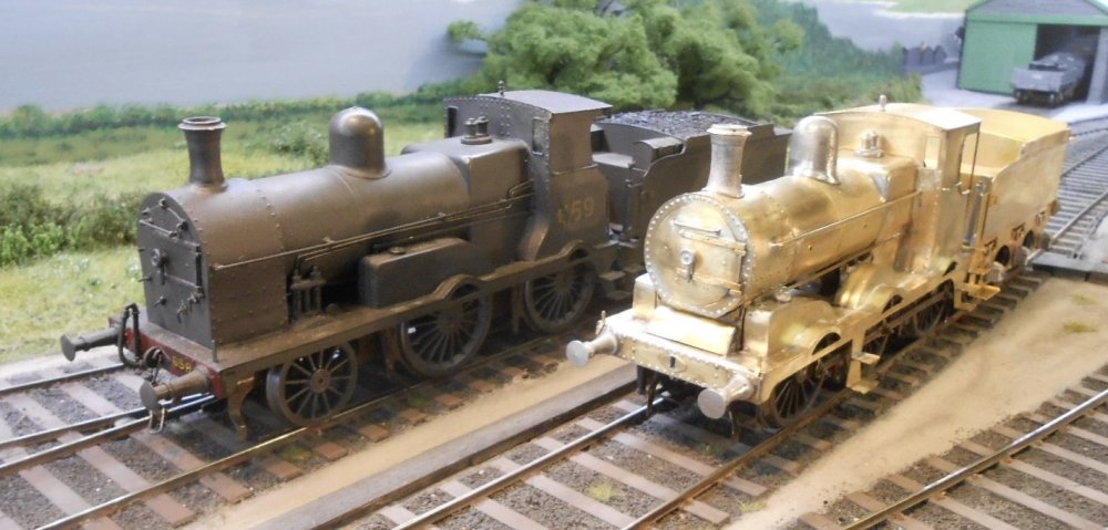 Ready for the paint shop? Well, a primer/witness coat anyway. Thanks again for the reassuring messages about the look of the J19, they gave me the confidence to press on and complete the model. On the loco, most of the soldering work was done, so it was out with the 5 minute epoxy to add the boiler fittings, buffers etc. The chimney and safety valves were fine, but the dome was certainly not at all like the prototype. However, as it was too big, it was a fairly simple case of filing and sanding it down to something more acceptable. A good trick when fitting chimneys and domes is to wrap some sandpaper around the boiler and use this to get them to sit properly. Have always used 5 min epoxy for boiler fittings - even the turned/cast brass ones - because it gives you just enough time to set them up, rather than using solder. Another slight anomaly with the kit is that if you are modelling a J19, the sanding operating rods are too short, though brass strip is easily substituted. After that, it was a case of tidying up - lots of it. I try to be really careful here, not least because of my mediocre soldering, but also because it is rare to get a kit where everything fits perfectly. It may have been designed with close tolerances, but half, even a quarter of a millimetre here or there in construction and you soon start getting unsightly gaps that need filling. Unwanted blobs and runs of solder too, while the paste flux I use always needs an extra clean. So, lots of work with files, emery boards, scrapers and the like, followed by applications of car body filler and then back to more sanding and scraping. There are still one or two obvious bits left, but after a while it all gets a bit tedious and fingers protest at the number of glass fibre brush splinters they pick up. Plus, over the years, have come to realise that you never get it right first time, so stop, wash and clean with 'Shiney Sinks' cream cleanser. Very occasionally, the first coat of primer does cover everything, but mostly you need a second round of filling, so why torture yourself for too long? There was the tender to do, of course, so the loco body was put to one side for a while. As with the loco, the tender chassis is a delight to make, being another single, fold up etch. Indeed fitting the brakes took most of the time, but the chassis was easily done inside a couple of hours, including springing for the centre wheels. The tender body is likewise pretty straightforward. Half etched lines help with curving the flare on the top edges and there are not that many parts anyway. The only two additions I made were firstly to reinforce the bottom edges of the cosmetic outside frames and secondly to make the brake standard stronger. The outside frames etch is very thin, probably only about 5 thou, so they warp when you solder them to the body. Thin brass strip soon beefs things up. As for the brake standard, always wonder why anyone tries to make these things in cast whitemetal - a material that is far too weak. Sure enough, the handle broke off almost immediately, so replaced it with some wire, soldered to some brass tube which was then fitted into a hole drill in the top of the standard. A few more castings to fit & all that was left was the drawbar. Not sure what went wrong here, but the model fireman would need to be an Olympic athlete to jump the gap with a loaded shovel - it must be about two scale feet! So, made a new one from brass strip. There are still more things to do of course - a raised cab floor and fall plate, plus some dummy inside motion. At least it runs fairly well [better when run in and properly cleaned], though it sits 0.5mm high as have needed to use some 20thou Plastikard to stop the driving wheels shorting somewhere inside the splashers. Then there is the painting, lettering and weathering, adding coal, crew, couplings and so on. So, still a fair way to go, but the next time you it, the shiny brass will have gone. There is something rather nice about a polished brass model, but needs must! The final picture shows the J19 next to my G2. Hopefully, they will make a nice pair.