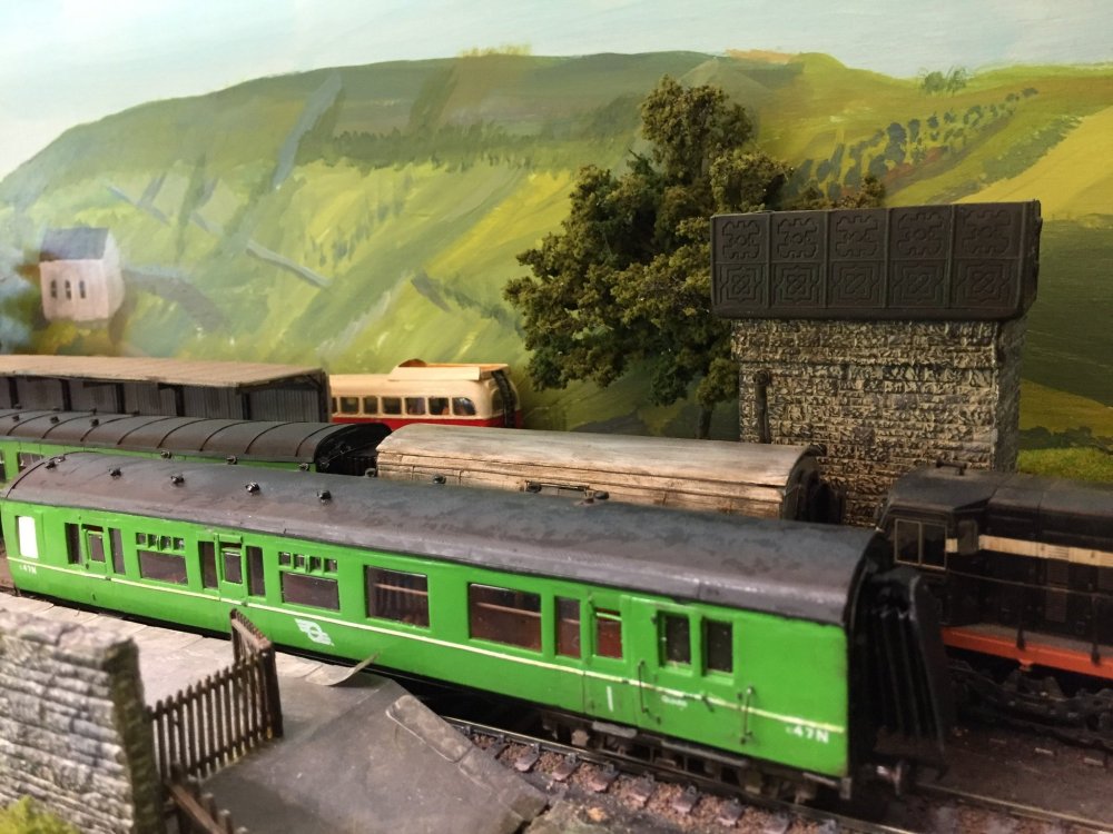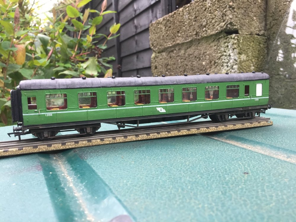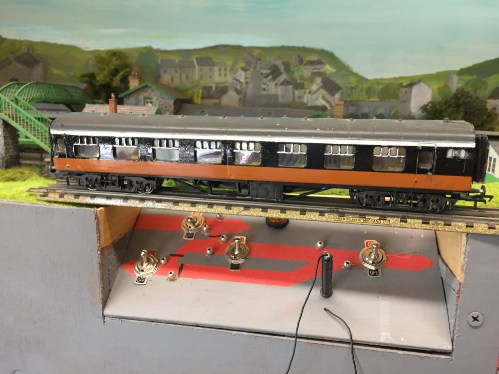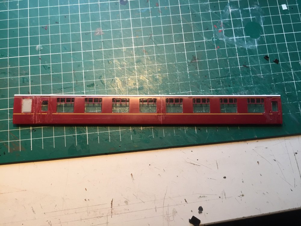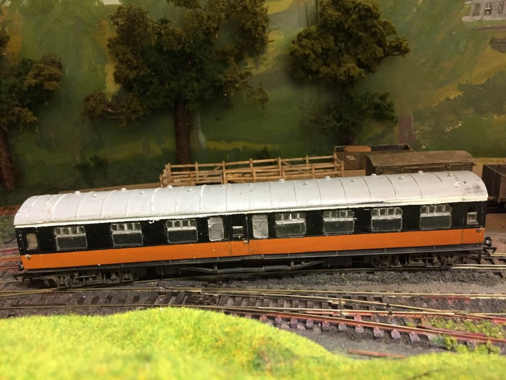 I mentioned at the outset that this build was not straightforward. The original objective was to create one of those distinctive 1951 to 1954 coaches with a door and WCs in the centre. The strategy was to improve something I had built a good many years ago, using the Hornby LMS Stanier coach. This was based on a rather clever conversion detailed in an issue of New Irish Lines (which I now can't find and therefore cannot credit the author). Essentially, you cut the Hornby coach in half, glue one of the ends to the middle and add a new door at the end. As I say, clever. However, I discovered it was rather short in overall length and therefore decided Plan B might be the way to go........ Note this photo was taken just as I was about to take the whole thing apart; I have no idea why I painted the roof in that light grey! Still, I think the idea has merit and mY return to it at some stage. Glover