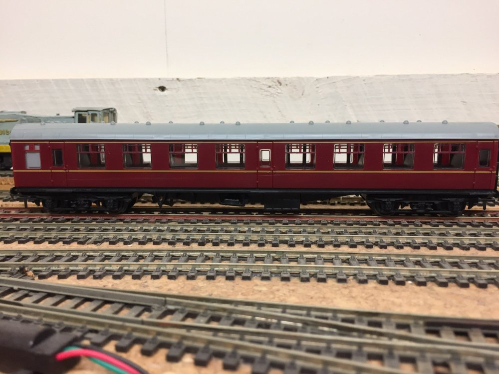 I have numbered my coach as 1356; one of the 16 open standards built in 1953. It's all scratchbuilt from various thickness's of plastic, largely following the methods set out by Geoff Kent in his series on coach building in the Model Railway Journal some years ago. Even if I say so myself, the roofs are getting better but still far from perfect. The bogies are from the BR Mk1 coach distributed some years ago with the Hachette partwork on model railways. I attempted to make the bogies a bit more like the GSR bogie which was fitted to these coaches originally; I think some at least might have been given Commonwealth bogies later in their life. This photo is for all the little boys..........it is quite possible that this length of Hornby-Dublo 3 rail track was manufactured at Binns Road Liverpool in or about the same time as the prototype of this coach was built!