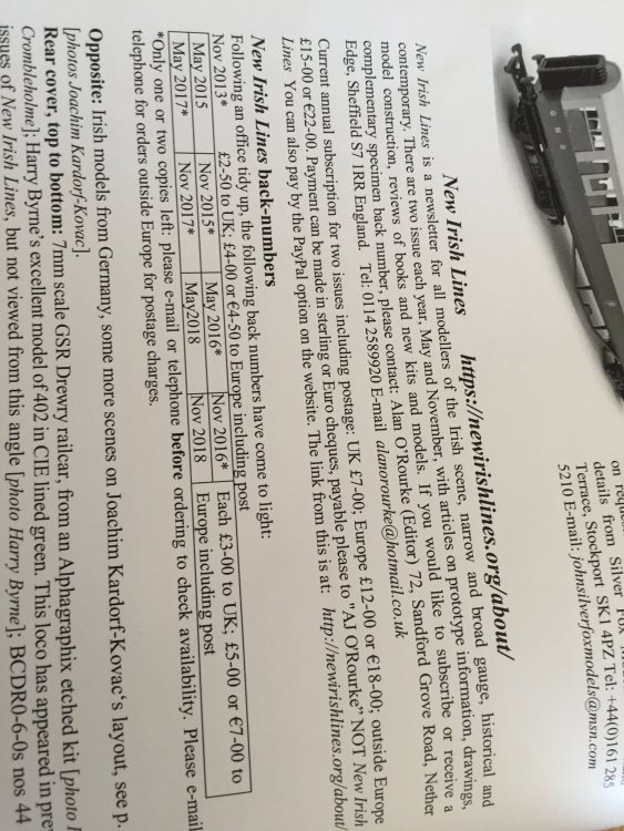 Very good issue. David Holman's 'Fintonagh' layout on the front cover with a full article inside. Another layout is covered by photos, this being Kilkenny using 21mm track, modified it seems from Roco track. This layout was built by a German man. Clogher, on the Clogher Valley Railway is also featured. Ballyglunin (alias ' Castletown' in the Quiet Man movie) is the Station Survey, which also includes an insert with plans of the station building. The GSR loco drawings have now moved on from steam; this time they cover the Sentinel Railcar, two versions of the Clayton railcars, the Drewry passenger railcars (inspection saloons?) and the Turf Burner; can we not just let that contraption go?! There are also plans for Belfast & Northern Counties (later NCC and then UTA) goods vans. Colm Flanagan covers a conversion of a Bachmann J11 to Belfast & County Down loco No4 while Jonathan Beaumont details the use of grey by the GSR and later CIE on their steam locos. A couple of interesting photos: Magherafelt in or abouts on the old, and to me mysterious , Derry Central plus GSWR restaurant car number 343: very tempting to model! There are some other pieces plus some news items but overall, a very enjoyable and useful issue. Glover