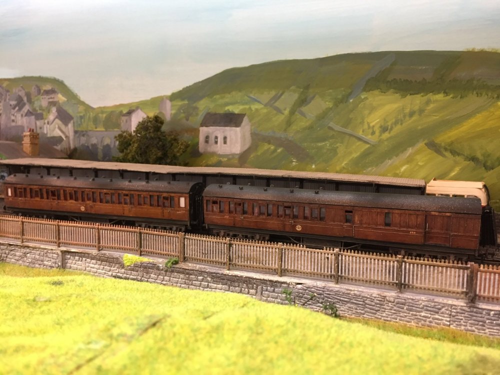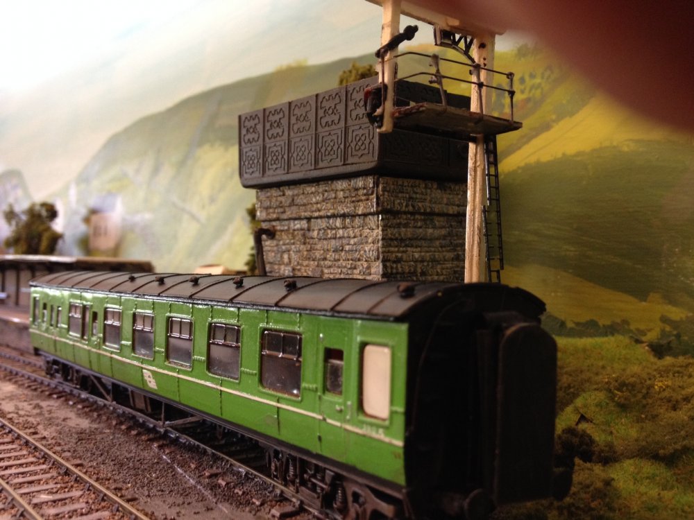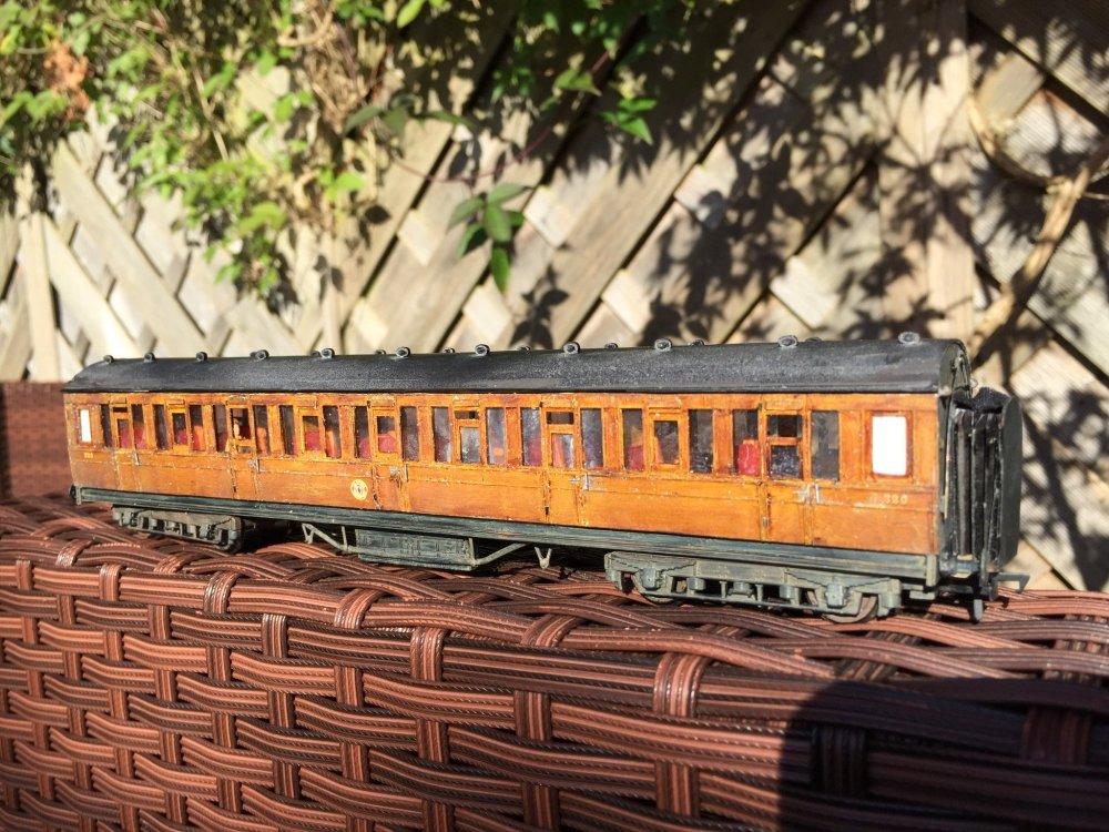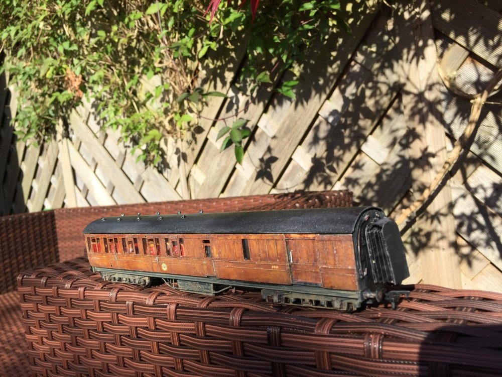 This is most certainly a first for me. The varnished wood livery was achieved thanks to a piece on RMweb by Mike Trice. Google 'painting LNER model coaches' or something similar. Essentially, apply a white primer and then a base coat of cheap acrylic paint in a colour like orange or yellow. Then a mix of burnt umber (artists oil) and something called Liquin Original, available in art supply shops. Apply this mix with Golden Taklon brushes. Finally, varnish to taste. It's actually as simple as that and I have to say that I am well pleased with the end result.