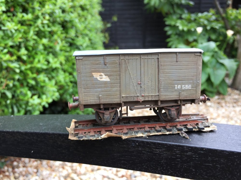 It's been a while...... Anyways, I keep a quarterly record of work I have done but Q2 (April-June) was a very lean period due to a lot of travelling and the snow in March (remember that?). In order to get something on the record, I did a quick wagon project at the end of June. Really, two things came together: seeing a photo on a Flickr website put up by a Brian Flannigan ("Irish Rolling Stock") which features a range of, mostly, wagons. The photos appear to have been taken in the early 1970s. One shows a covered van, number 16586. Two things interested me. One, the planks on the sides and ends are horizontal ( doors are planked vertically), which I suspect is quite unusual. Furthermore, the van appears to be in good condition and is painted in the then fairly new brown livery. It would seem that the van was still considered serviceable and worth keeping in traffic. It follows that it must also have been in service in 1963, the year in which my model of Pettigo, on the GNR Bundoran branch is set, although I think we can be certain that it was grey in that period. So, that's the prototype bit. In my spares/scrap/don't throw it out box, I had the body of an old Hornby-Dublo GW insulated meat van. It was originally white but I painted it green, maybe 40 years ago or more. In the 1960s, CIE painted a number of H vans green to run with AEC railcars, on routes such as Dublin to Wexford/Rosslare. The planking on the Hornby-Dublo vans was horizontal. Therefore, combined with some spare Parkside van doors plus scratch built ends and mounted on an Airfix chassis, I was able to reproduce a rather unusual CIE van. I actually have a very old notebook, which records the seed and breed of the rolling stock I had as a youngster. The original was bought for me by my parents in Helys on Dame Street, Dublin, for the princely sum of 5/3......that's five shillings and three pence. Ask your grandparents........ Some might consider this vandalism ( destroying an old Hornby-Dublo model) rather than modelling but I like to think of it as recycling. Glover