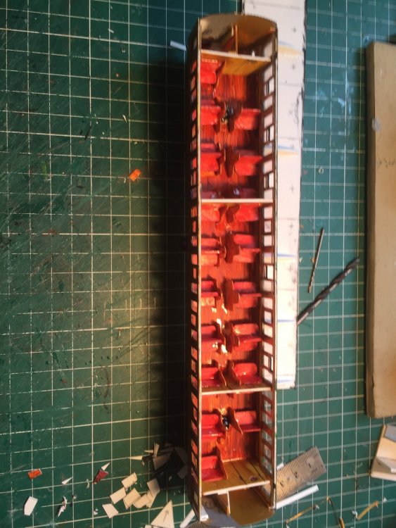 The interior is scratch built but it does raise a question which someone may be able to answer: was there a side corridor running past the luggage/guards section? I have a vague memory of such, from the days when we would walk from one end of the train to the other, to count the number of coaches. I also remember those odd compartment coaches, built in the early/mid 1950s ,which had the toilets in the centre of the coach with the side corridor running on opposite sides from the toilets to the end of the coach ( I know what I mean anyway.....). i have modelled it as shown below. Note that the seats are finished in a sort of maroon colour. An Irish Railfans News from the early 1960s said that maroon upholstery was the CIE standard colour for second/standard class and green for 1st class. This info was culled from the time when the RPSI had a full set of this journal on its website; hopefully this will be restored sometime. Glover