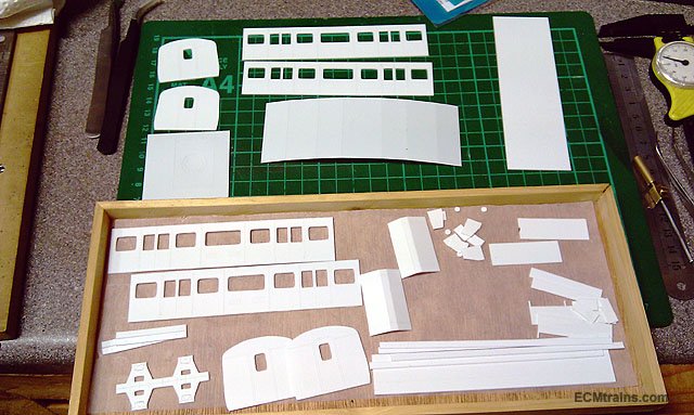 @Galteemore my method;- The polystyrene .5mm ribs are cut out on the Silhouette Cameo cutting machine from a cad drawing, the two outer spars are quadrant shape to give the curve edge on the roof. These are the parts for two vans, cut out and cleaned up. The spars n ribs are glued up- like building a model wing, the ribs are notched to take the spars, and the ribs have a down-stand that notches inside of the coach sides to fix the roof on- one can see this on the bottom photo. The roof covering sheet is cut from .3mm styrene sheet, which is also scored to give the ribbing trim detail on the roof. The roof sheet is stuck down to the central spar first and left to fully dry. Then the edges are turned down over the quadrant, clamped in place and glued. One has to be careful not to use too much glue, too much will melt the styrene roof sheet- it happened on my first attempt! Thats basically it. I built 4 of these tin vans for a client, unfortunately these are the only photos I have of the build, I reckon this was around the time my phone died, followed by the computer back in 2017!! I did make two for myself but never finished them- as John Mayne did another run of his lovely kits, which I bought 2 of- yet to be built...... Eoin