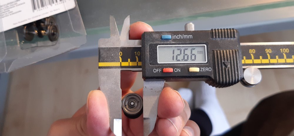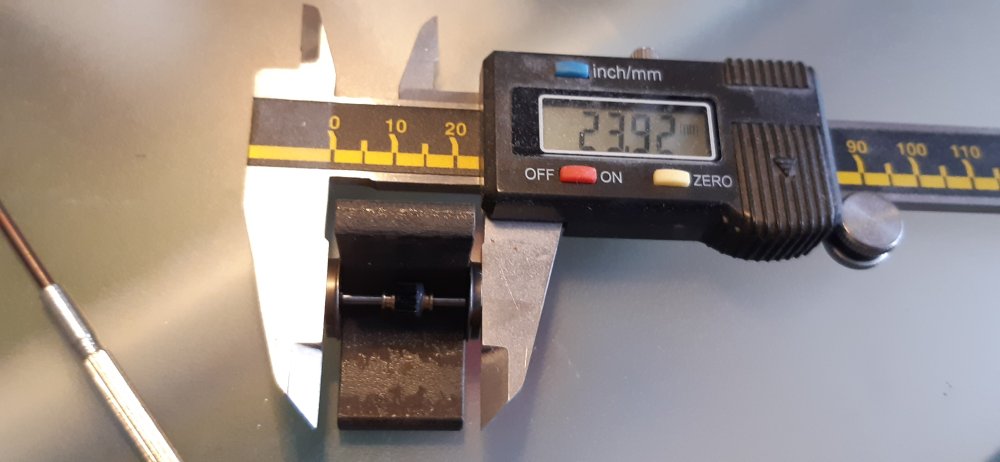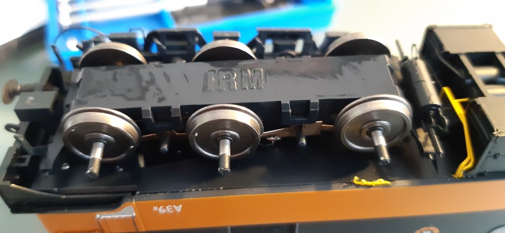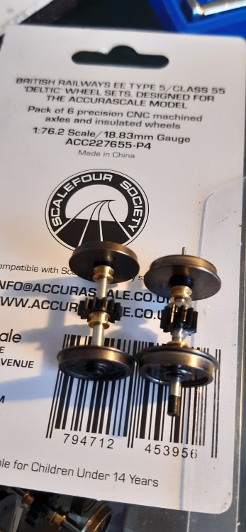 I'd been thinking about the "A" regauge to 21mm (P4 profile) for a while. IRM's wheel diameter comes out at 12.7mm (3'2") and I had thought there was no directly suitable wheel on the market. It turns out that the answer was staring me in the face all the time, because Accurascale's P4 wheel pack for their recent Deltic/Class 55 is practically the same diameter, registering 12.66mm on the calipers. This is undersized for a Deltic (they actually ran on 3'7" wheels - 14.66mm) but Accurascale's compromise actually helps us here. Although the Deltic wheel has two small holes at 180⁰ to each other and a slightly different dish to the front face, it's still eminently usable for this quick 'n dirty job. Since both types of wheel are fully insulated only at the hub, that means there won't be much of a problem with pickup, since the collectors only need to extend to touch the backs of the new wheels. Off with the "A" bogie sideframes: ...exposing the extended axle ends, and then unclip the baseplate: Fish out the leading axle - on A39r, this is the one with nearside speedo drive, so that has a tiny end instead of a rotating cover. Compare with the Deltic wheelset: There's not a lot in it between the "A" and the Deltic: To remove the wheels from their axles, all that's needed is to grip and gently twist each wheel anticlockwise, as if unscrewing a fine-pitch bolt. As long as the wheel is kept straight, no damage to the insulating bush should occur and you should not end up with wobbly wheels. DO NOT remove the brass bearings from the axle. This is what we end up with: As the Haynes Book Of Lies says, "refitting is the reverse of removal" - the Deltic wheels are mounted on the "A" axles, again going carefully, twisting clockwise as you press the wheel along. A decent indication of when to stop is when you see just the merest glint of silver appear in front of the wheel hub. We need to have an Irish back-to-back gauge handy, giving a back-to-back measurement of 19.67mm. These are available from the Scalefour Society Stores and are not terribly priced: Incidentally, you could adjust to 19.87mm back-to-back if working in "dead scale", in the same way that I use 17.87mm for dead scale British standard gauge. The measurement over the outside face of the Deltic rim should come out at around 23.9mm. Now see the difference in gauge: That should provide a suitable spur to finish the others: Now is the time to bend the pickups outwards to match the wider gauge. They must be able to touch the backs of the new wheels: Insert the regauged wheelsets, with the brass bearings clicking into their original places: Clip the bogie baseplate back on, push the outside frames back in, and the job is done: Now repeat all the above for the other bogie: This can be achieved in about 40 minutes, plus up to thirty quid for the Accurascale Deltic P4 pack (cheaper on eBay if you play your cards right). End result just looks right:- 40 replies