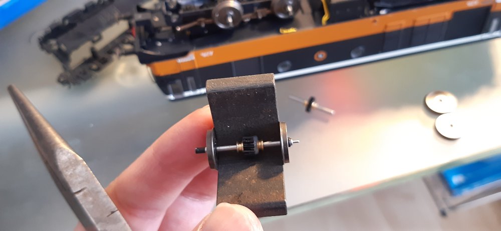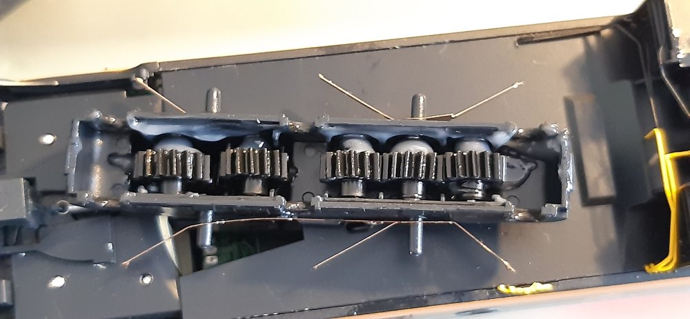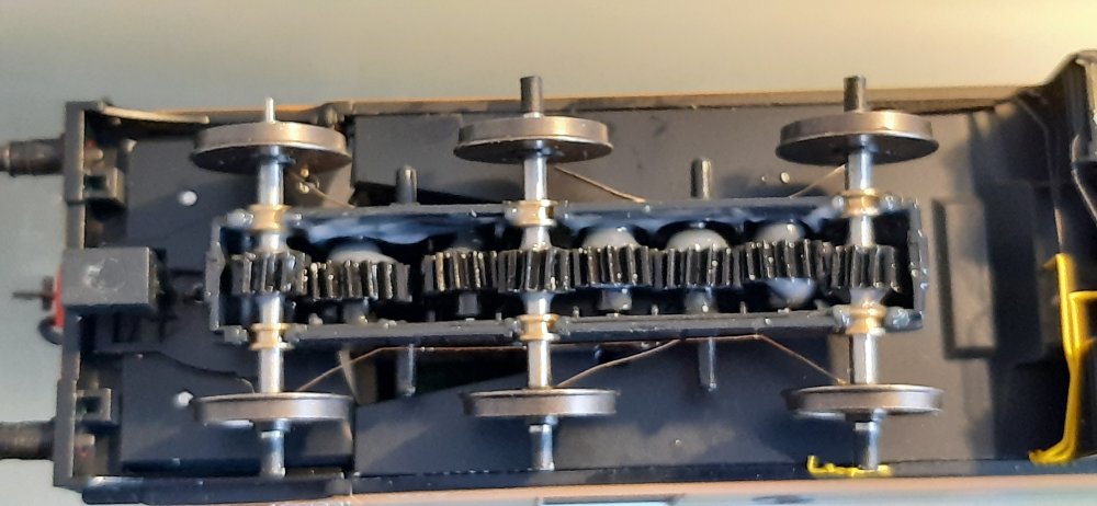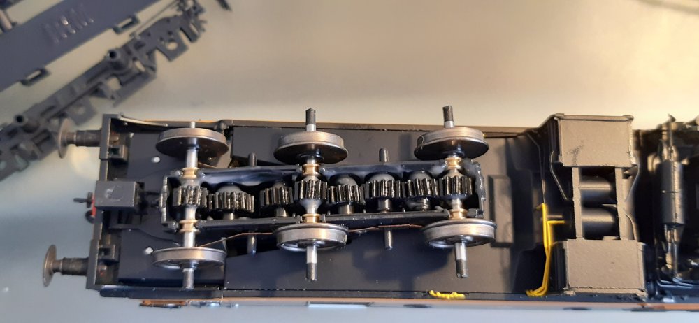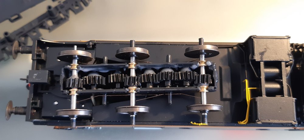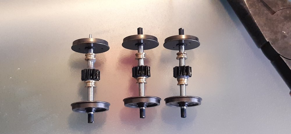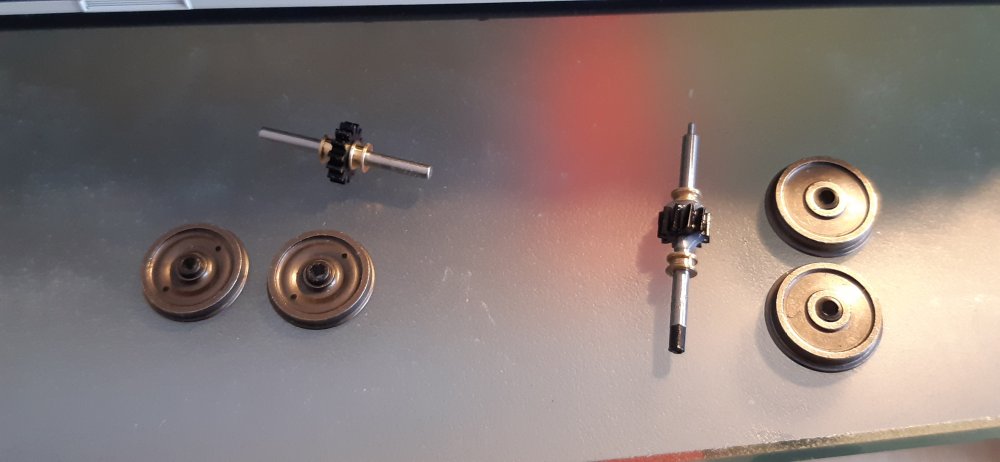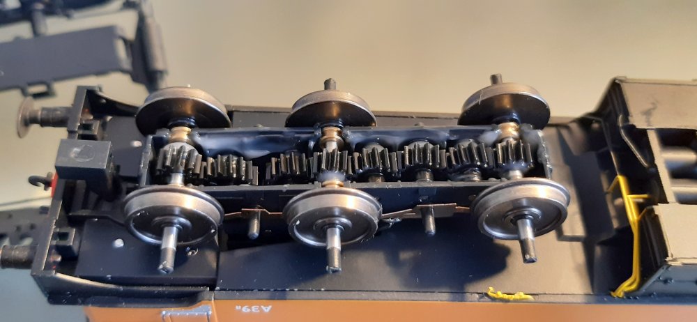 Forgot to conclude: the above leaves you with twelve surplus "A" wheels, which make ideal practice pieces if you're learning how to use a lathe. Turn them to P4 profile so you have spares. Also, six spare P4 axles with Deltic gears on them... ....and an invalidated IRM warranty. -