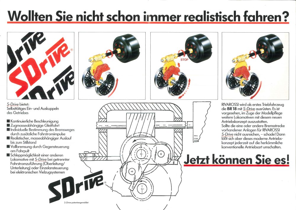 ....there were quite a few attempts to replicate acceleration, coasting and braking via mechanical means. Some of us will be familiar with DynaDrive, an expensive system involving miniature centrifugal cutches, indecently-big flywheels, reduction gear cradles, driveshafts and some very efficient bevel-and-spur final drives to replicate the mass and inertia of the real thing. However, there was another ingeniously brave attempt that was produced by Rivarossi some time in the 1980s. They called it "S-Drive". I didn't even know it existed until earlier this year, when, during one of those distracted Google searches that I sometimes get trapped in, the attached advert came up. "S-Drive" seems to have been quite simple in the sense that a standard motor drove a worm and wormwheel. However, butted-up against that was a cradle carrying three spur gears. Running the motor and worm stage one way caused the cradle to flip in one direction and engage with a final drive gear, allowing the model to move. Whilst on the move, if you cut the power, the motor would stop and the cradle would disengage so that the model would coast to a halt. Applying power the other way caused the cradle to flip the other way, engaging the final drive and allowing the model to reverse. Again, cutting power to the motor would disengage the cradle and the model would coast in reverse. If you got your braking distances a bit wrong, you were free to apply power in either direction. Turns out the system was so successful that Rivarossi only fitted it to one model: their ex-Bavarian S3/6 Pacific. It doesn't look like they tried it on any other. The advert suggests it was built using plastic spur gears; this may have been more to do with cost than anything else. Anyhow, for those not entirely familiar with German, their advert is roughly translated as follows: "Haven't you always wanted to drive realistically? S-Drive offers automatic engagement and disengagement of the gearbox - Continuous acceleration - Traction-dependent sliding travel - Individual determination of the braking distance through additional traction current pulses - Realistic, mass-dependent coasting to a standstill - Full braking by counter-control on the driving console - Possibility of towing another locomotive with S-Drive in case of separate traction current supply (overhead contact line / outside contact line) or individual control with electronic multi-train systems The Br.18 will be the first locomotive to be equipped with S-Drive by Rivarossi. It is planned to equip further locomotives with this new drive concept in the course of the model update. Should one or the other brake sections of existing layouts not be sufficient for Rivarossi S-Drive - too bad! But then this modern drive concept can be switched over to the conventional type of drive at any time. S-Drive. Now you can!" Nowadays, there is DCC and almost everyone who gets used to that takes all the clever things it can do for granted. But for those of us who find DCC a bit beyond the pale, the mechanical methods are still out there and could still be messed with.