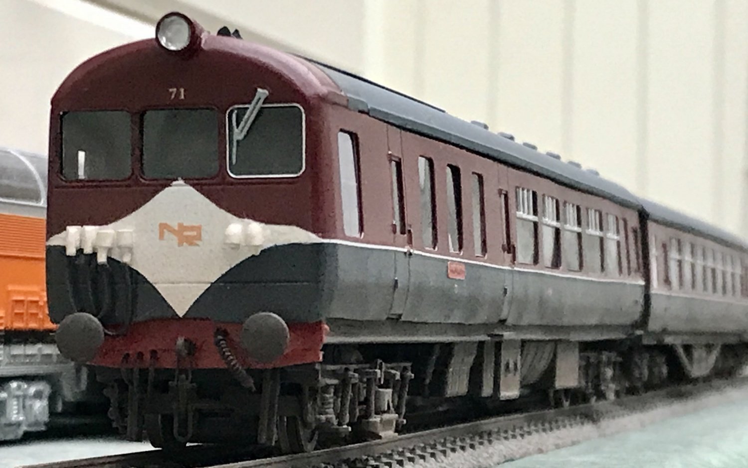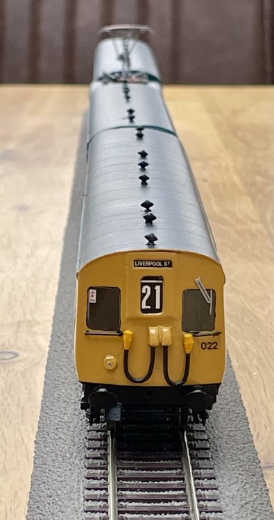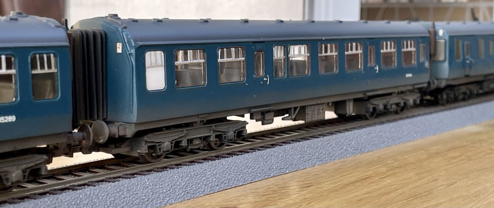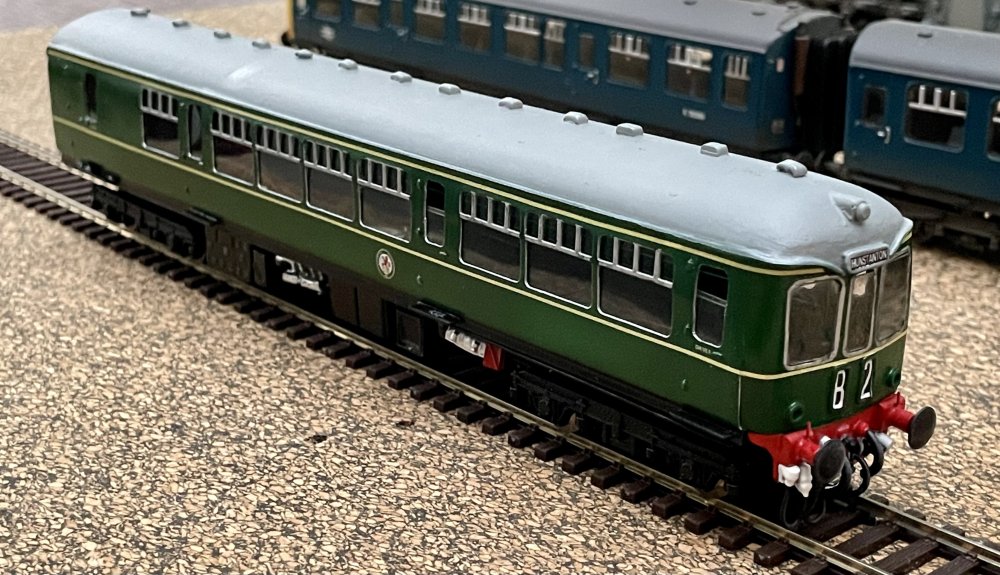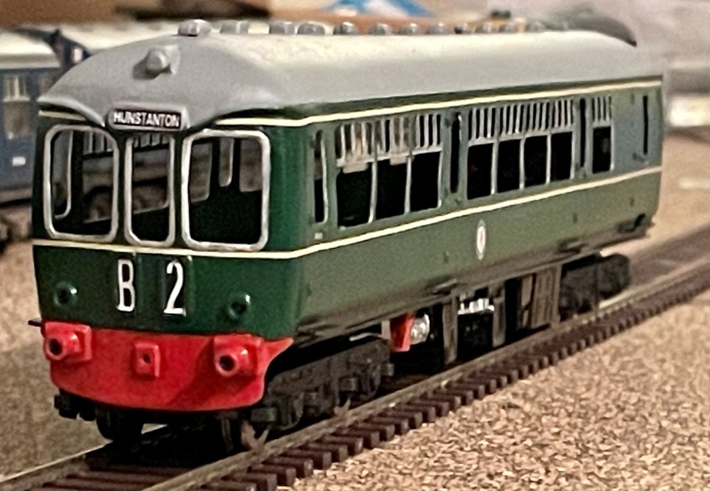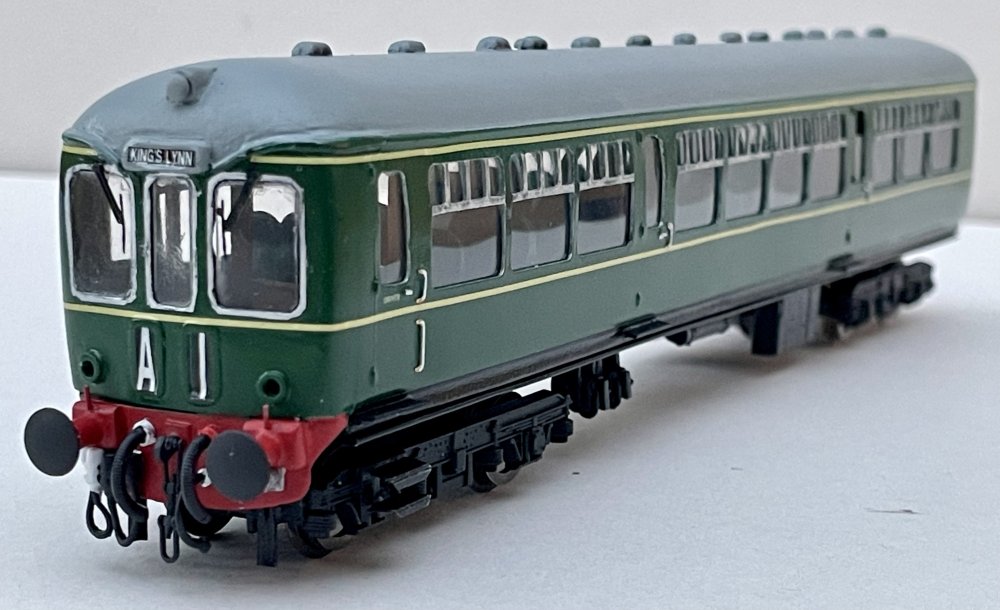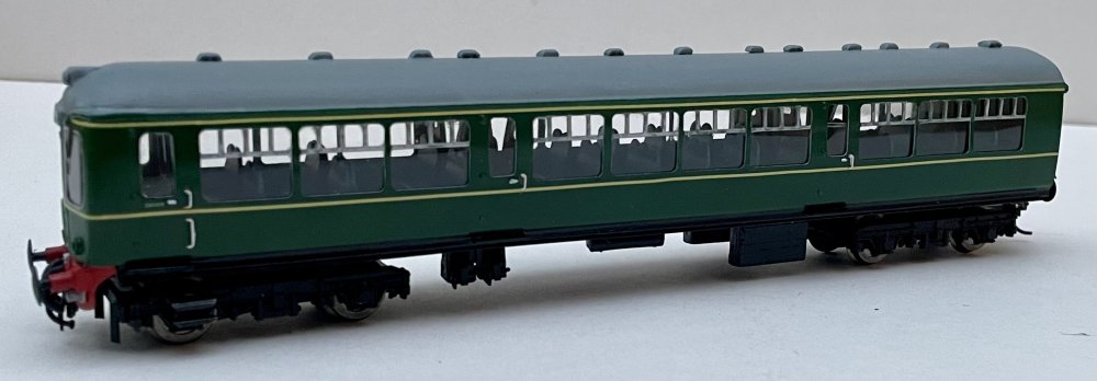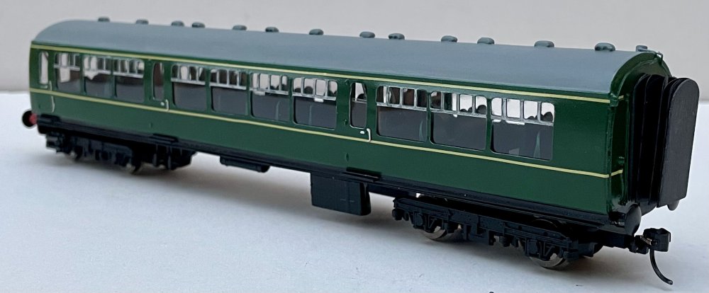 Much modified Hornby model. Tumblehome smoothed to remove the angular line of the original moulding. SEF flush glazing fitted. Craftsman DMU buffers and beam details added. Complete repaint. Bachmann DMU motor and bogies fitted to power car. Cheers Darius