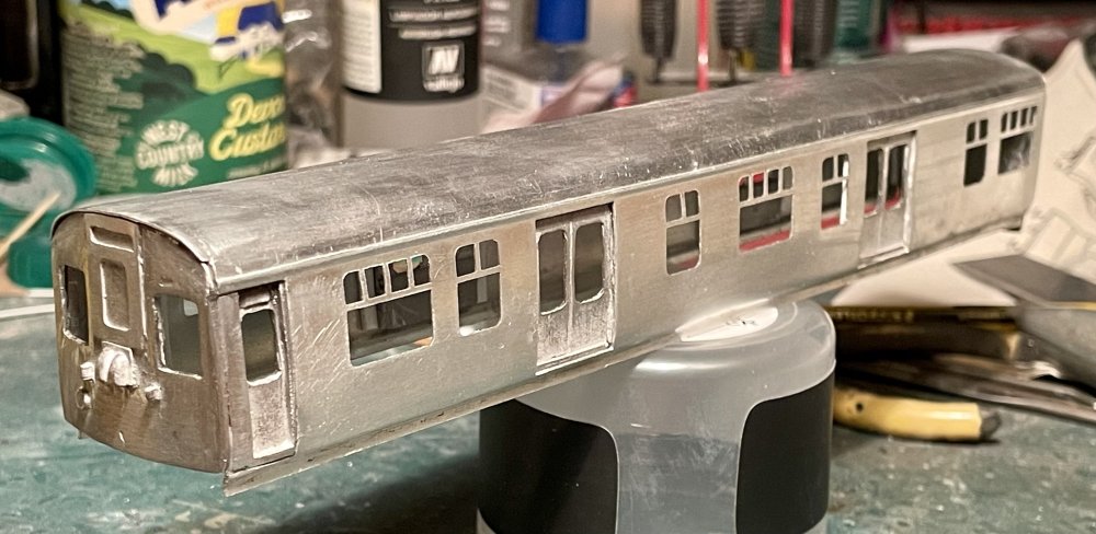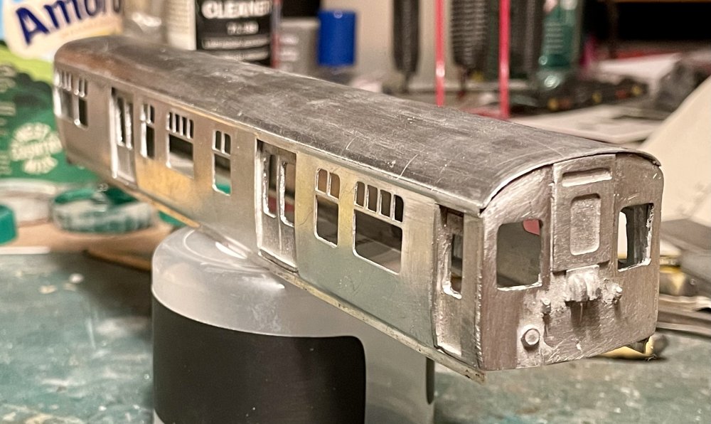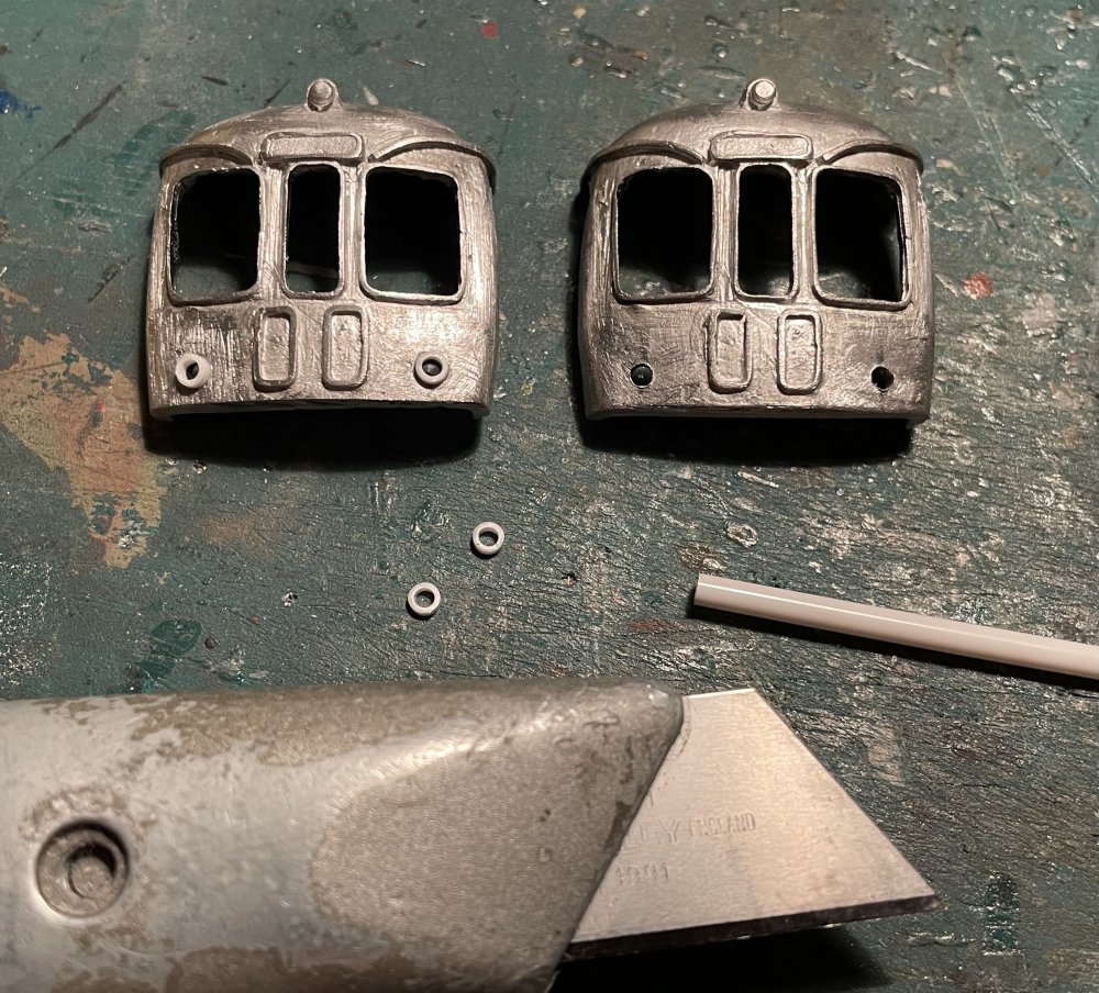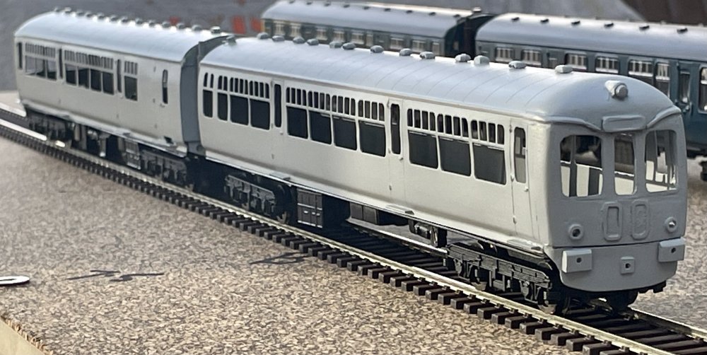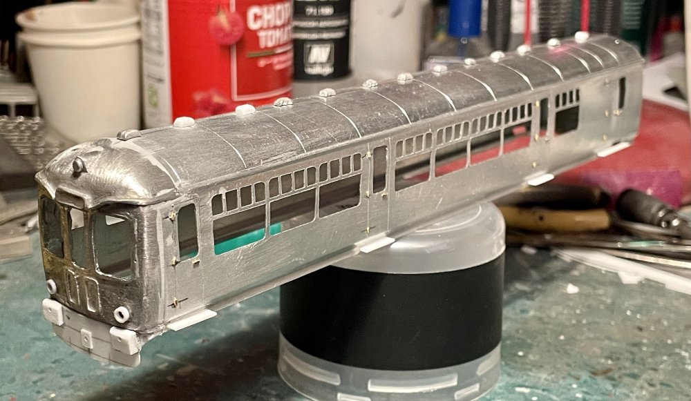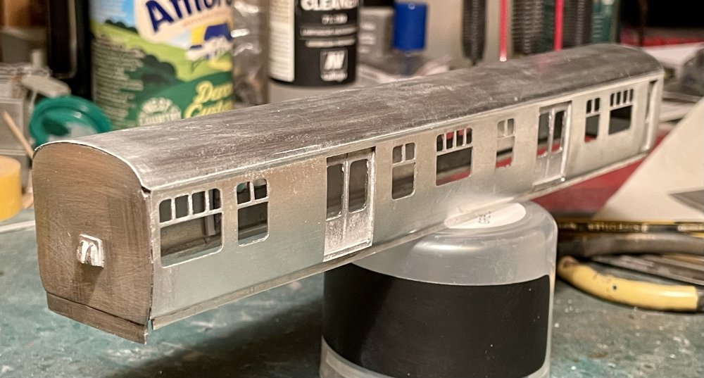 Coach bodies primed. Brass wire handrails and door operating buttons fitted. Cheers Darius