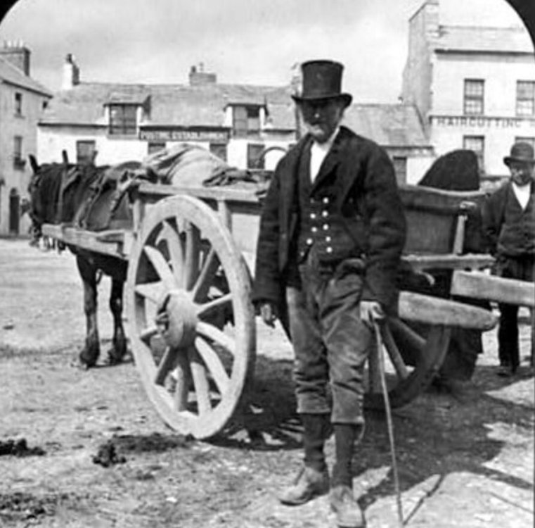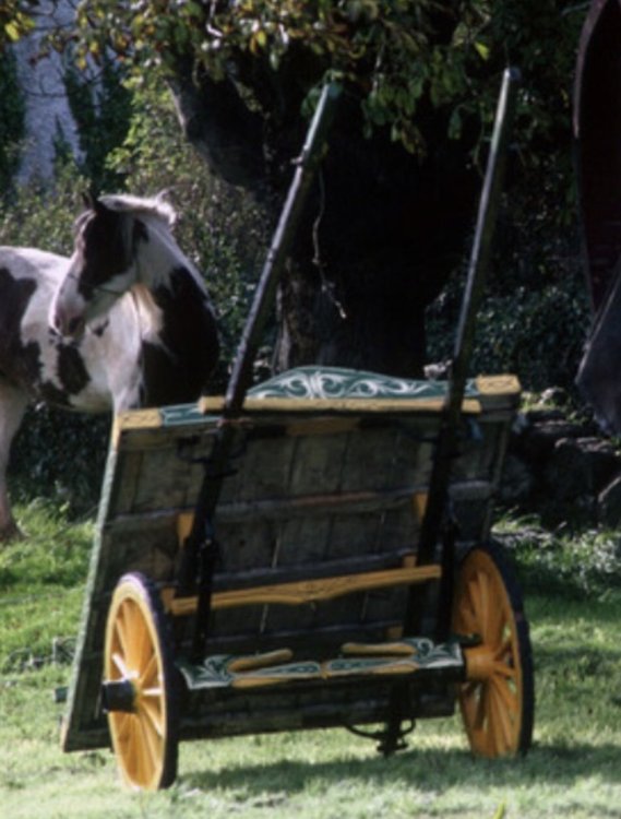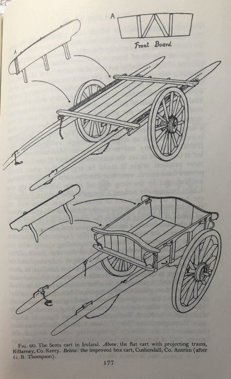 Hi Colin and Martin, I’ve taken a long time to try and respond and I apologize but there was one book I had that I just couldn’t find until yesterday and I needed it for this. So here are a bunch of photos I’ve collected over time because I’ve been interested in this for modeling purposes too. I tried to get them in some kind of coherent order for you but didn’t quite make is But as you can see it looks like there was a basic flat platform with 2 uniquely carved beams. But then it looks like you could add side boards and or a back board as well as needed it. My layout is in Kerry and there are different breeds of cows but the one most unique to Kerry are...Kerry Cattle (https://en.m.wikipedia.org/wiki/Kerry_cattle) There are Holsteins and all that but for my cattle drive I just used black cows because Kerry Cattle are black. I’ve used Langley models for a cart they have one that if you leave the front board off is pretty close to the Irish version. I’d like to try that blue one below from dart castings. Just have to modify the beams. The last one from Shipyard I just found I’ve never heard of them before but again it looks pretty close with the front removed. l hope these pics, as late as they are, help.