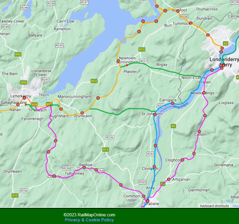 I'd like to take a look at the full report, but who knows when that will be released. Out of what that Journal article highlighted, I wonder how they'd go about building the Derry-Letterkenny line. As a thought exercise, I'll take a bit of a look at things. Using RailMapOnline as a reference, in terms of getting to Letterkenny the Lough Swilly route was a bit roundabout, and Graving Dock and the route out of Derry from there is long gone. There doesn't seem to be too much blocking the way out of Foyle Road, but building from Waterside and through Victoria Road might be better for through trains, though the Foyle would need to be crossed somehow. I've also heard rumours about the Derry Road, and the GNR route to Strabane is less obstructed. The approach into Letterkenny is now the N13 and the station itself is now a Penneys. The nearby Donegal approach is less built on, but it still gets blocked nearing the town. I drew two routes on the map, coloured green: one via Newtowncunningham (population 1,000) and a more direct route. There may be factors I may be missing (i wouldn't know how the Google altitude highlights translate to gradients, for example.) As for the rest of the things mentioned, seeing Athenry-Claremorris and Waterford-Rosslare come up is good, and the Midelton-Youghal line shouldn't have been turned into a greenway (I'd add Mullingar-Athlone to that too, though I appreciate that Tullamore is a larger town than Moate.) Dublin Airport really should have a proper link to the national railway network, and anything after that would basically devolve into pipe dreams. I dedicated too much space in my own submission to the review to pipe dreams. -